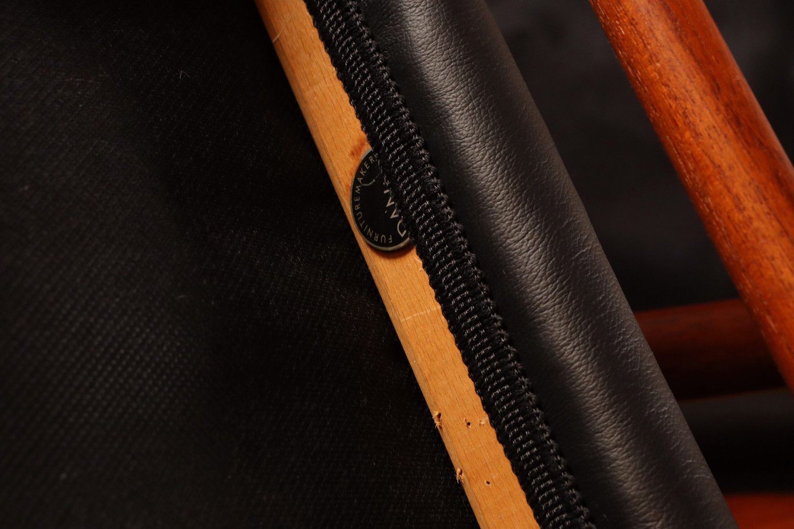 Very good, vintage condition – frames have been conservatively refinished and foam and black leather have been replaced. Only light wear remains to teak, as shown (a couple of light scuffs and spots).