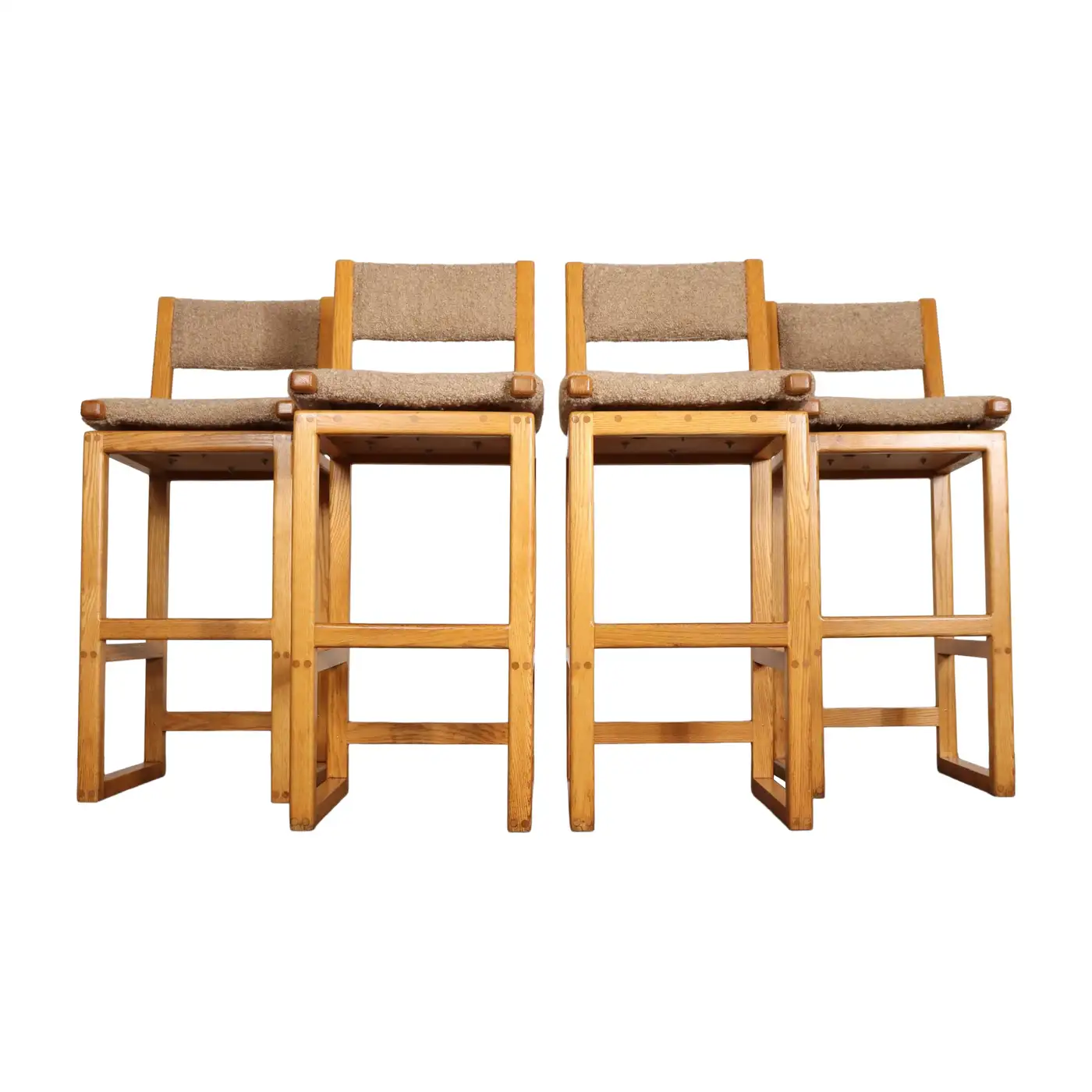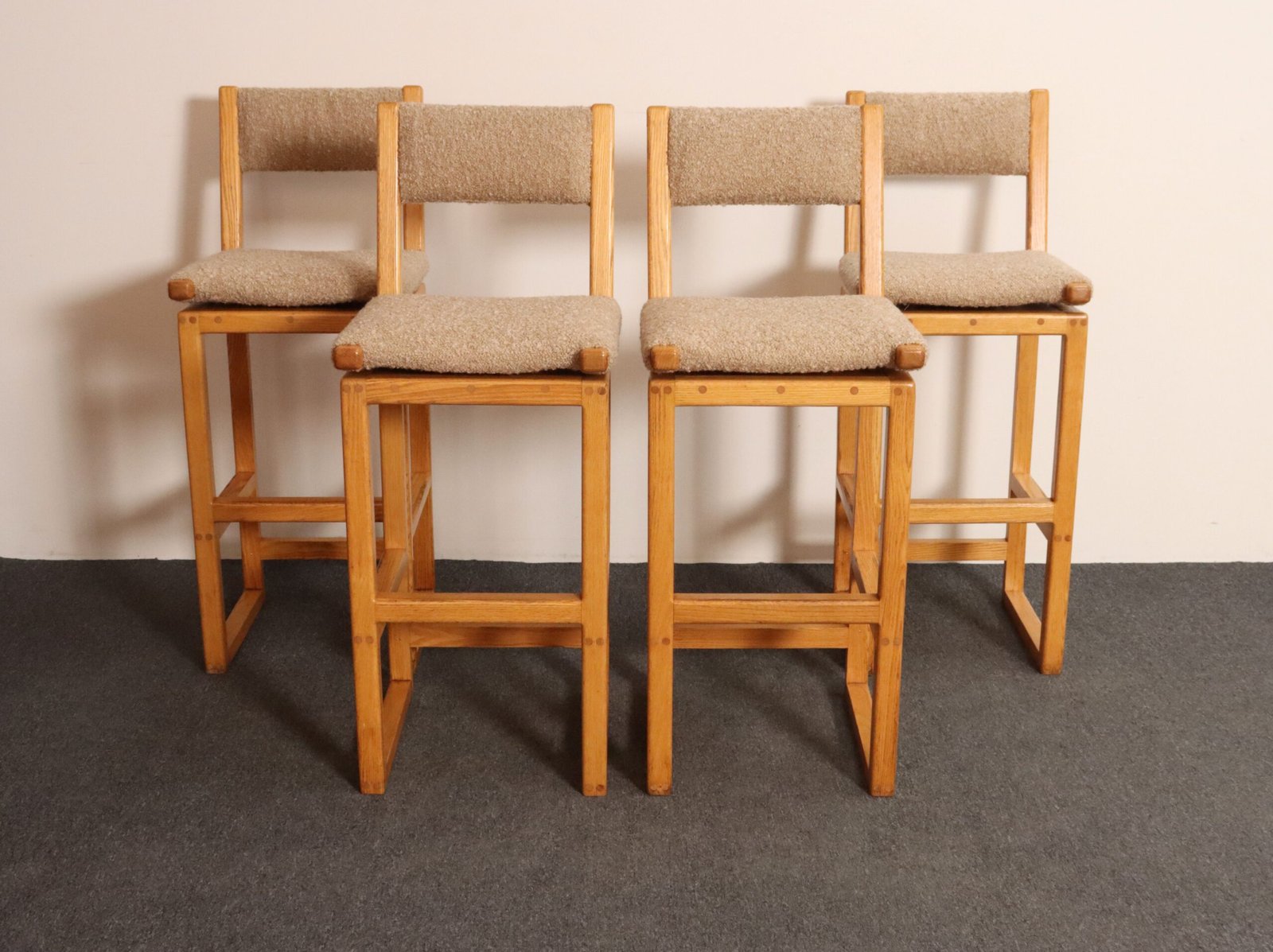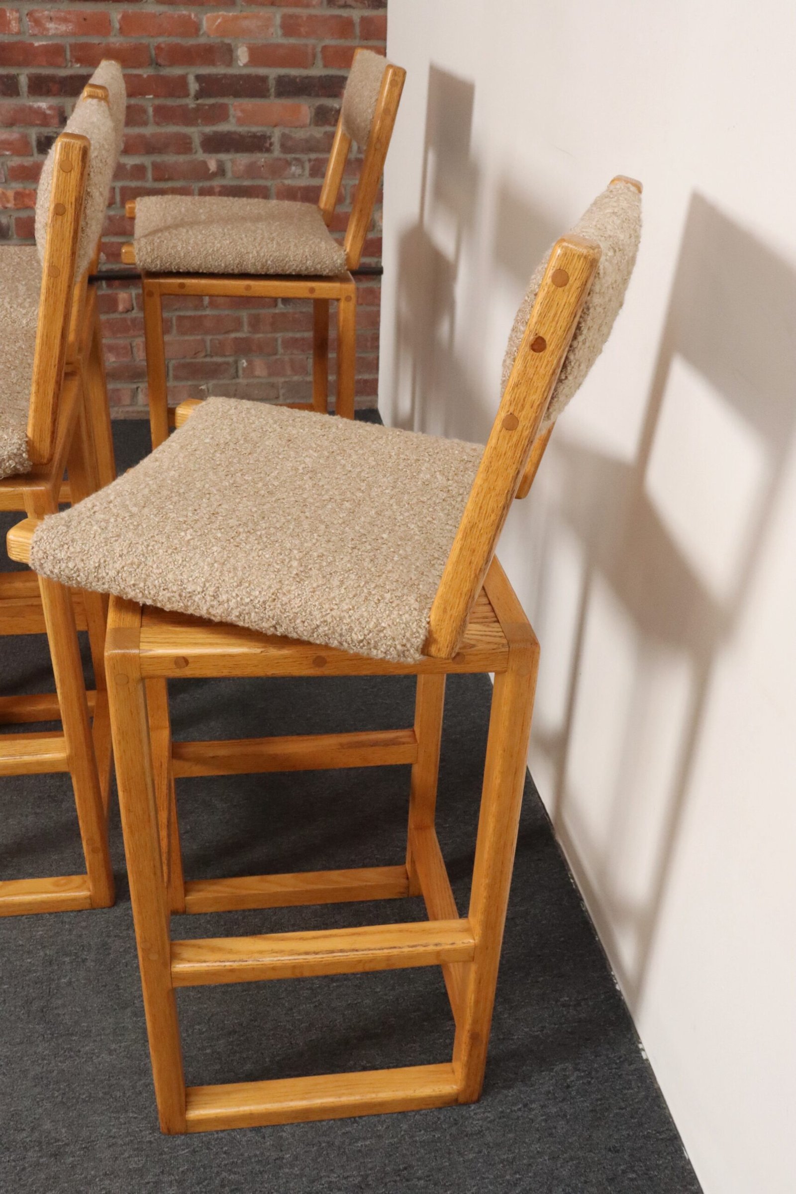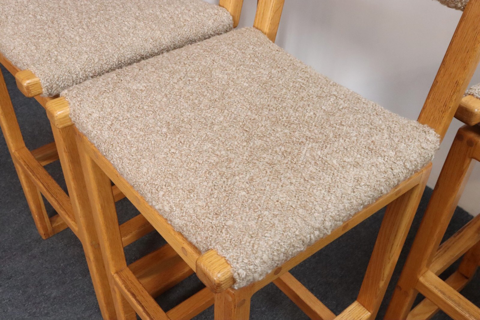 Durable, functional, and stylish set of four bar stools in oak with tawny bouclé seats and back rests (ca. 1980s, USA).