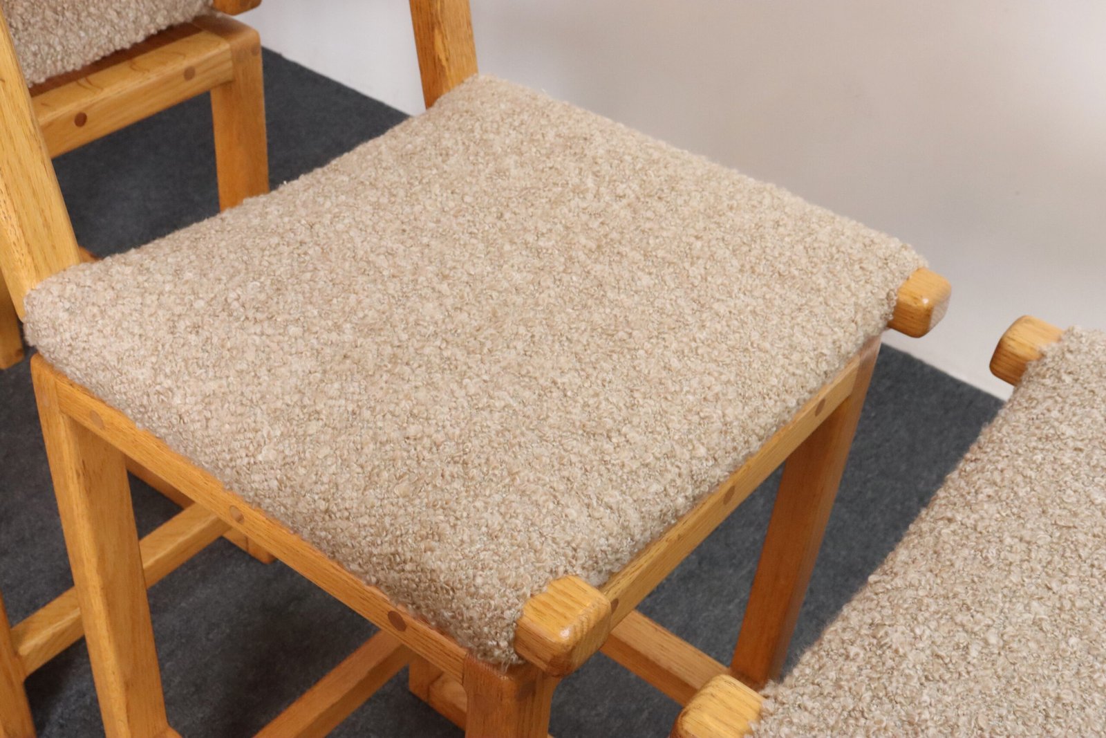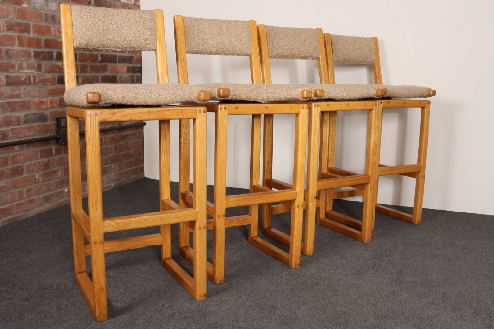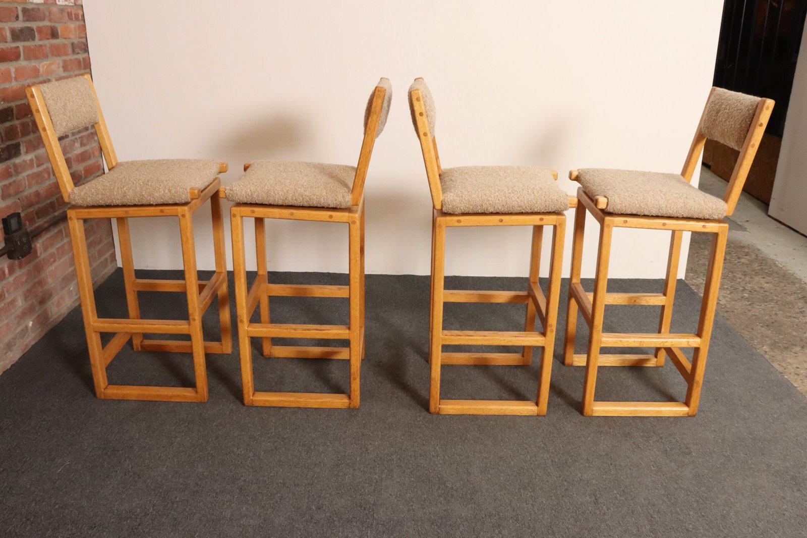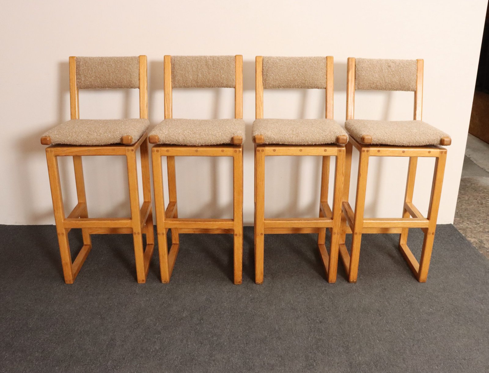 Durable, functional, and stylish set of four bar stools in oak with tawny bouclé seats and back rests (ca. 1980s, USA).