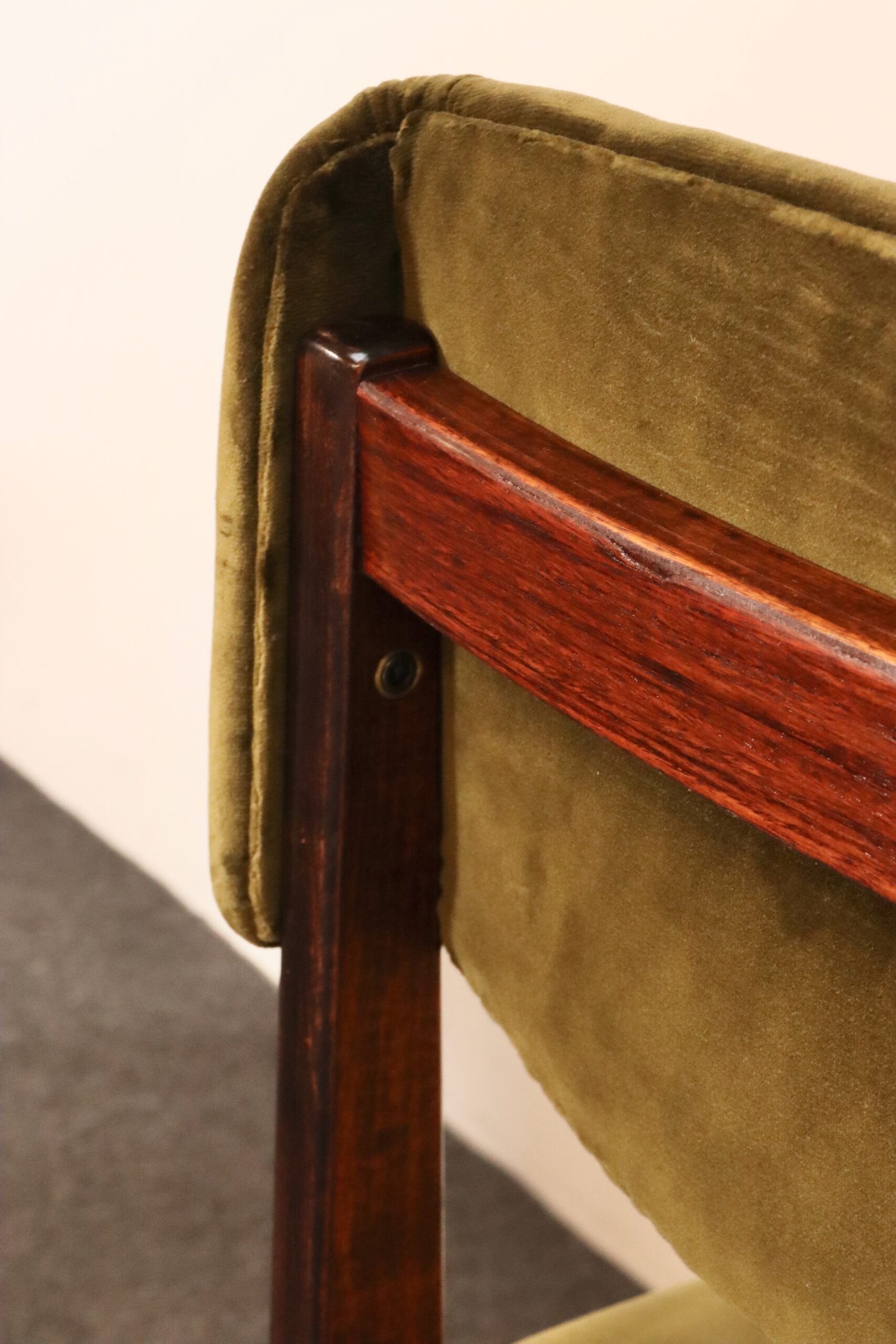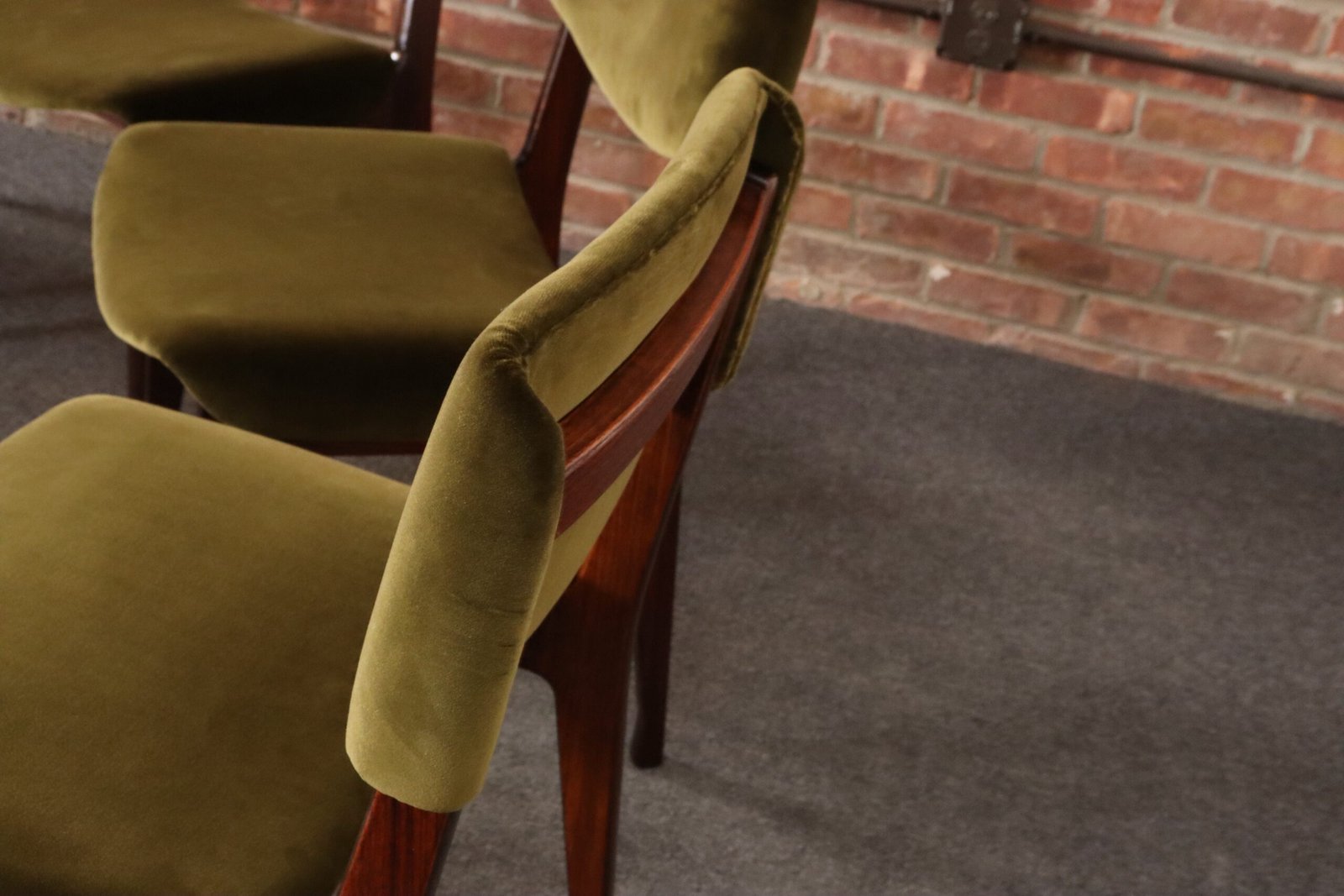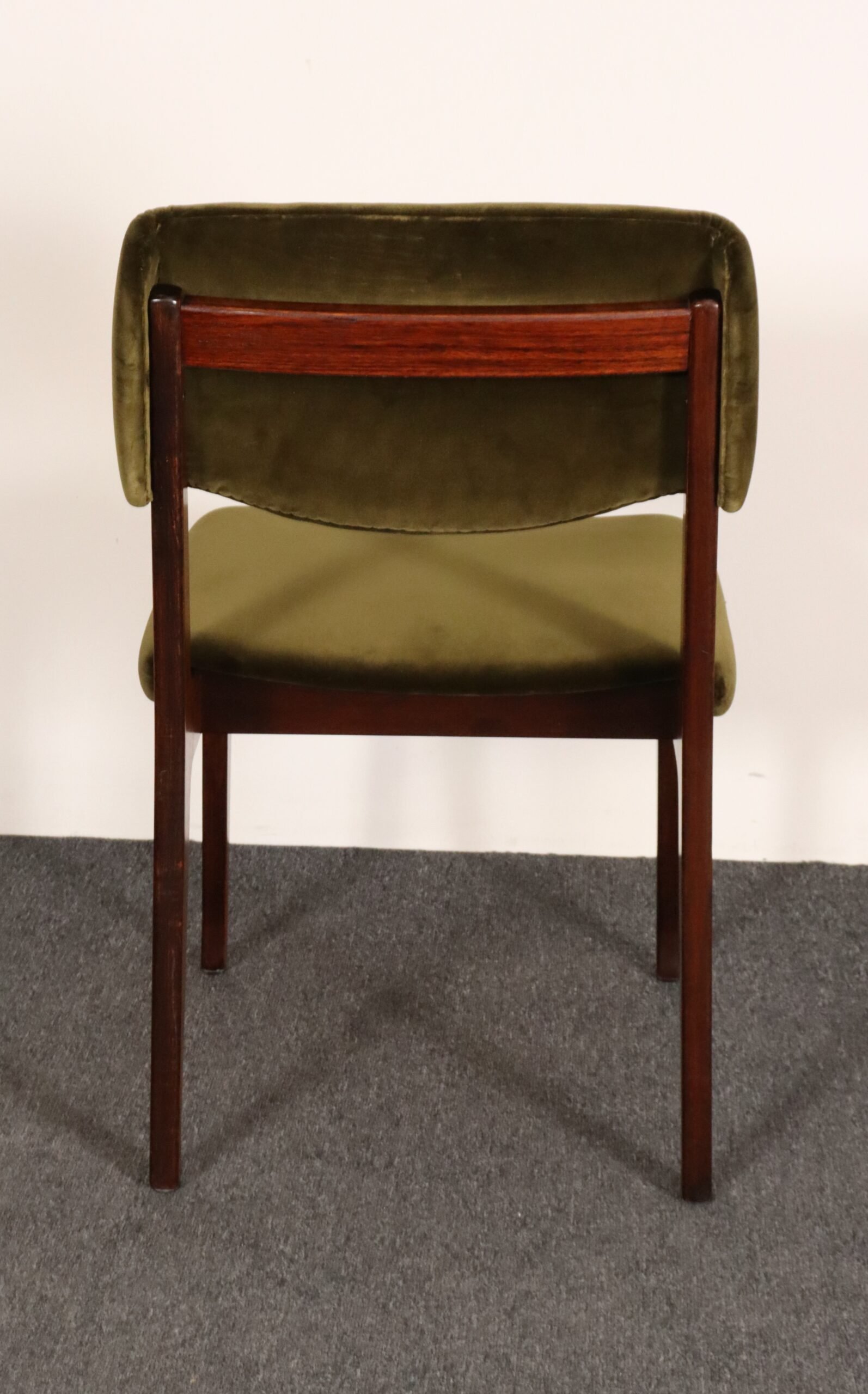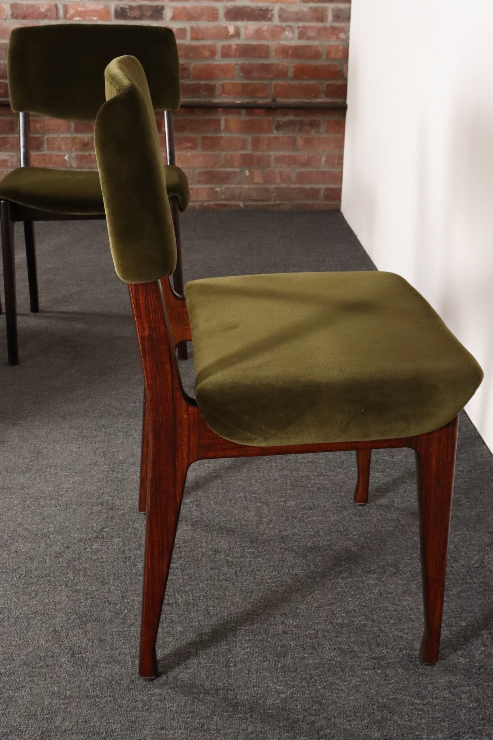 The olive green velvet and foam have been replaced; the rosewood has been conservatively refinished with light nicks/wear remaining. All chairs retain the original brass hardware which connect the seats and backrests to the frame.