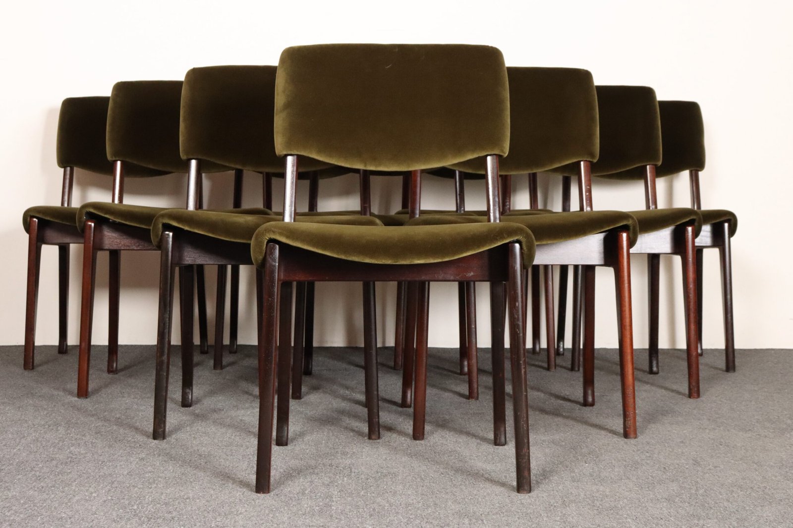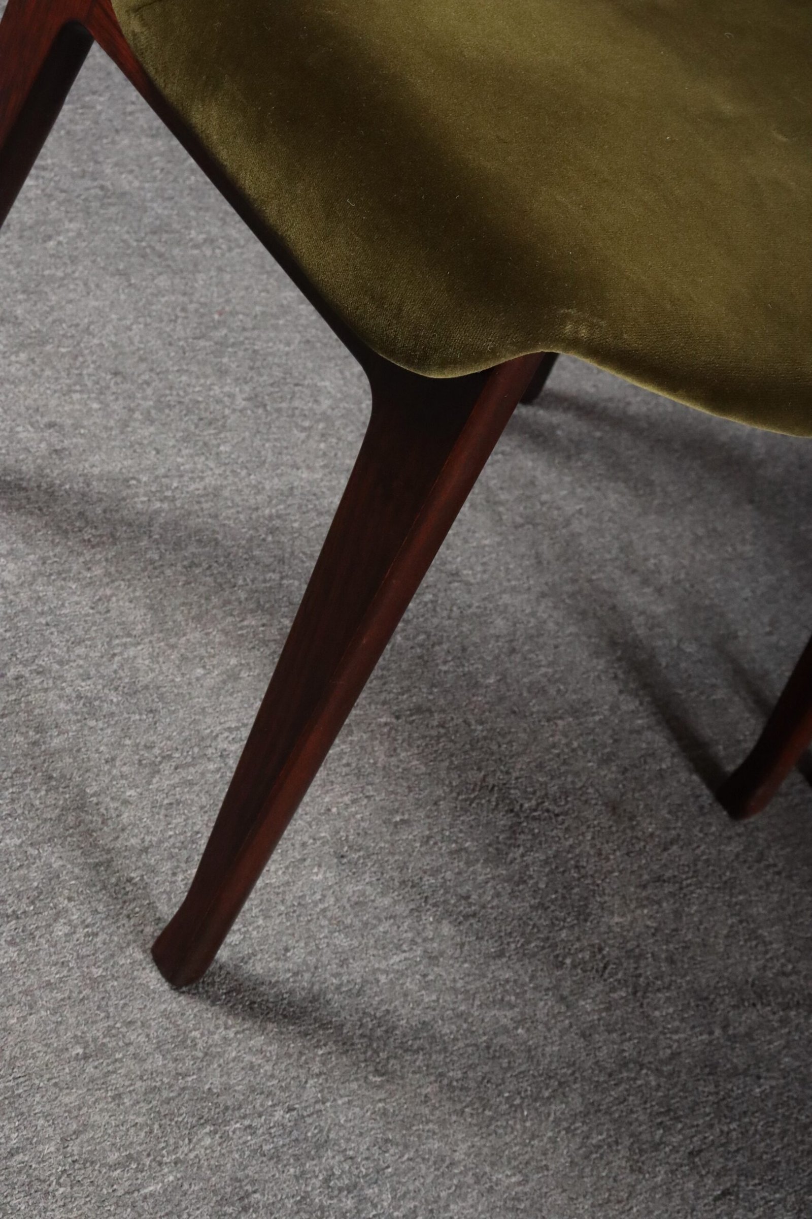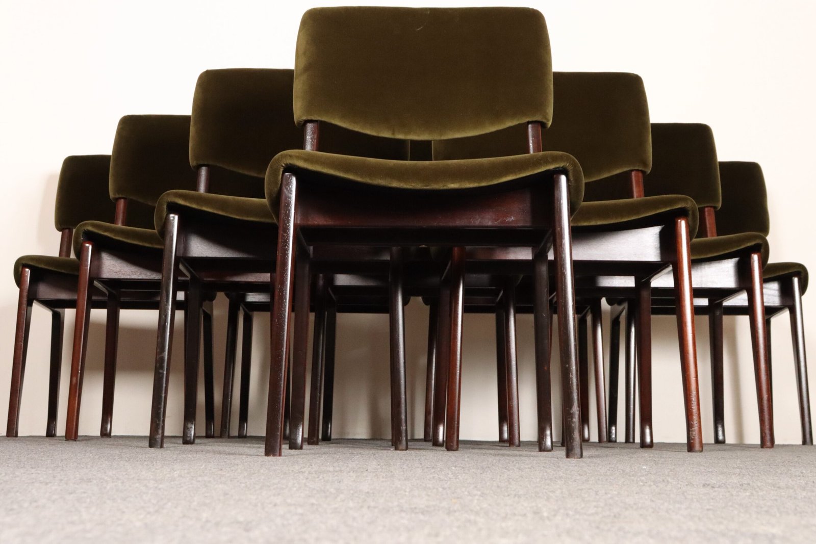 The olive green velvet and foam have been replaced; the rosewood has been conservatively refinished with light nicks/wear remaining. All chairs retain the original brass hardware which connect the seats and backrests to the frame.