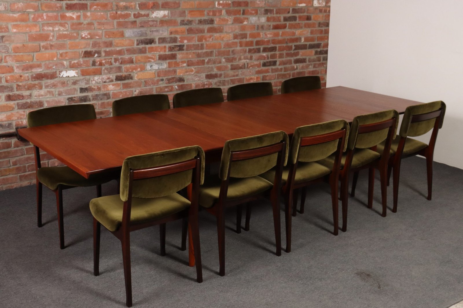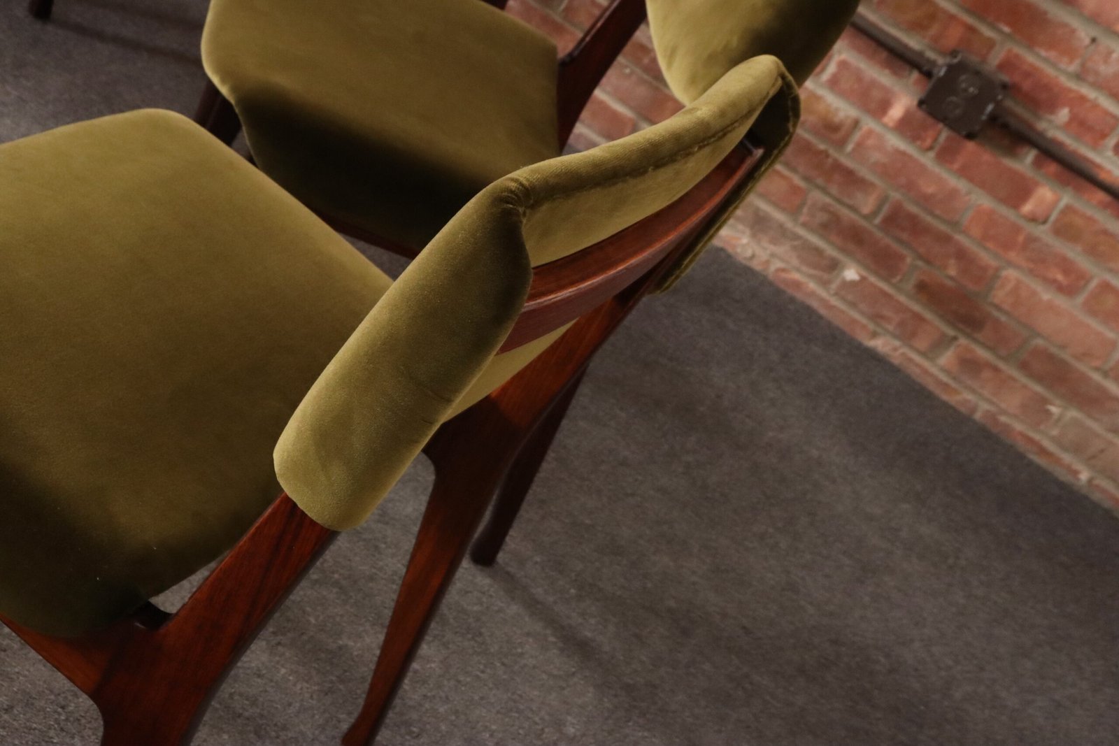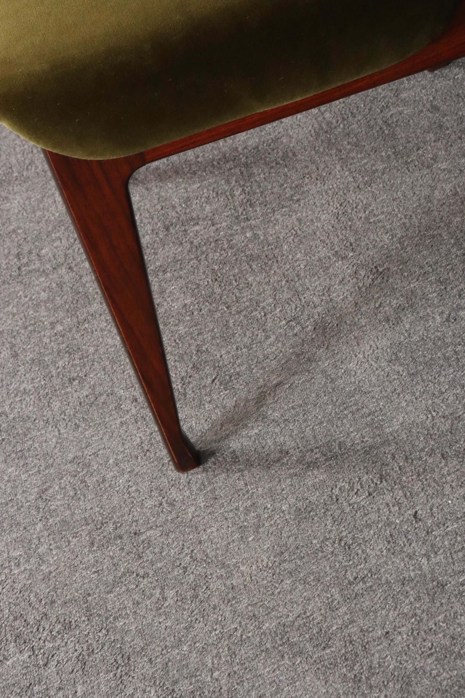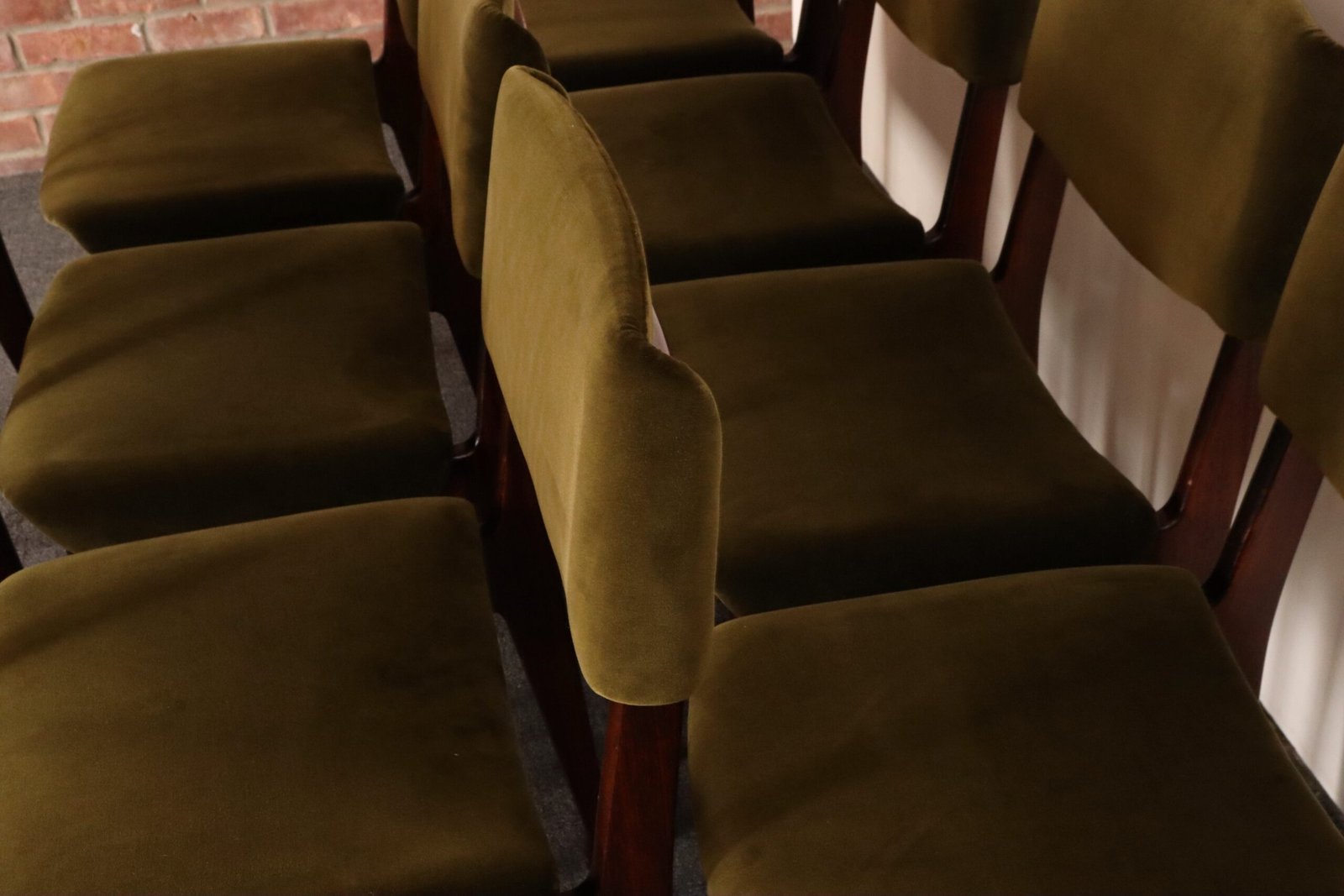 The olive green velvet and foam have been replaced; the rosewood has been conservatively refinished with light nicks/wear remaining. All chairs retain the original brass hardware which connect the seats and backrests to the frame.