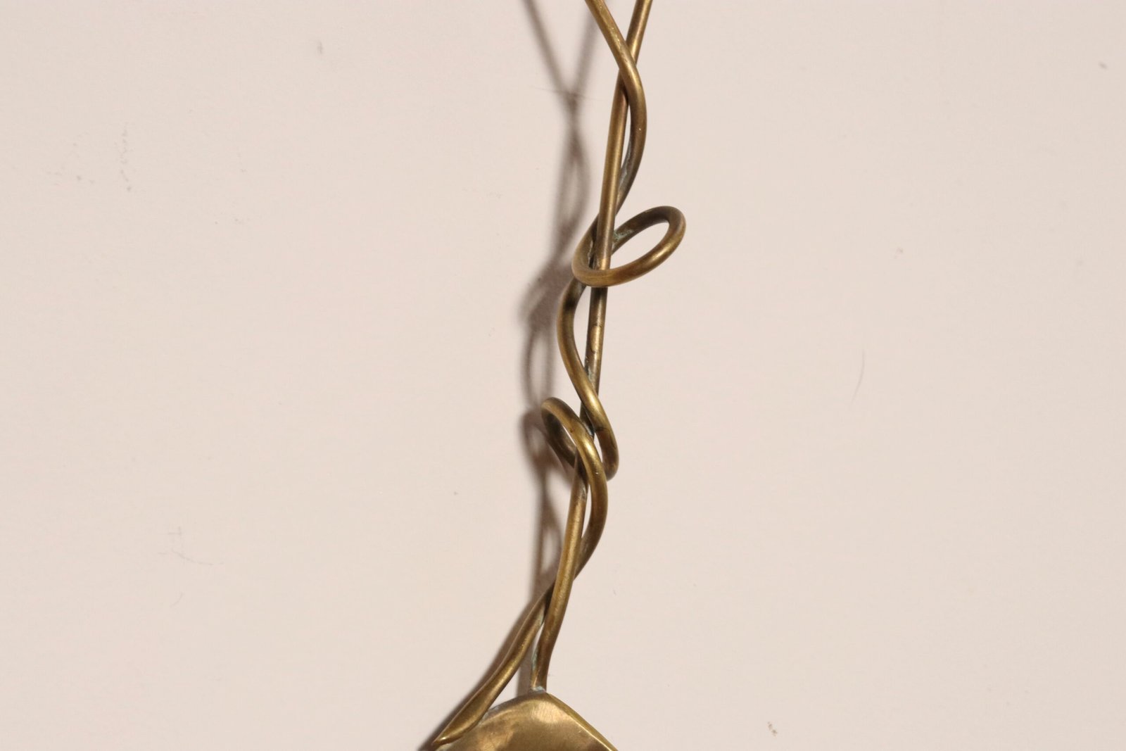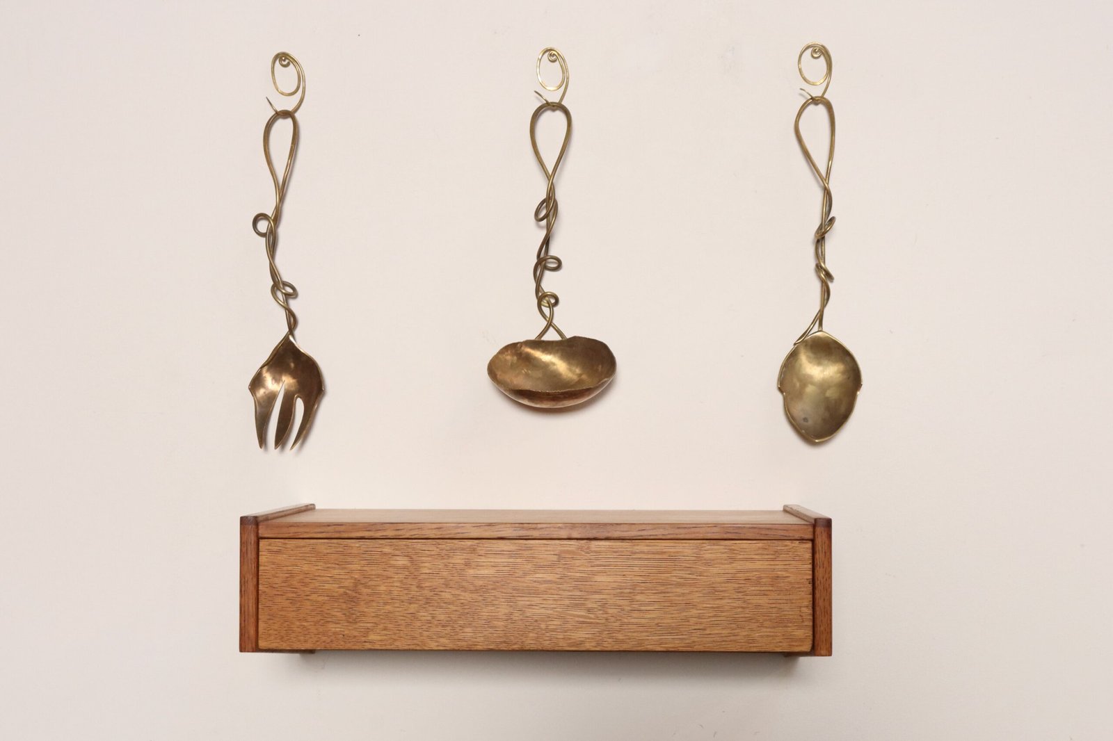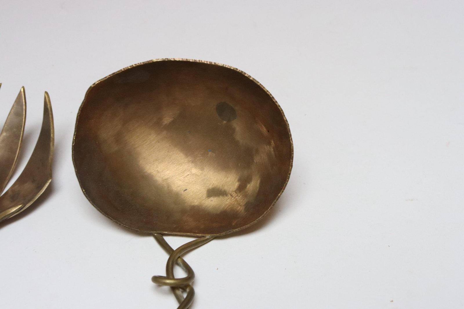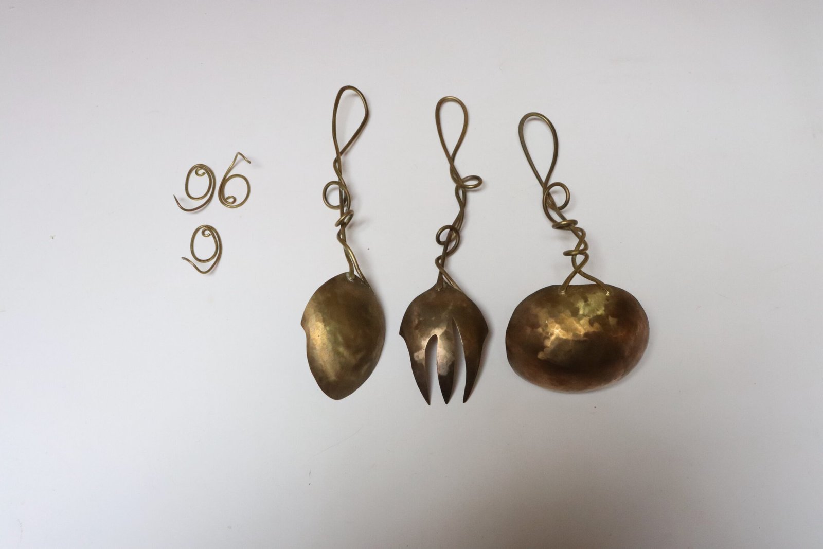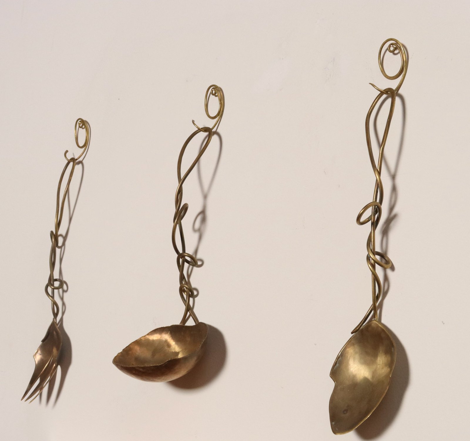 Brutalist-style brass serving pieces including ladle, spoon, and fork (ca. 1970s, likely Austrian).