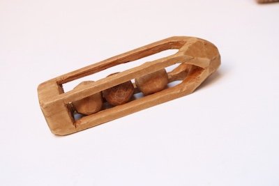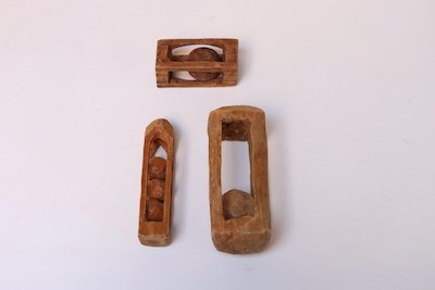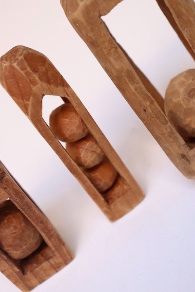 Set of three diminutive ‘ball in cage’ whimsy sculptures, all hand-carved/whittled from one continuous piece of wood (ca. 1930s, USA).