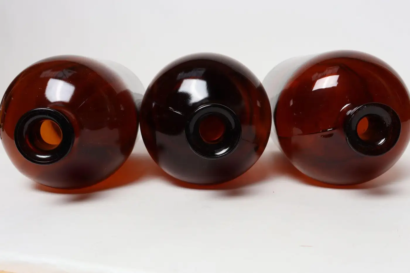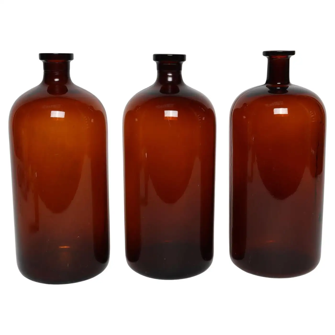 Set of three vintage American amber glass apothecary/medicine bottles known as “Druggist’s Packing Bottles” coined by the Illinois Glass Company, an early producer in the US of these particular bottles.