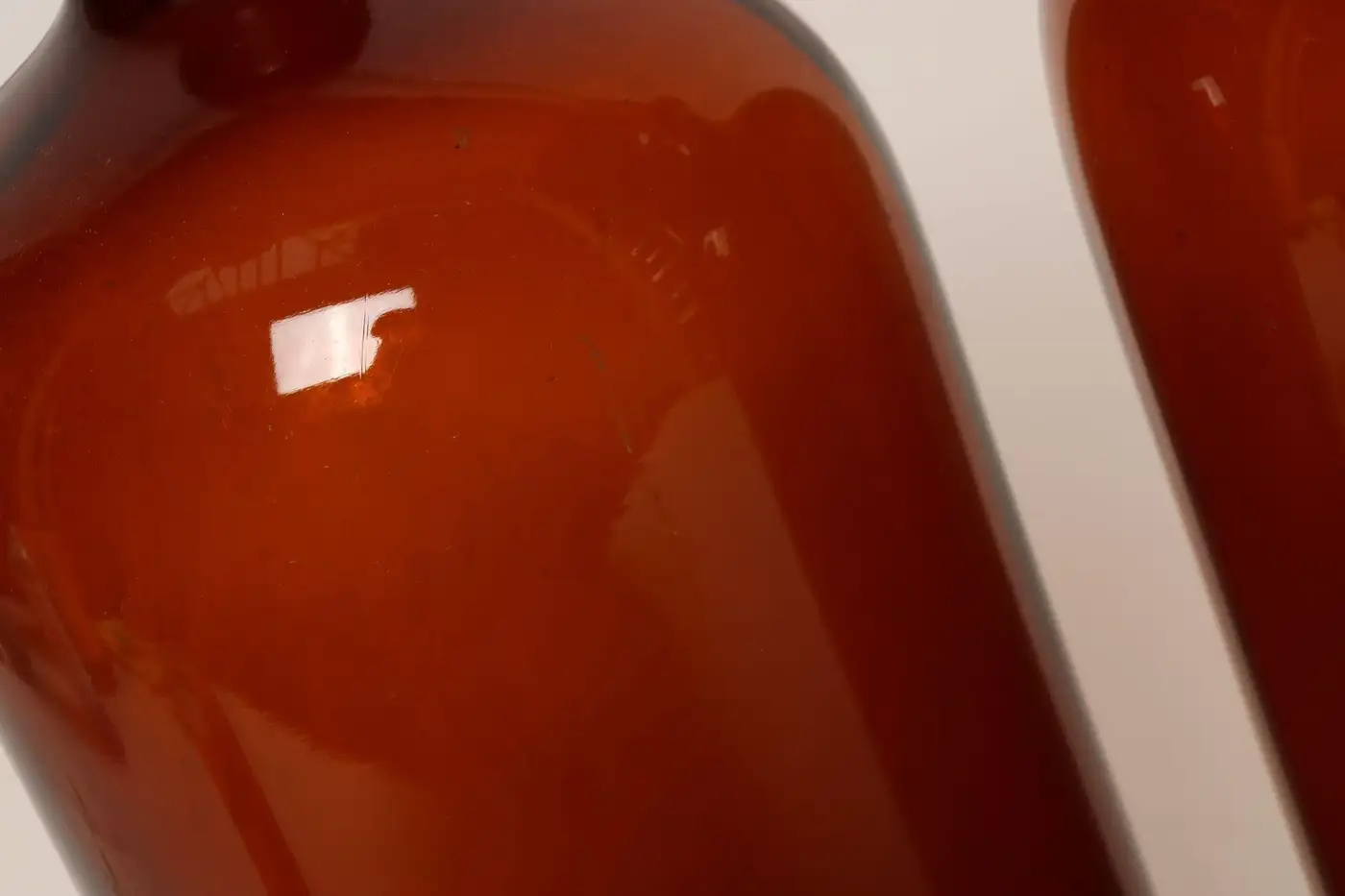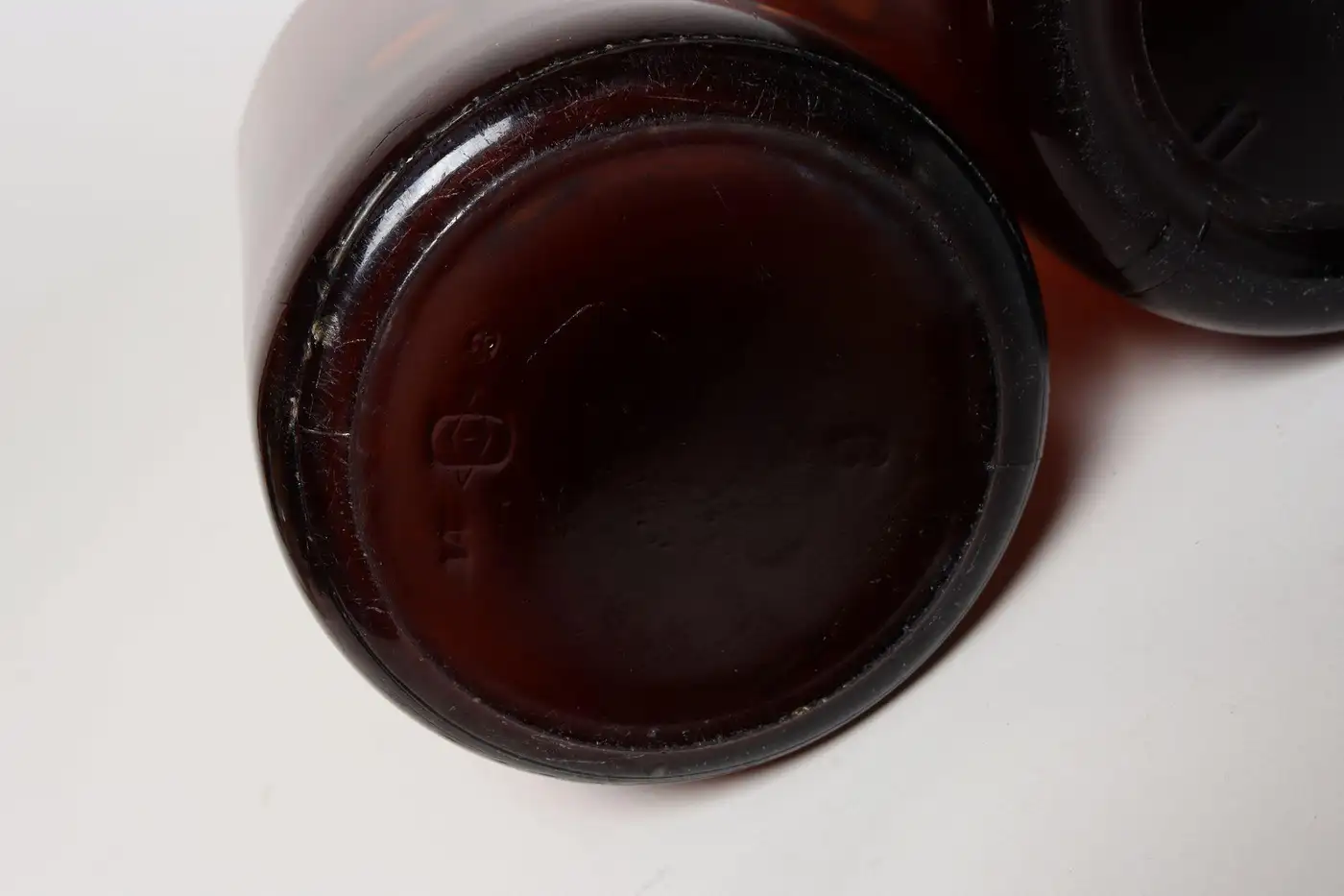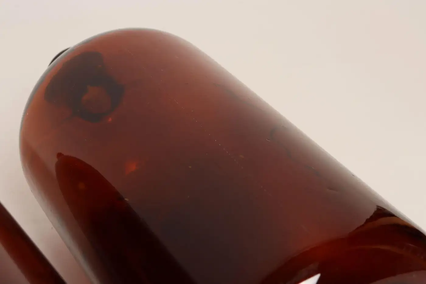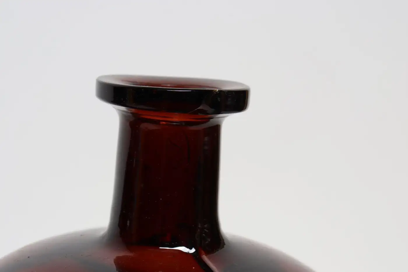 Composed of ‘blown-to-mold’ glass, a method accepted as ‘hand-blowing’, exhibiting a smattering of bubbles within the glass itself (molds were incorporated in manufacturing and hand-finished). Further, amber glass was used to protect light-sensitive materials.