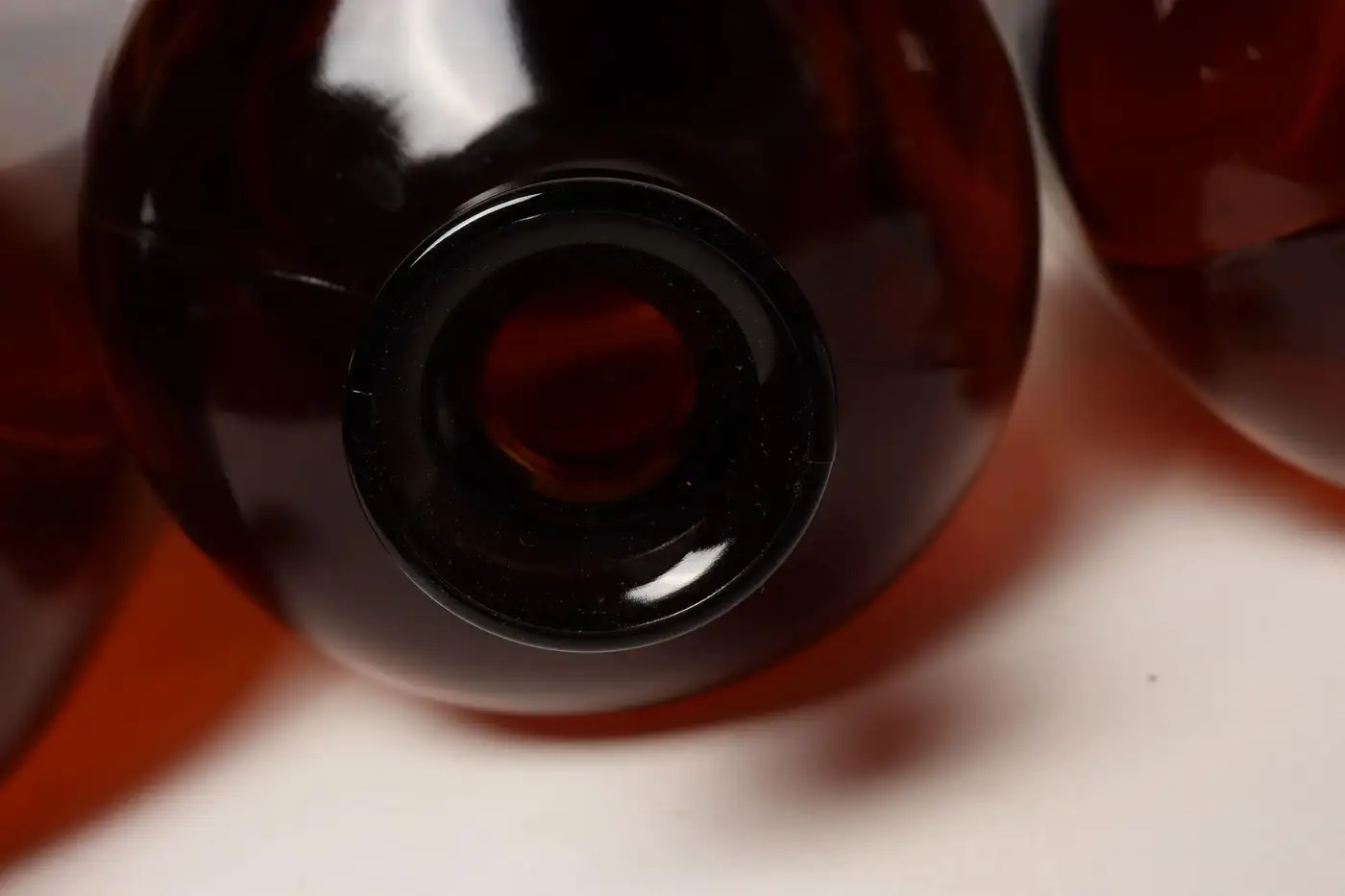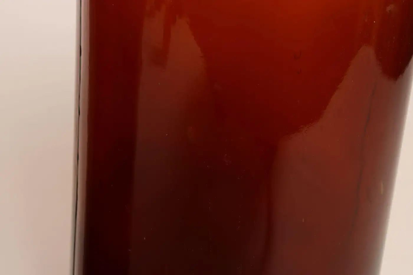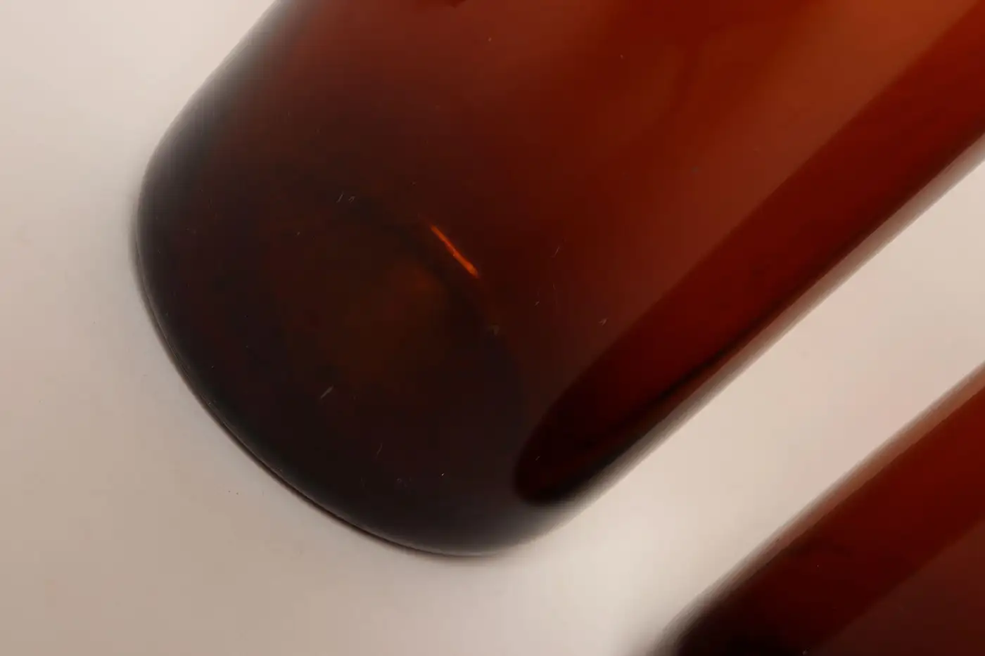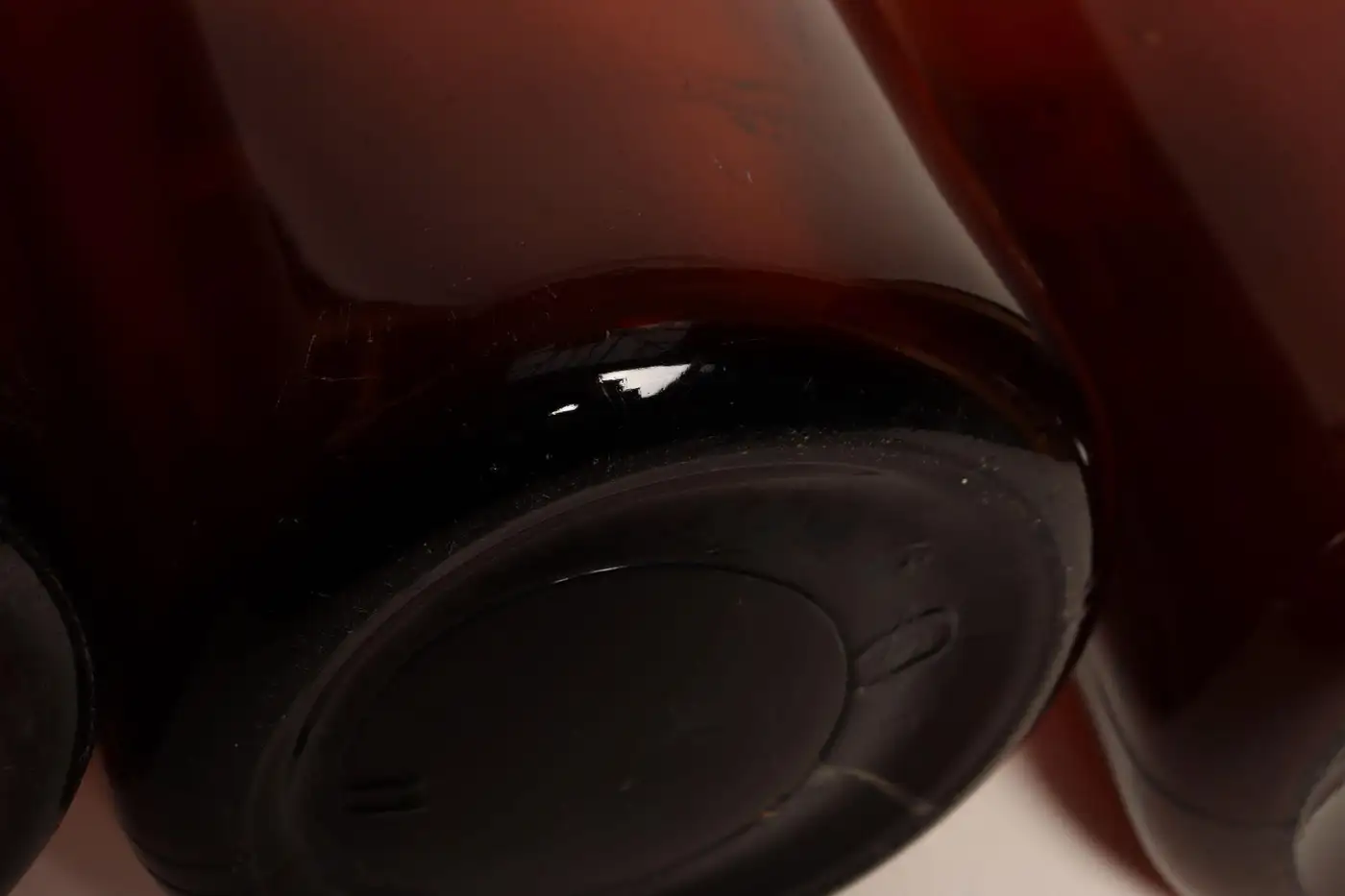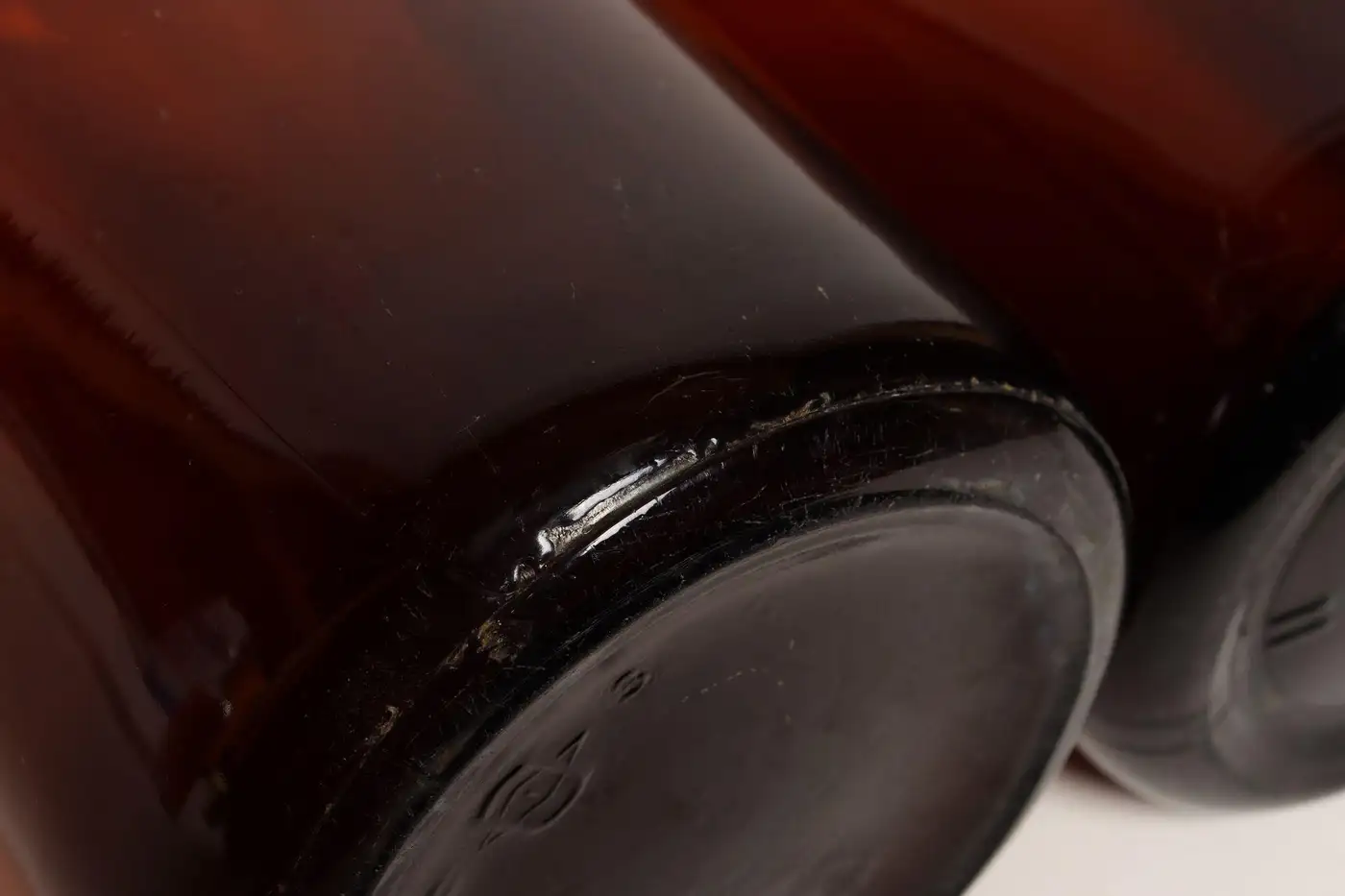 Composed of ‘blown-to-mold’ glass, a method accepted as ‘hand-blowing’, exhibiting a smattering of bubbles within the glass itself (molds were incorporated in manufacturing and hand-finished). Further, amber glass was used to protect light-sensitive materials.