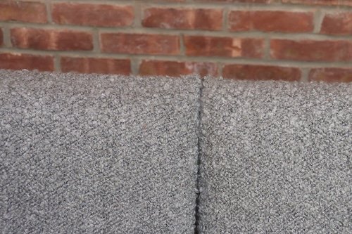 Upholstery is a subtle two-tone gray bouclé, and either side can be displayed: the front cushions are a charcoal bouclé (Kravet 36114-11), and the back is a slate bouclé (Kravet 36120-21) – the front is a shade lighter and the weave is looser than the back.