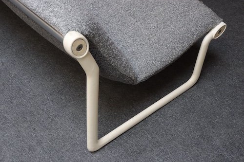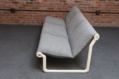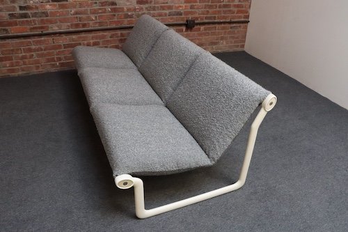 Vintage three-seat armless sofa in charcoal bouclé with an off-white powder-coated steel frame designed by Bruce Hannah and Andrew Morrison for Knoll (1971, New York, NY USA). The design was inspired by the extruded aluminum of a sailboat mast.