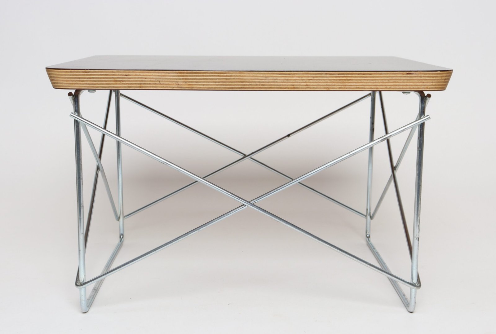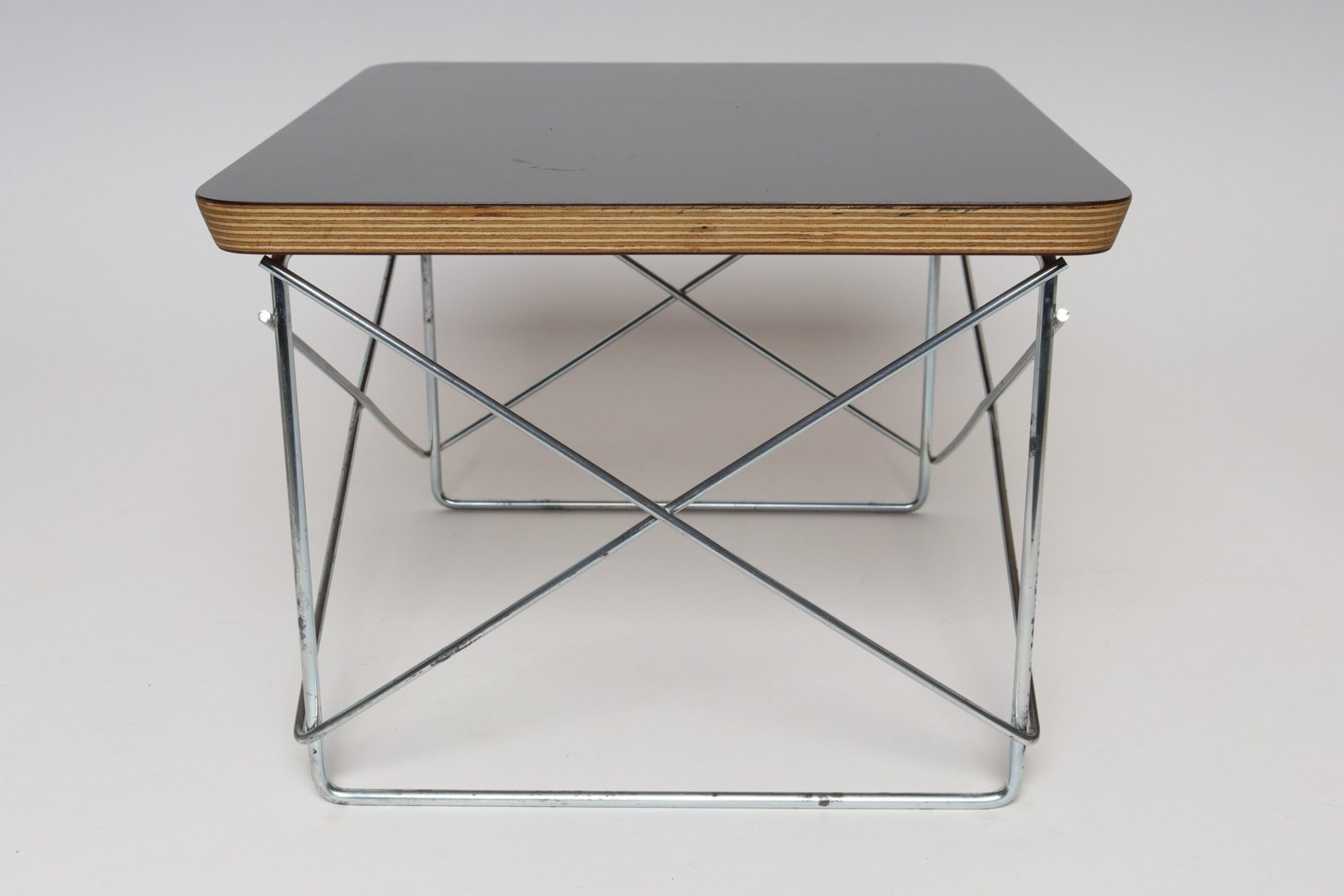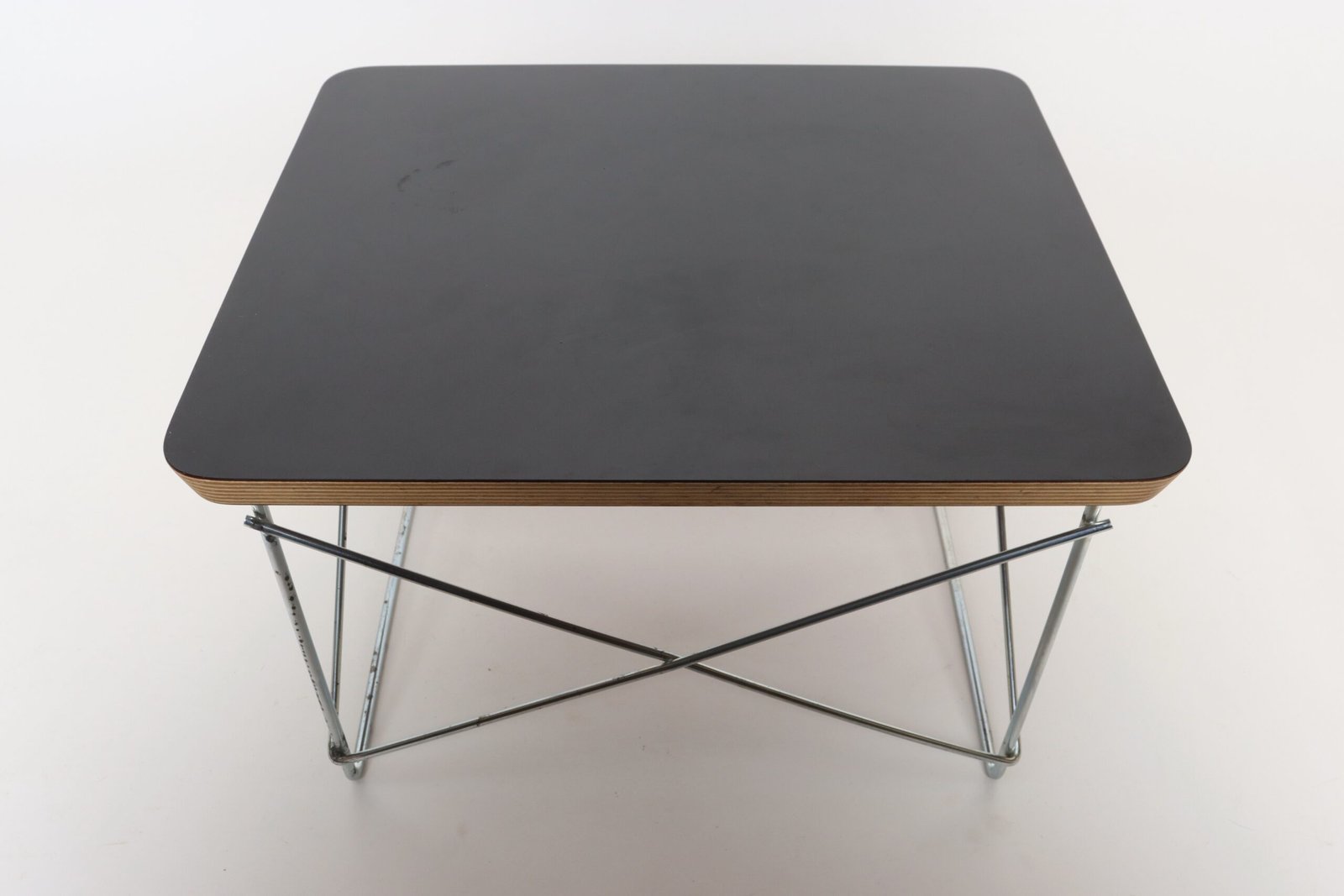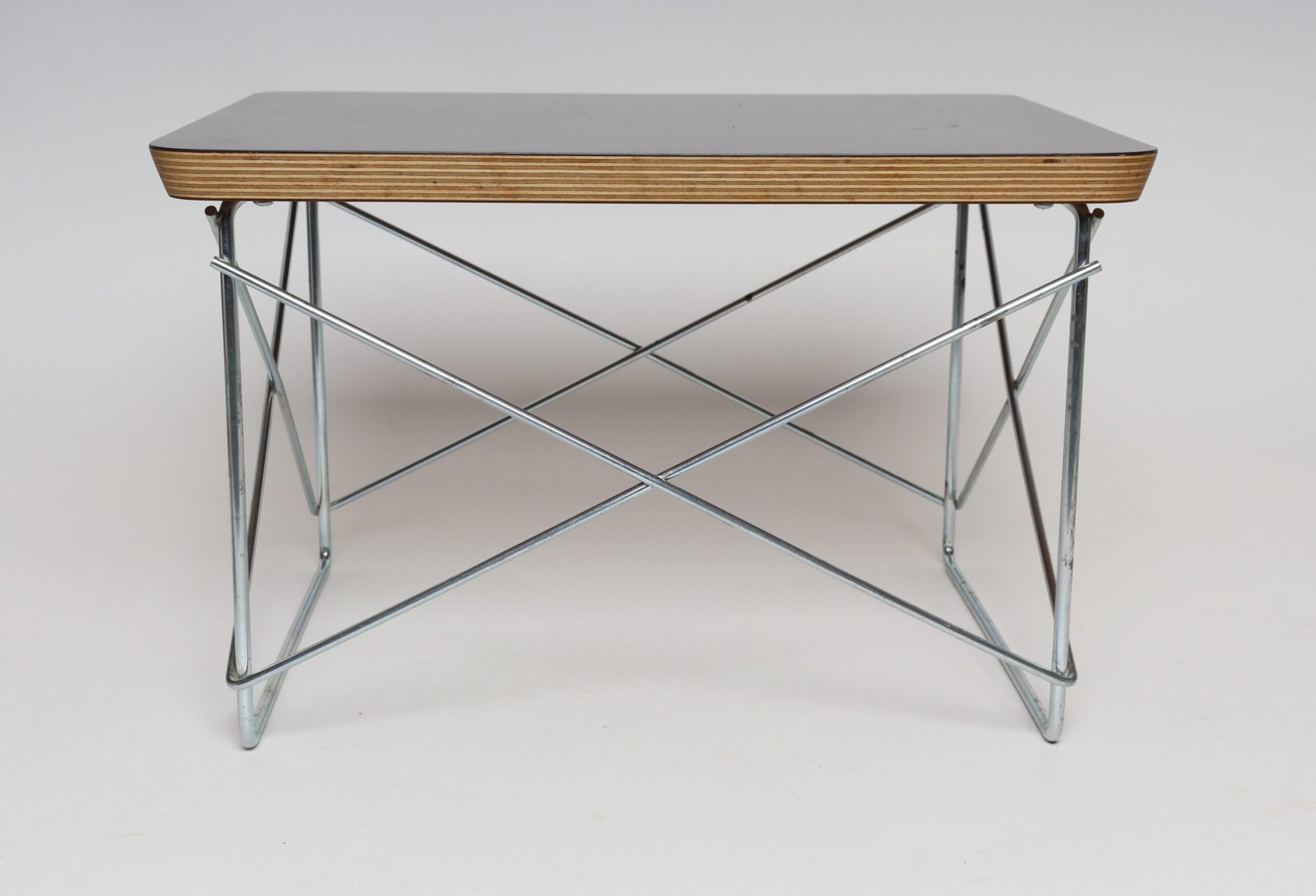 Charles and Ray Eames for Herman Miller LTR (low table rod) side table originally designed in 1950 in layered plywood with a black laminate top supported by a resistance-welded chromed metal cross-brace base (ca. 2003, USA).