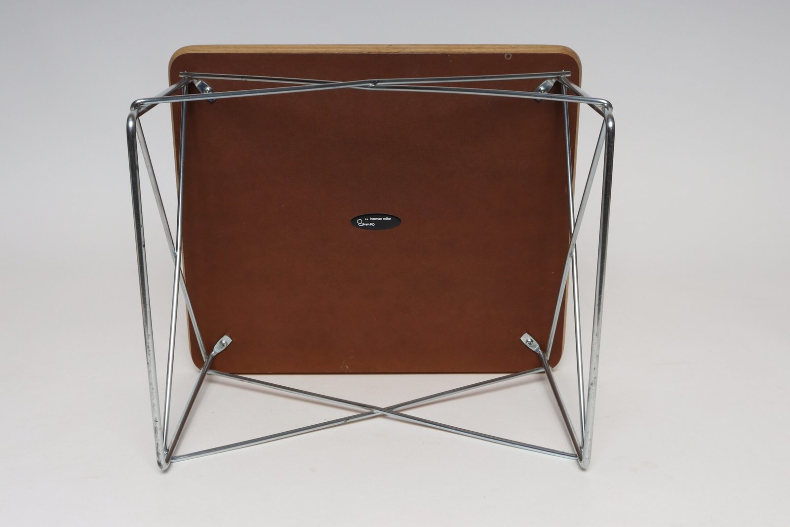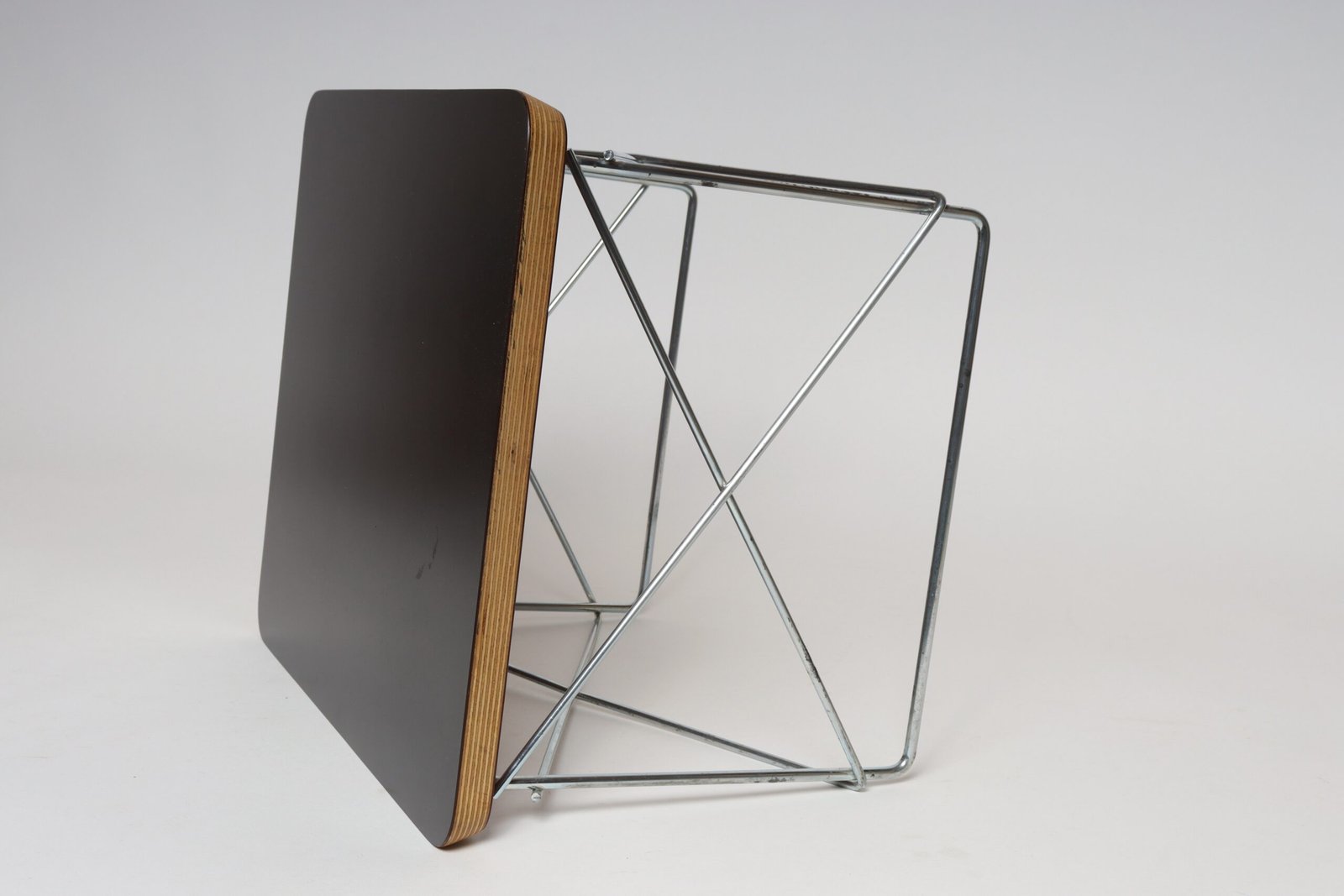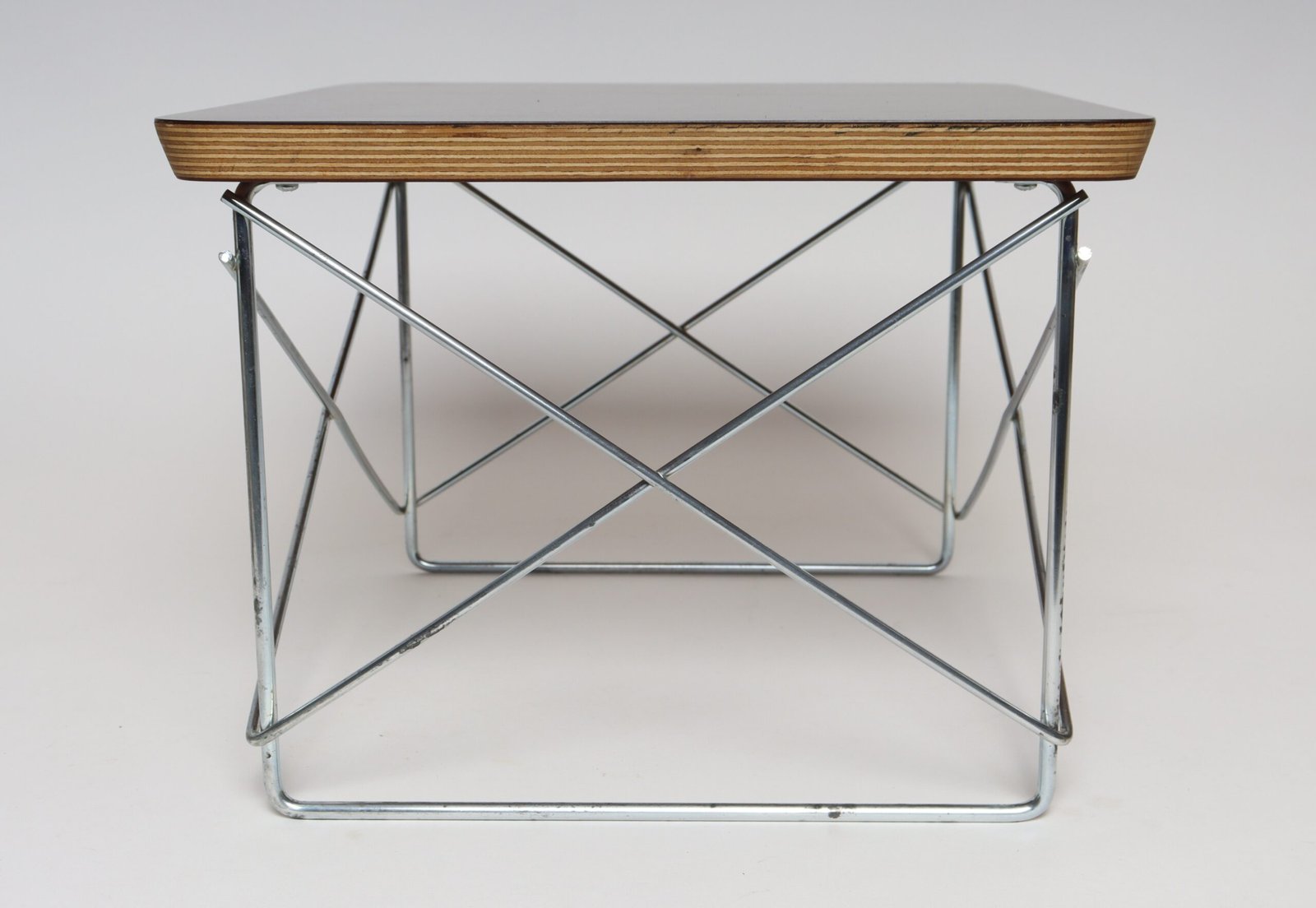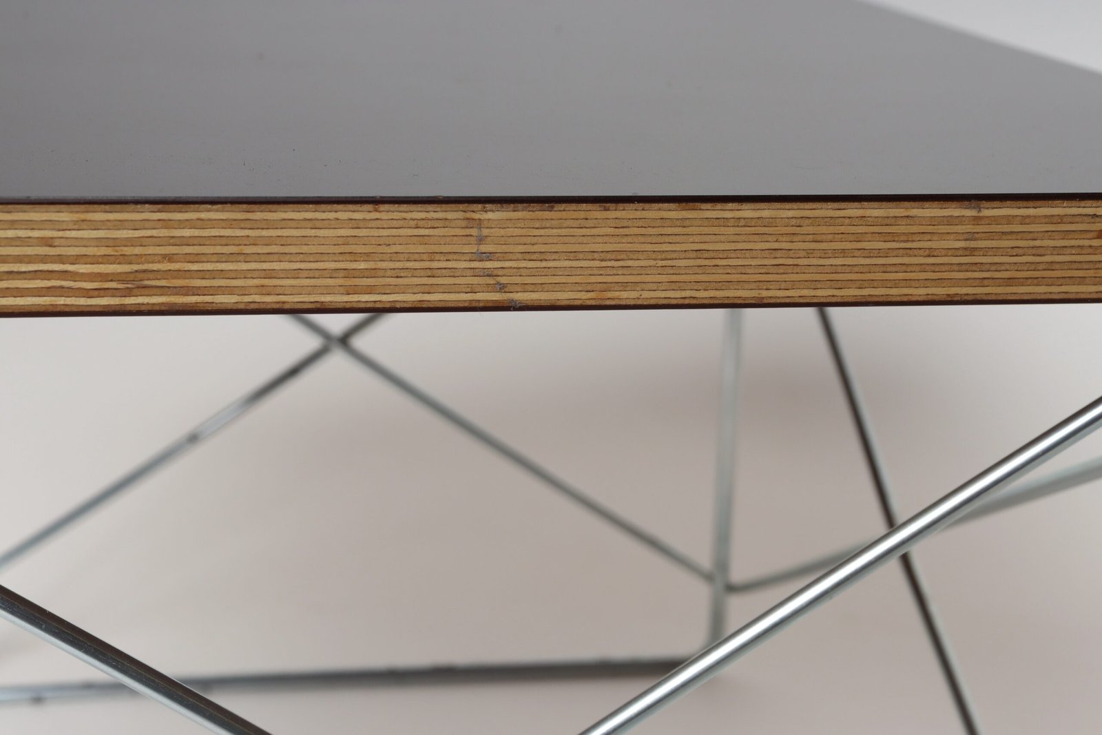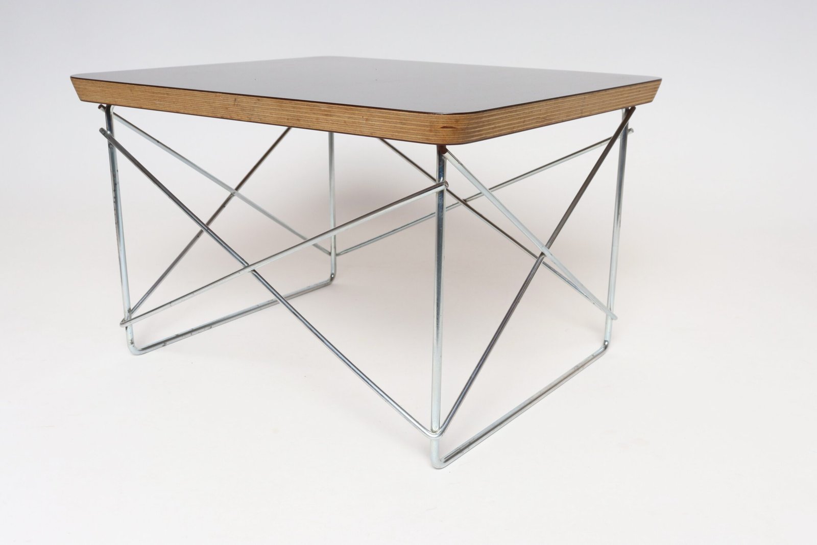 Charles and Ray Eames for Herman Miller LTR (low table rod) side table originally designed in 1950 in layered plywood with a black laminate top supported by a resistance-welded chromed metal cross-brace base (ca. 2003, USA).