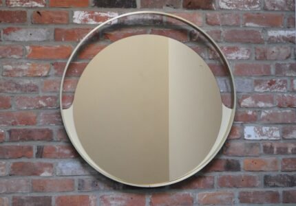 Large in scale: 103″ H x 32″ L x 1.25″ D weighing over 100 lbs. Composed of a brushed stainless steel and plywood backed frame. The upper half of the glass shows several scuffs, which do not detract from the clarity of the reflection, as only the top portion shows scratches.