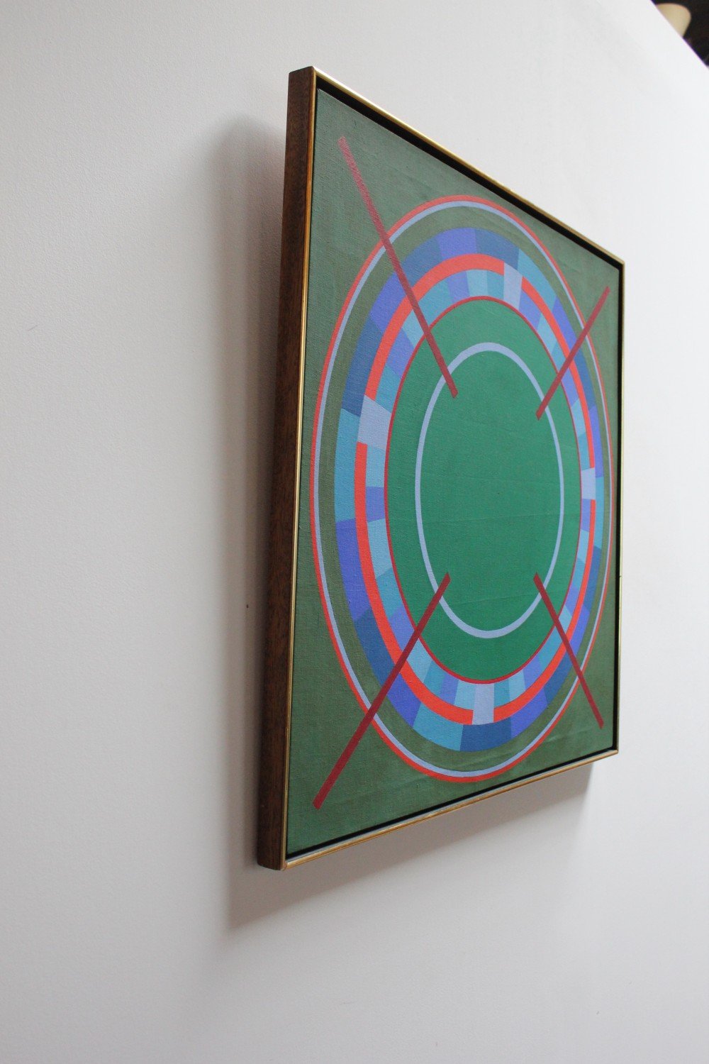 Intriguing color field study with attractive palette and unique Op Art composition of geometric forms — lines, squares, circles. Schmitt’s later works are computer-manipulated, whereas this early example was fully hand-executed.