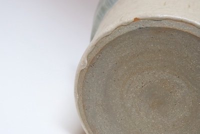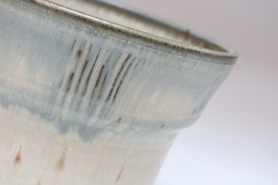 Circa 1979 piece featuring an organic-form vessel in cream and light blue glaze with brown linear and speckled details.