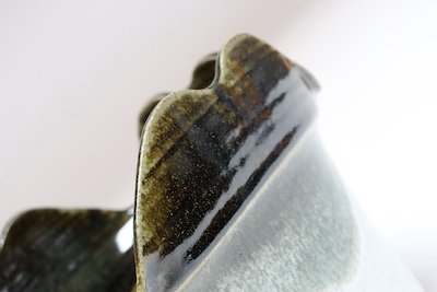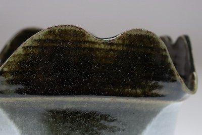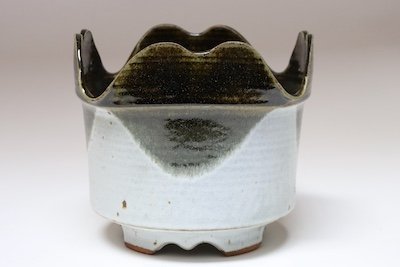 Circa 1979 studio piece featuring a round vessel with curved, wavy borders on all four sides in organic, earthen hues of white, olive, brown, and tan.