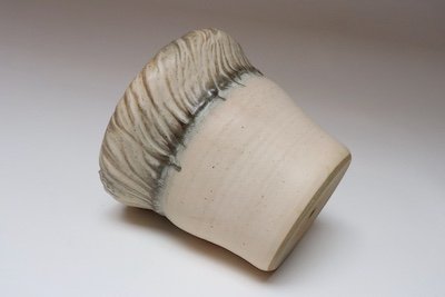 This set dates to the early 1990s, based on the signature “D. Nichols,” which she used during that era and features a design reminiscent of the linear pattern and shape of certain sea shells. The rim decorated with incised sinuous lines protrudes out slightly from the vessel. The matte pale pink, olive green, and brown palette with a lightly mottled surface gives the piece a gentle, organic quality.