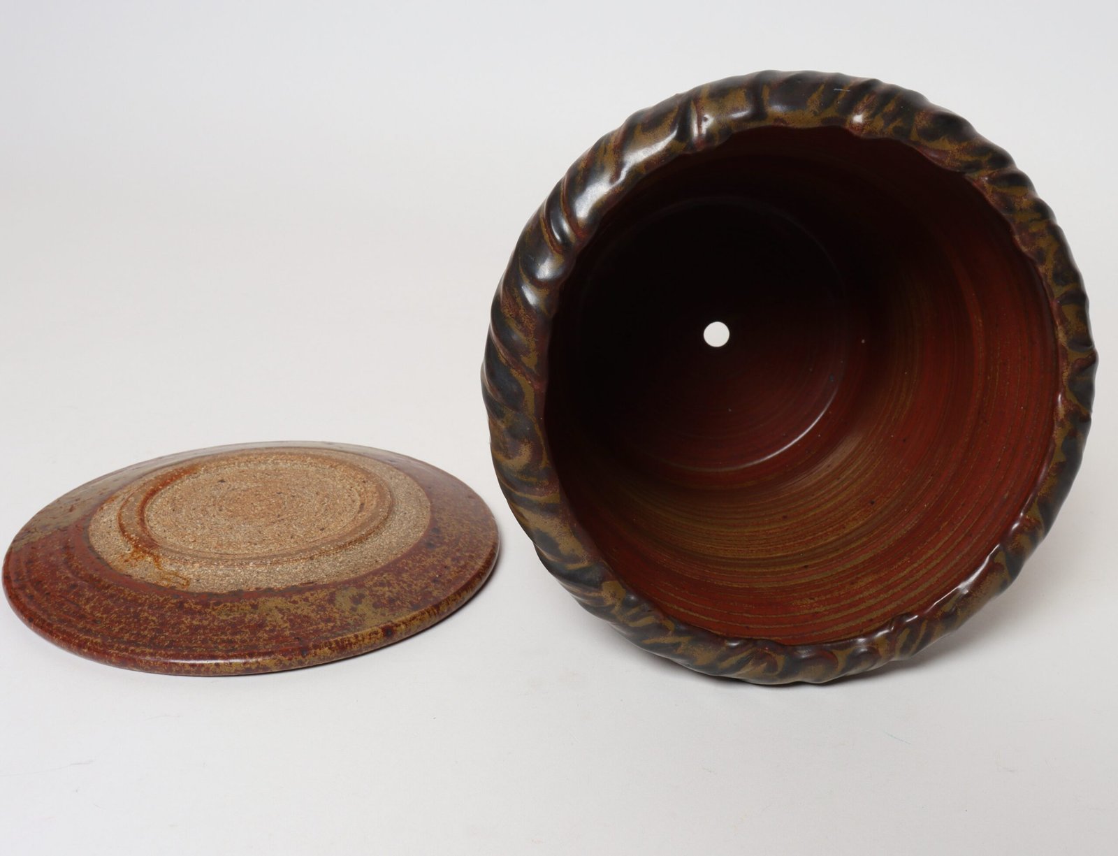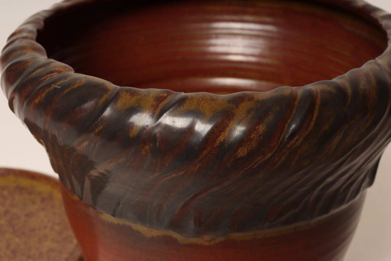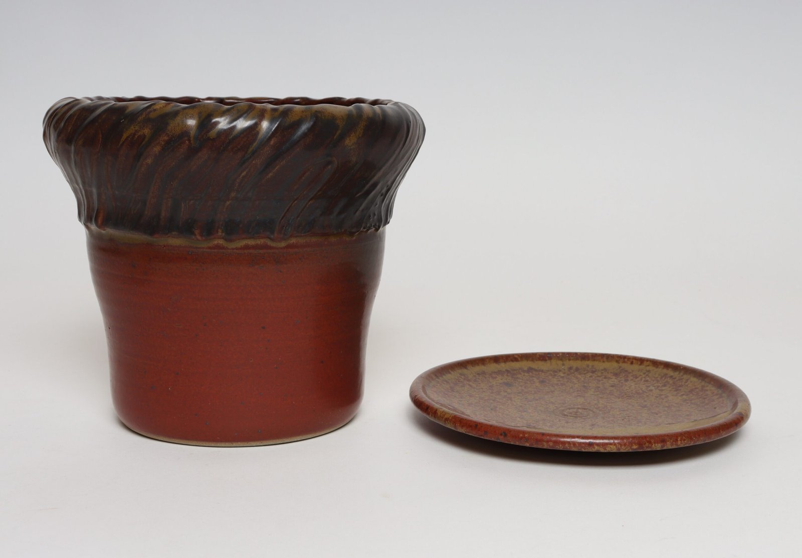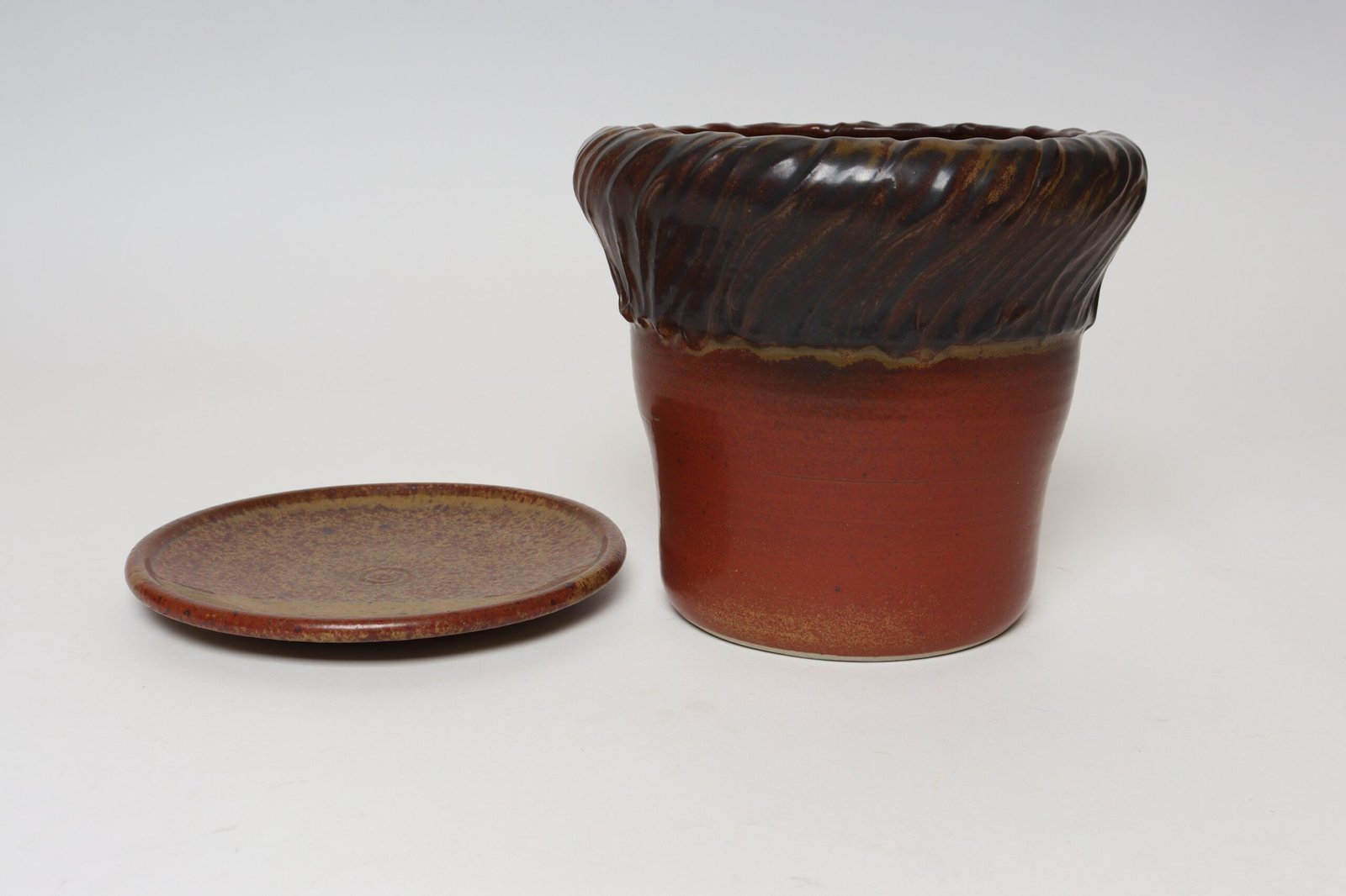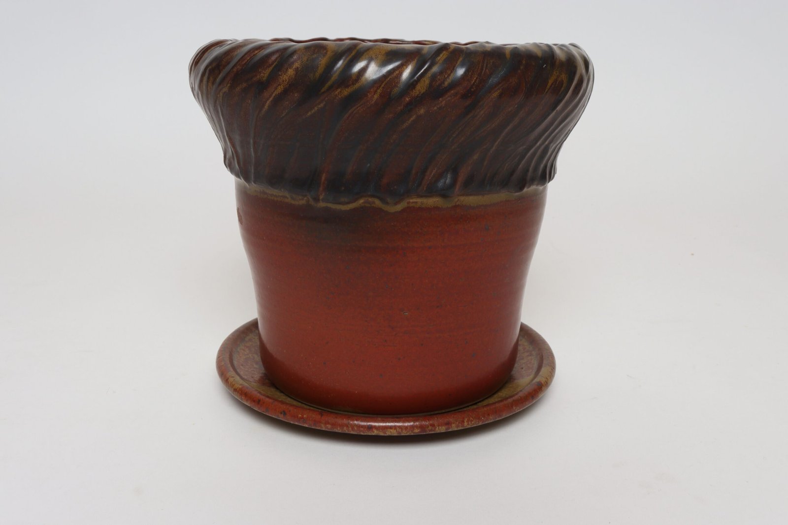 Studio ceramic planter with drainage hole and plate/saucer by ceramicist, Deanna Nichols (b. 1942-2017, Missouri).