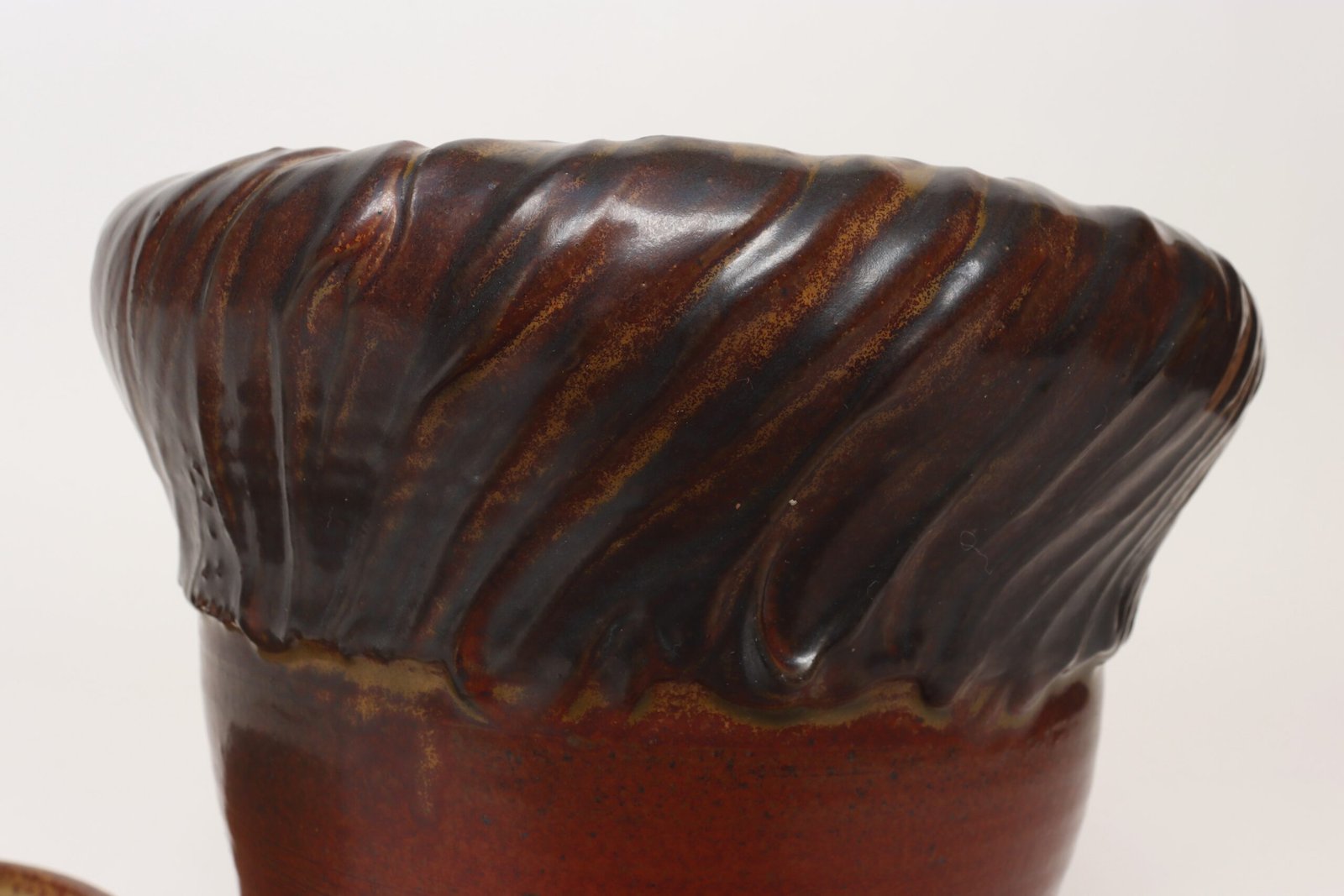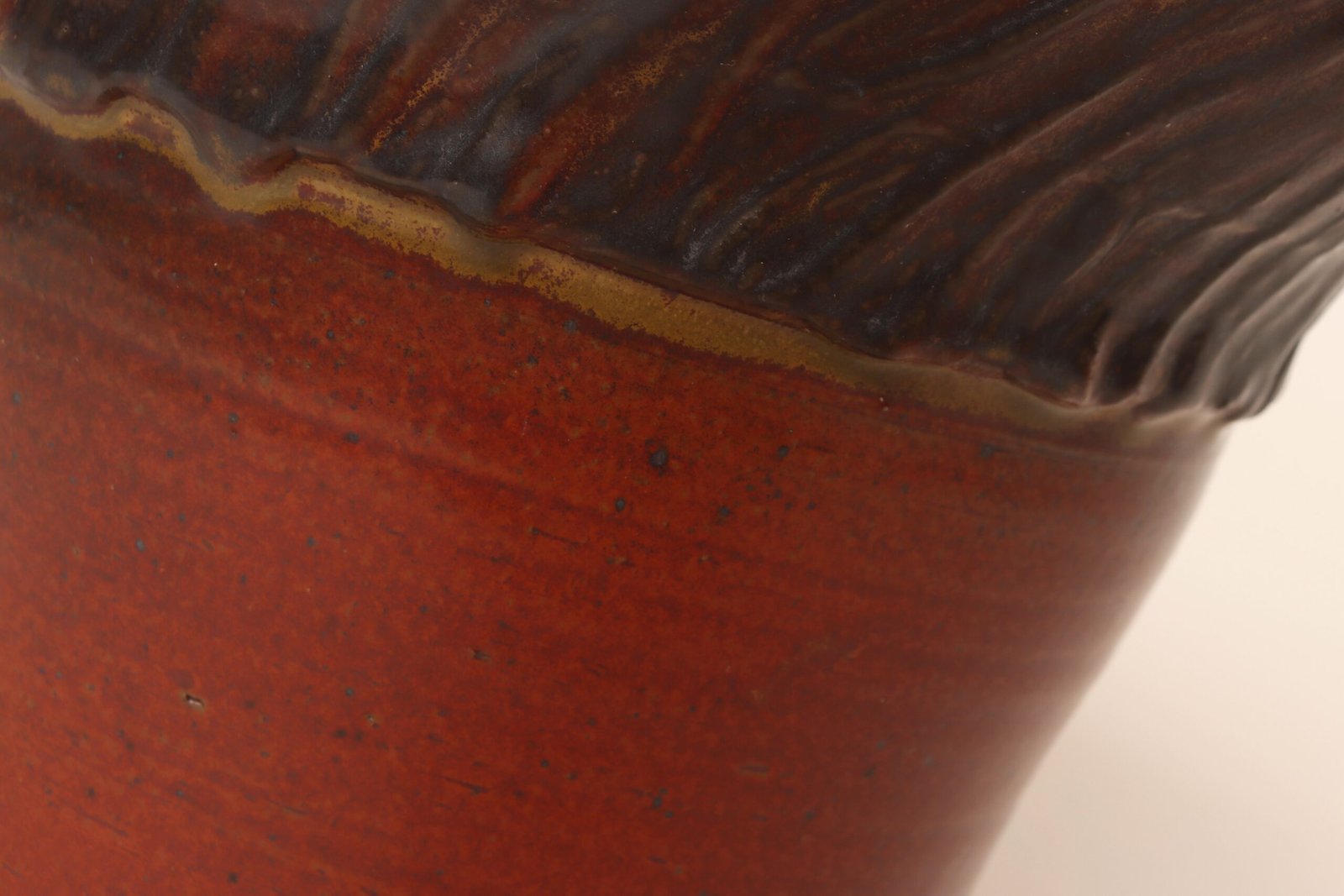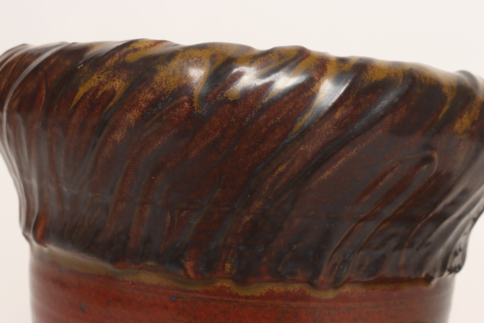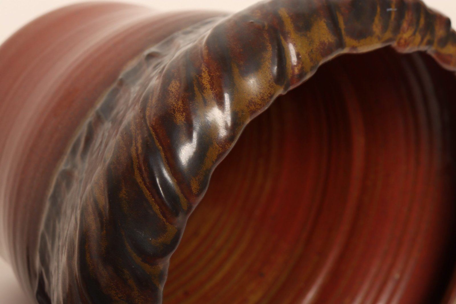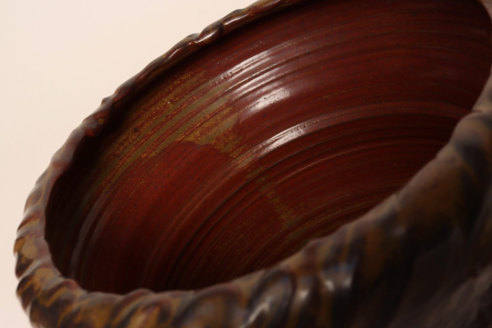 This piece dates to the early 1990s, based on the signature “D. Nichols,” which she used during that era and features a design reminiscent of the linear pattern and shape of certain sea shells. The rim decorated with incised sinuous lines protrudes out slightly from the vessel. Attractive matte deep crimson glaze with ochre and slate rim in both matte and contrasting metallic glazes.