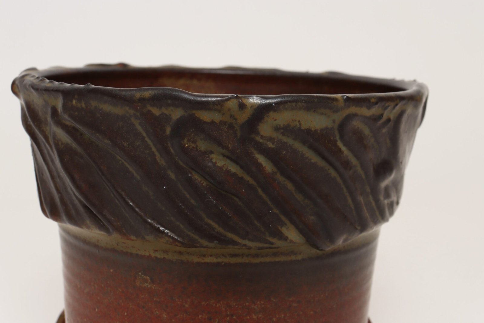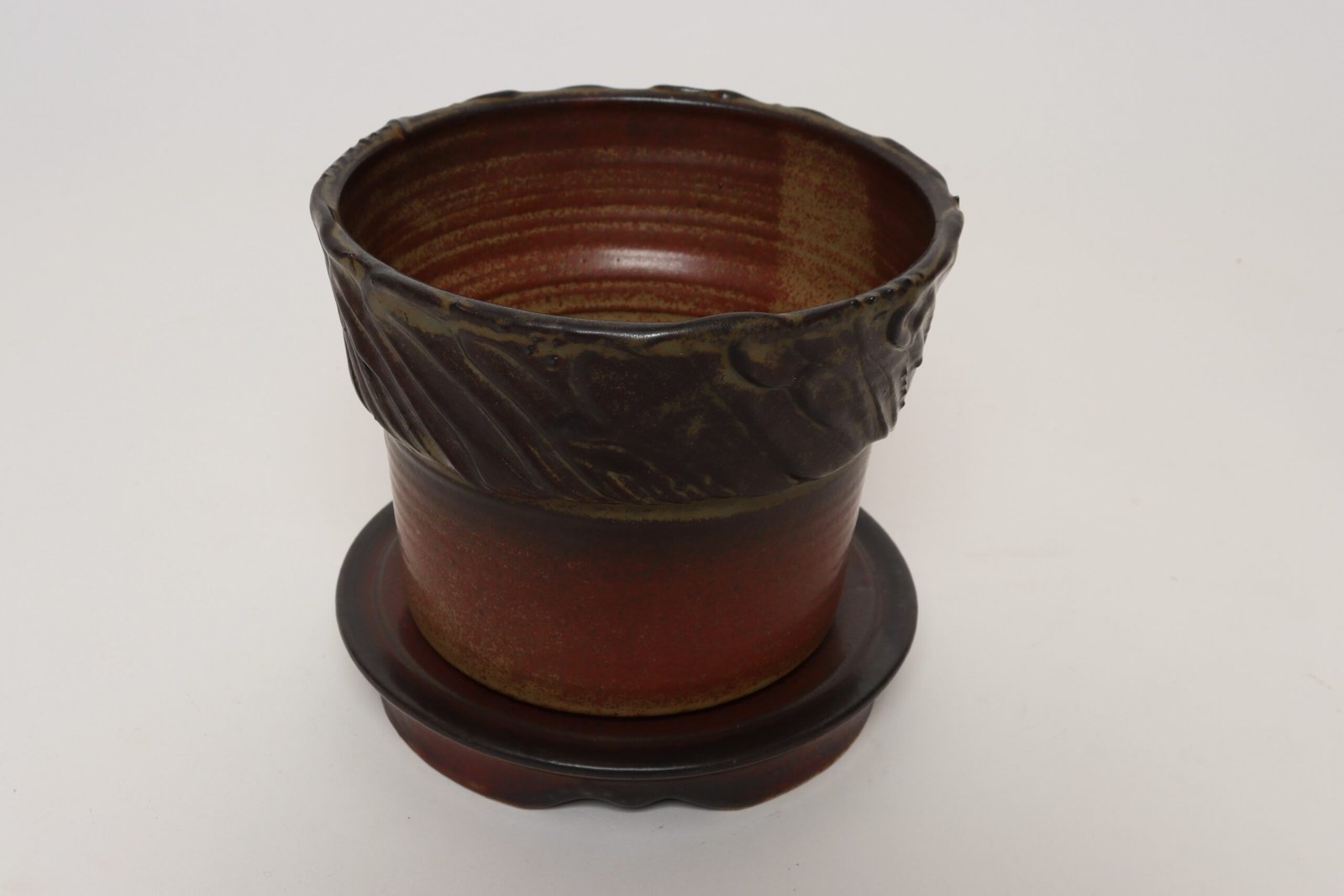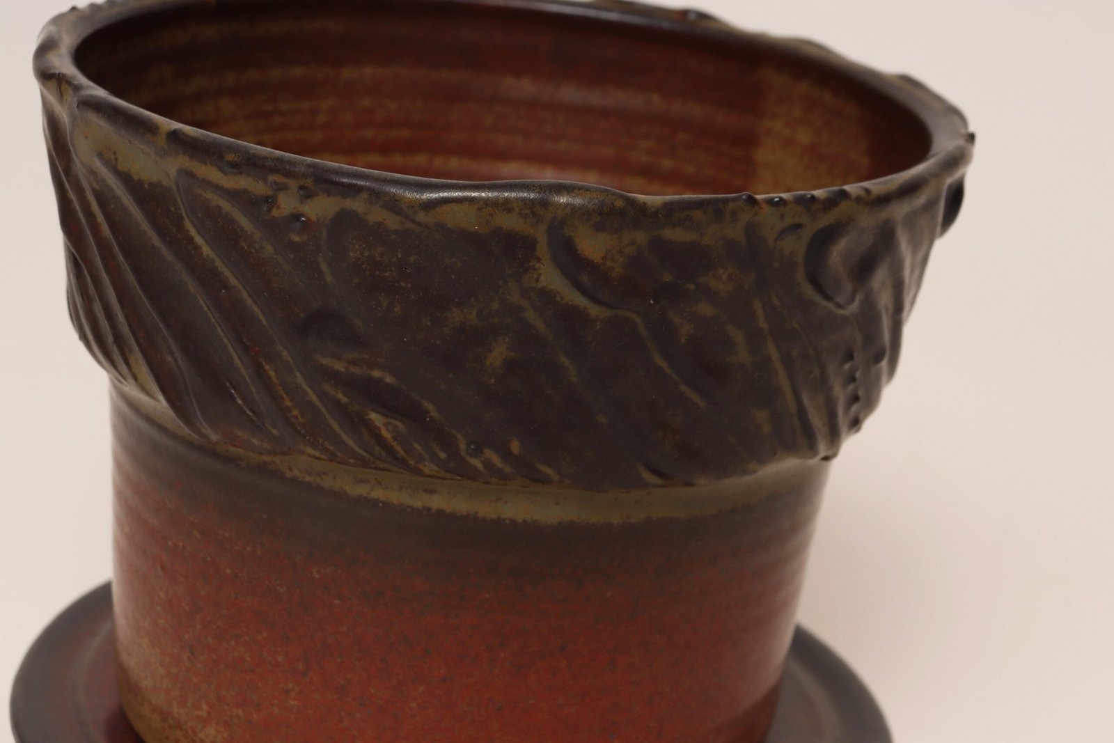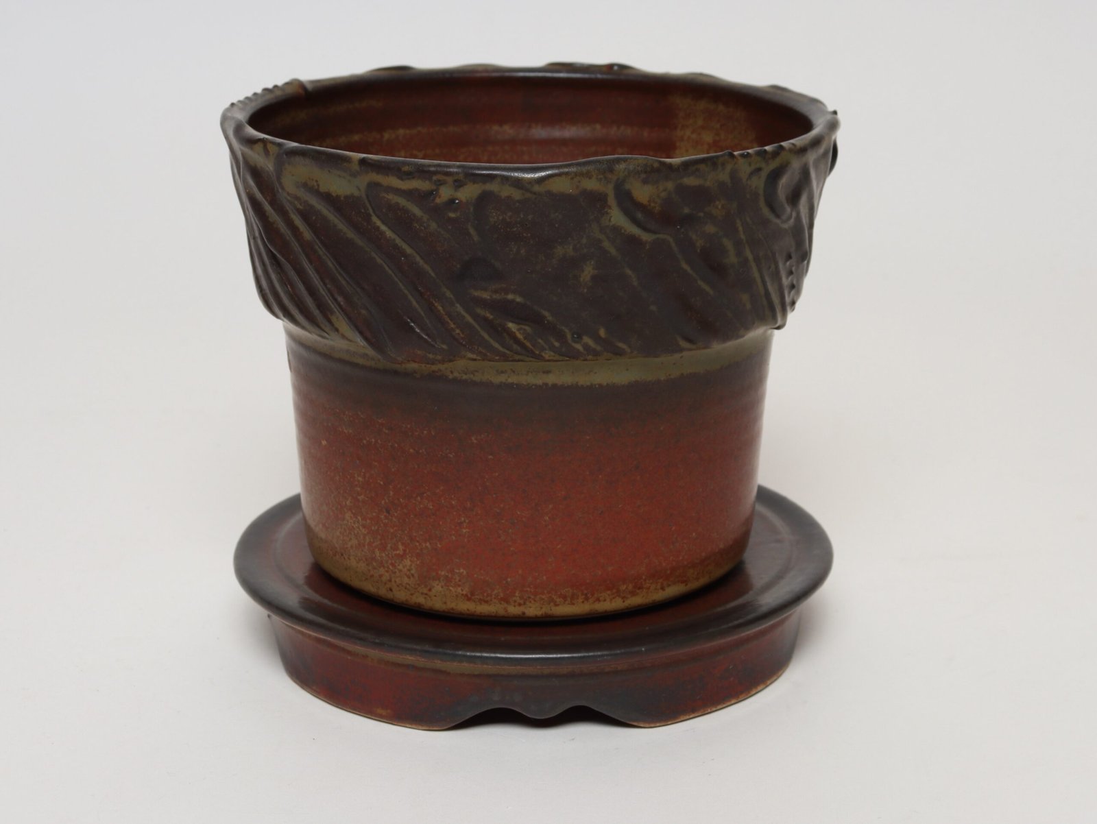 This piece dates to the early 1990s, based on the signature “D. Nichols,” which she used during that era and features a design reminiscent of the venation of leaves. The rim decorated with incised sinuous lines protrudes out slightly from the vessel. Attractive matte deep crimson glaze with ochre and slate rim in both matte and contrasting metallic glazes. Additionally, this example includes a versatile plate which can serve as a supportive cradle for the planter or reversed for use as a stand.