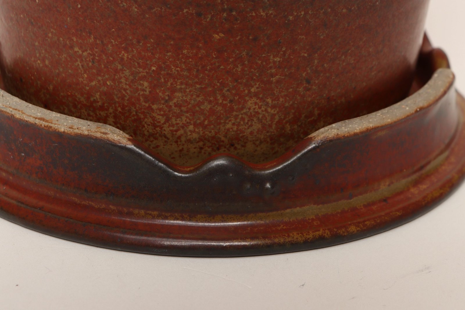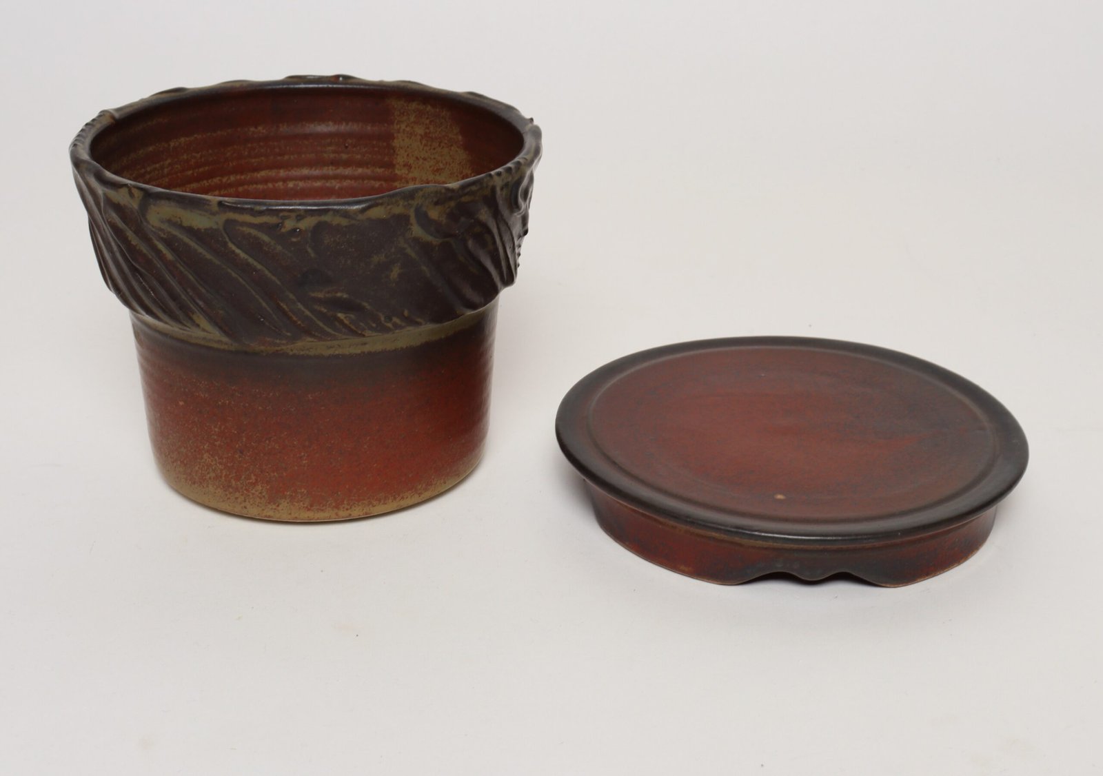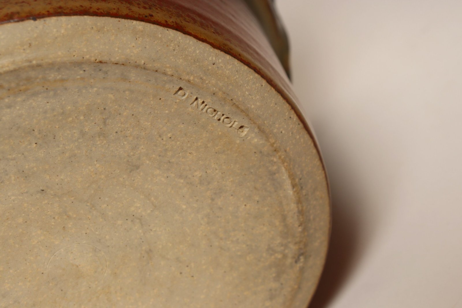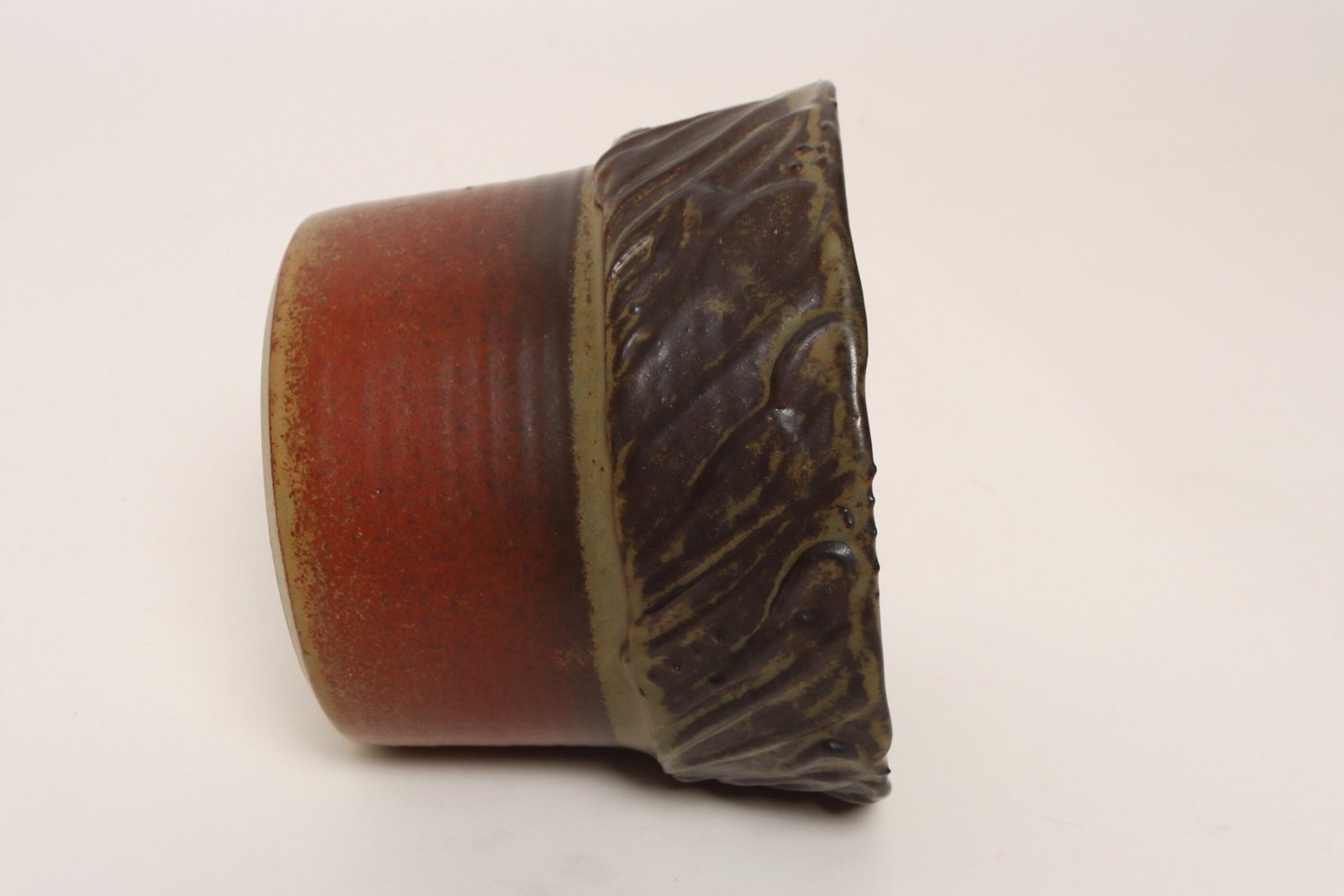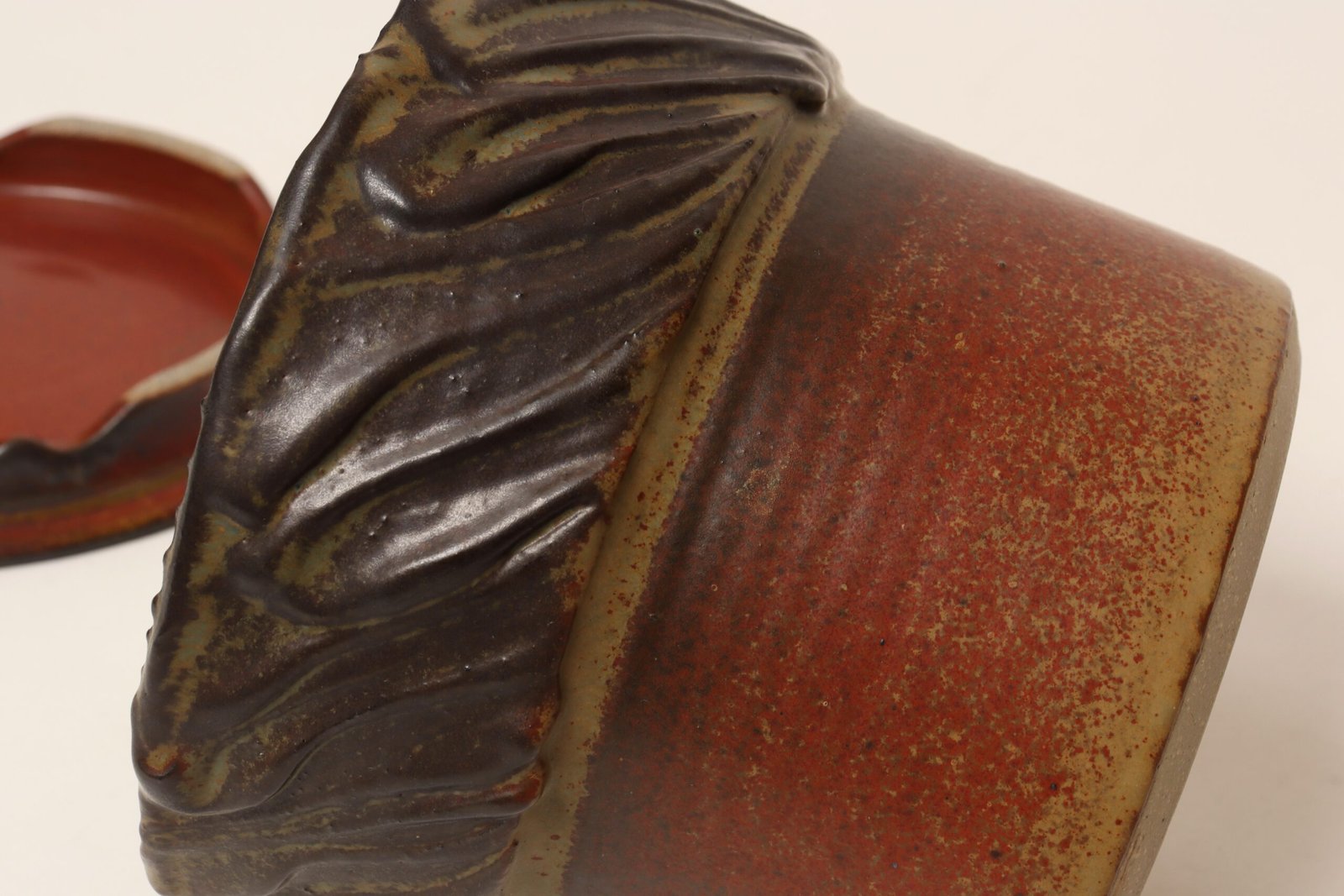 This piece dates to the early 1990s, based on the signature “D. Nichols,” which she used during that era and features a design reminiscent of the venation of leaves. The rim decorated with incised sinuous lines protrudes out slightly from the vessel. Attractive matte deep crimson glaze with ochre and slate rim in both matte and contrasting metallic glazes. Additionally, this example includes a versatile plate which can serve as a supportive cradle for the planter or reversed for use as a stand.
