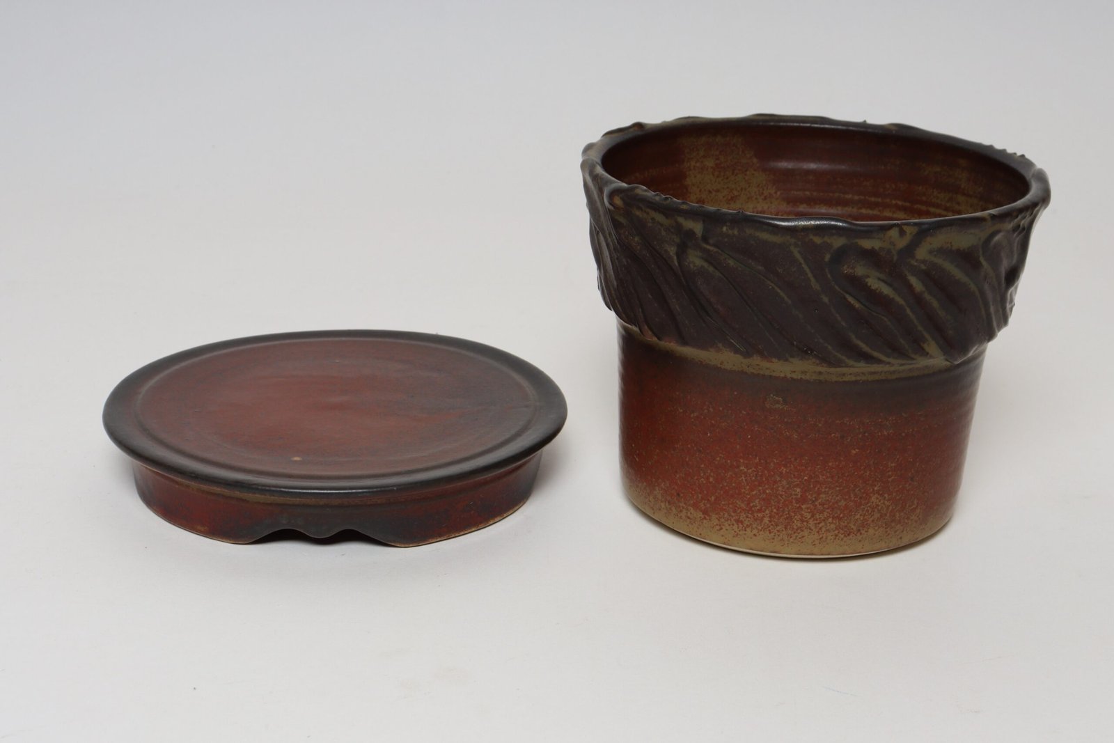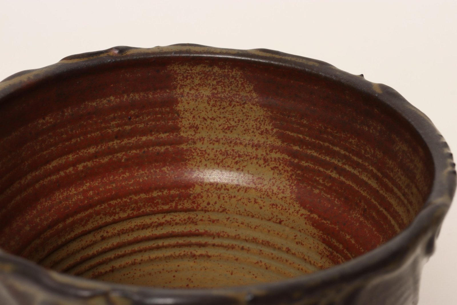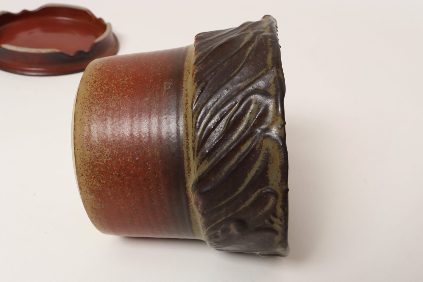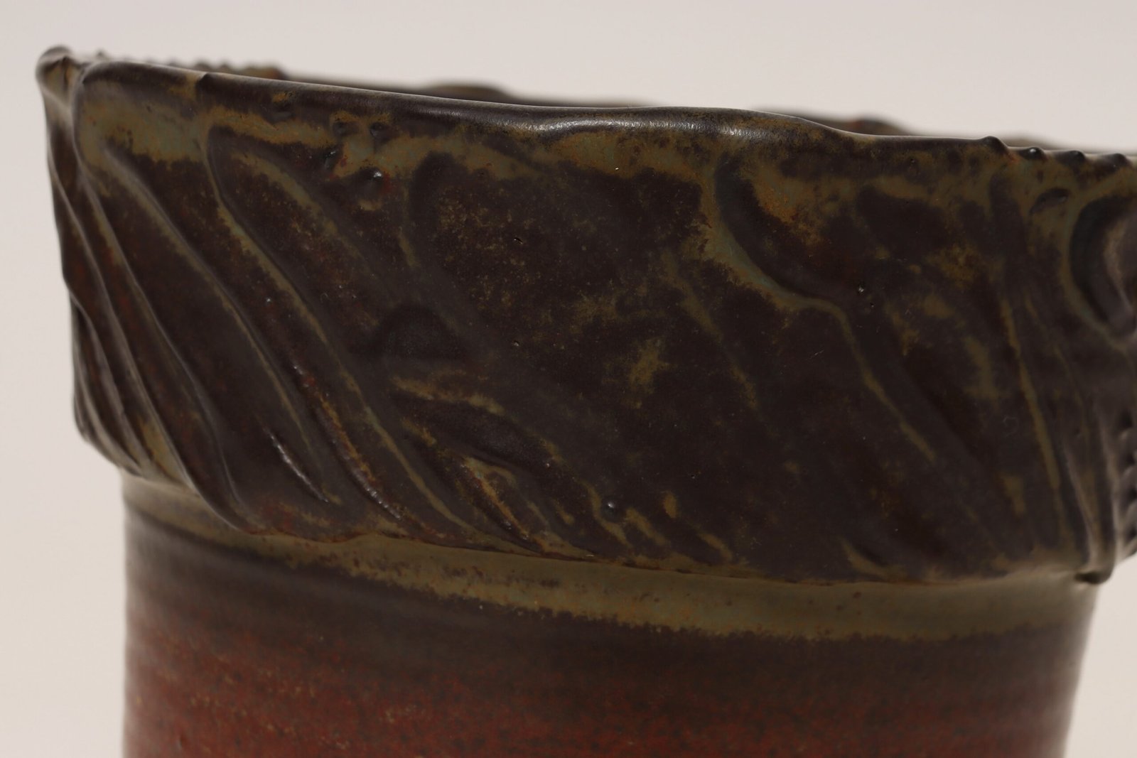 This piece dates to the early 1990s, based on the signature “D. Nichols,” which she used during that era and features a design reminiscent of the venation of leaves. The rim decorated with incised sinuous lines protrudes out slightly from the vessel. Attractive matte deep crimson glaze with ochre and slate rim in both matte and contrasting metallic glazes. Additionally, this example includes a versatile plate which can serve as a supportive cradle for the planter or reversed for use as a stand.