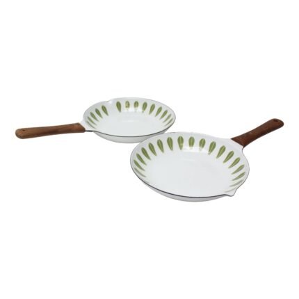 Beautiful, vintage condition, showing only slight wear (speck of edge loss / minor edge wear in addition to a few spots of yellow enamel loss). Overall, the pan is in very clean condition for its age.