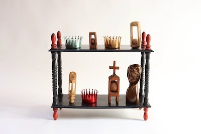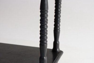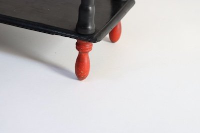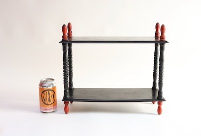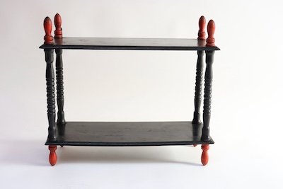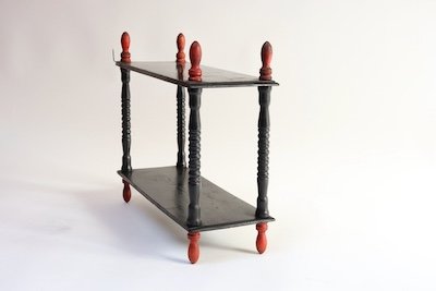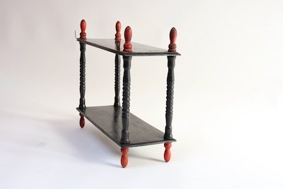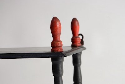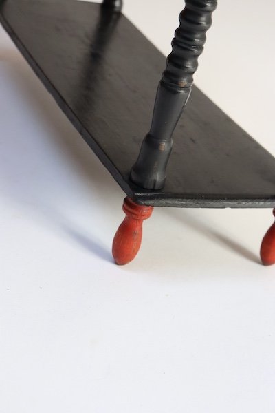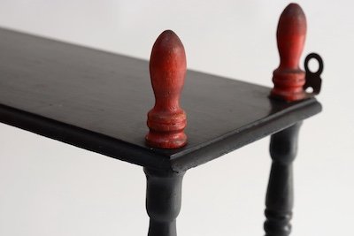 Vintage Diminutive Black Lacquered Table or Wall Shelf with Carved Red Finials