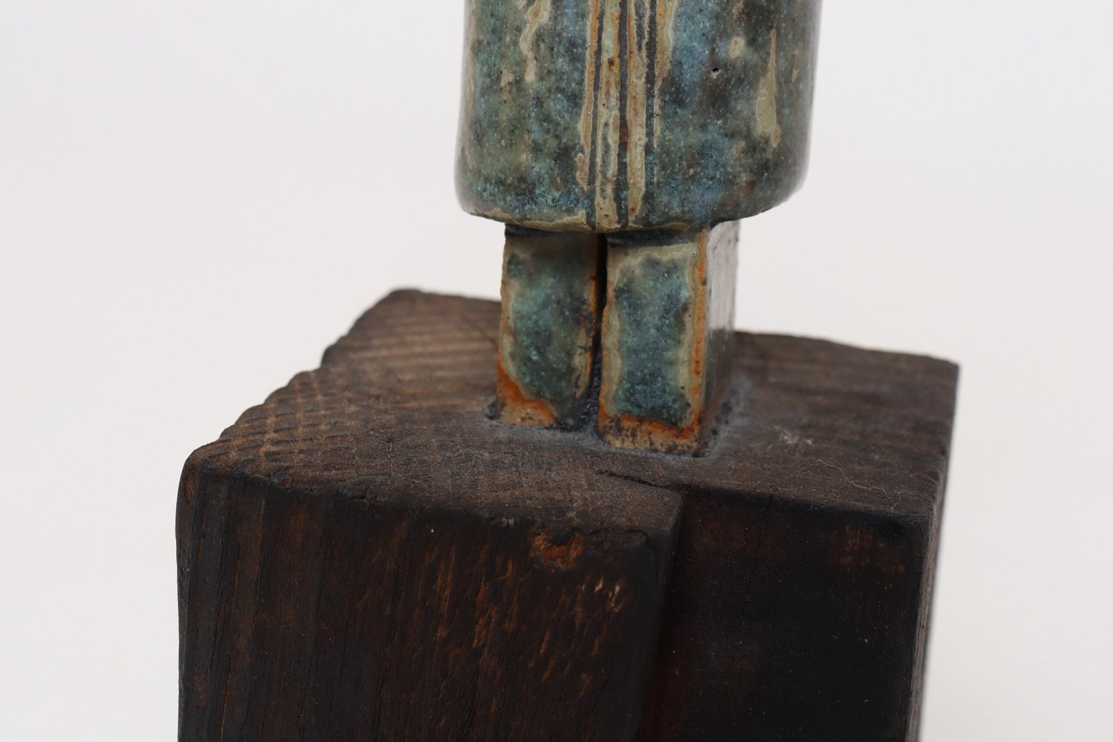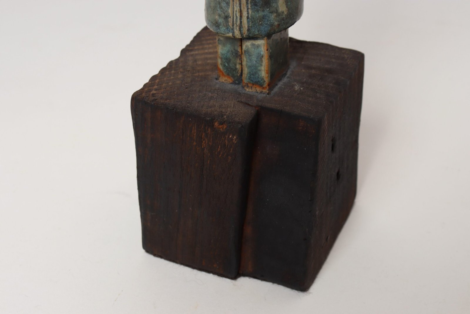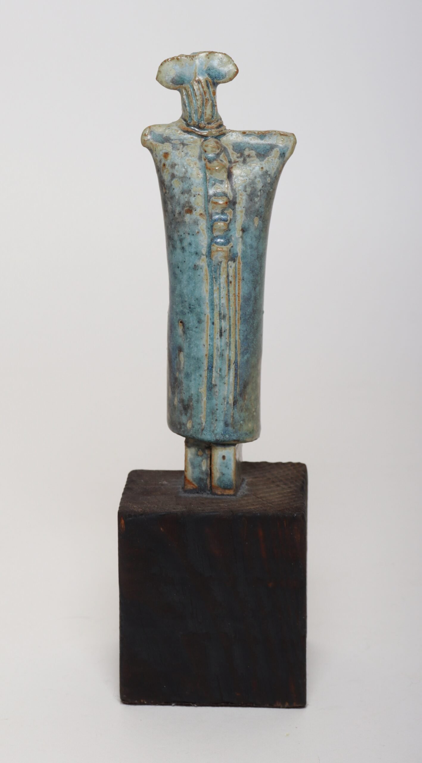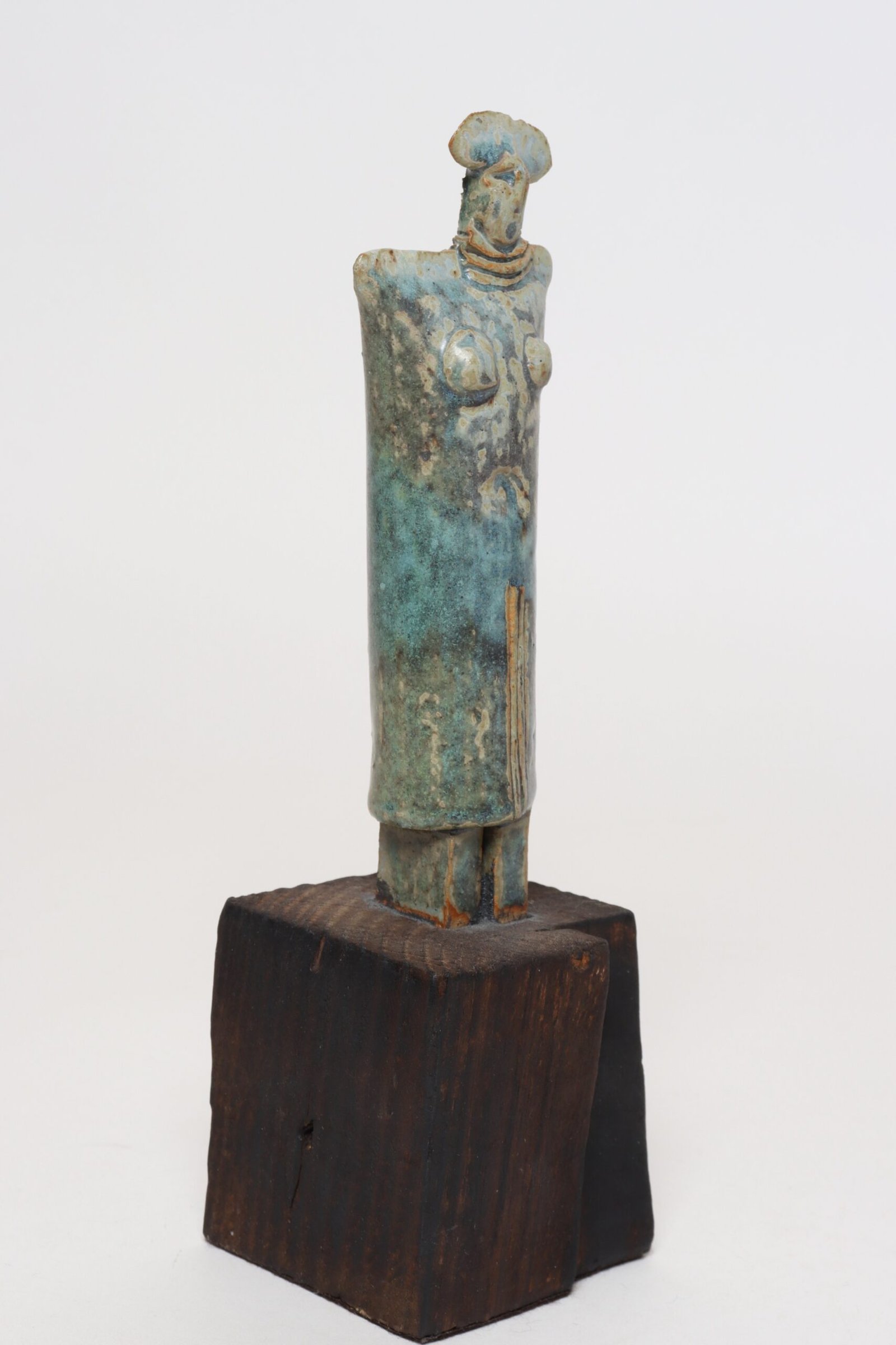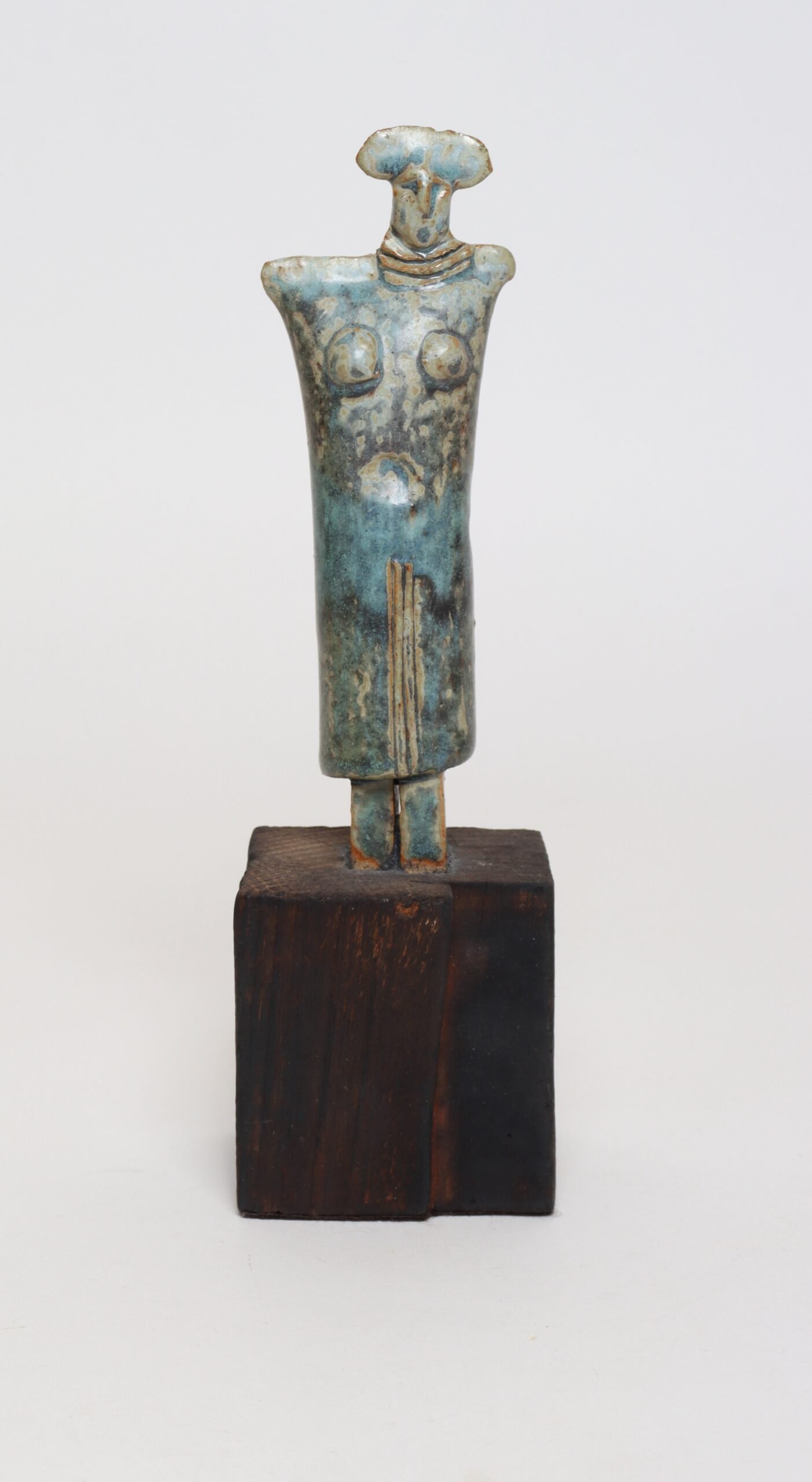 Abstract Etruscan-style female deity/idol tabletop effigy sculpture in terracotta mounted to a wooden plinth base (ca. Mid-20th Century, Italy).