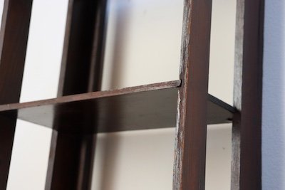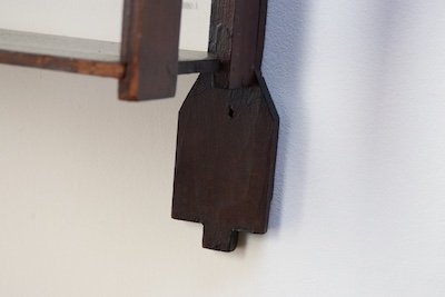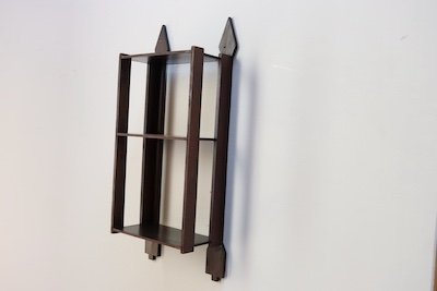 Composed of two hand-carved arrows supporting a small shelf unit with dual slats on either side.
