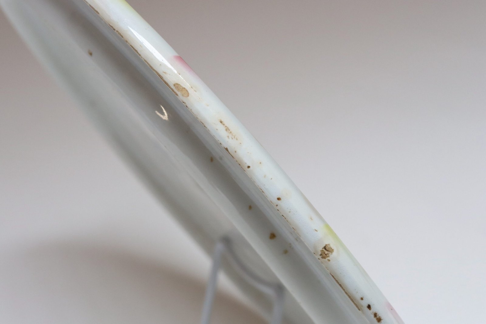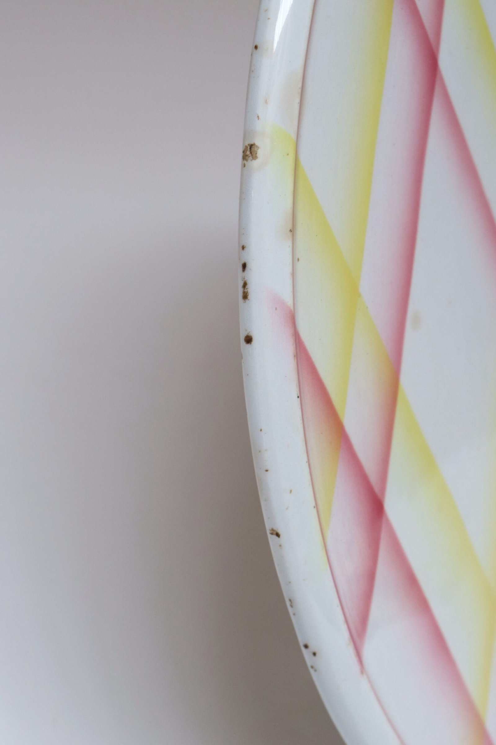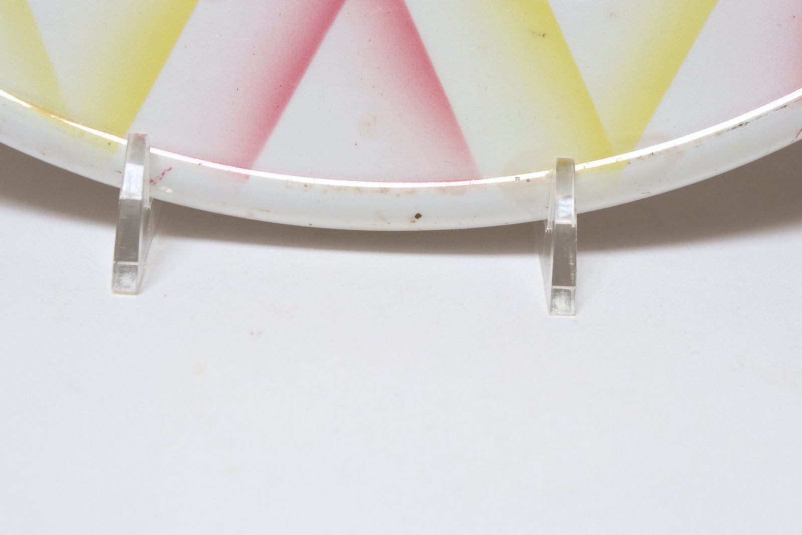 Spots of discoloration and edge loss, as shown. Overall, this stylish, practical piece remains in good, vintage condition.