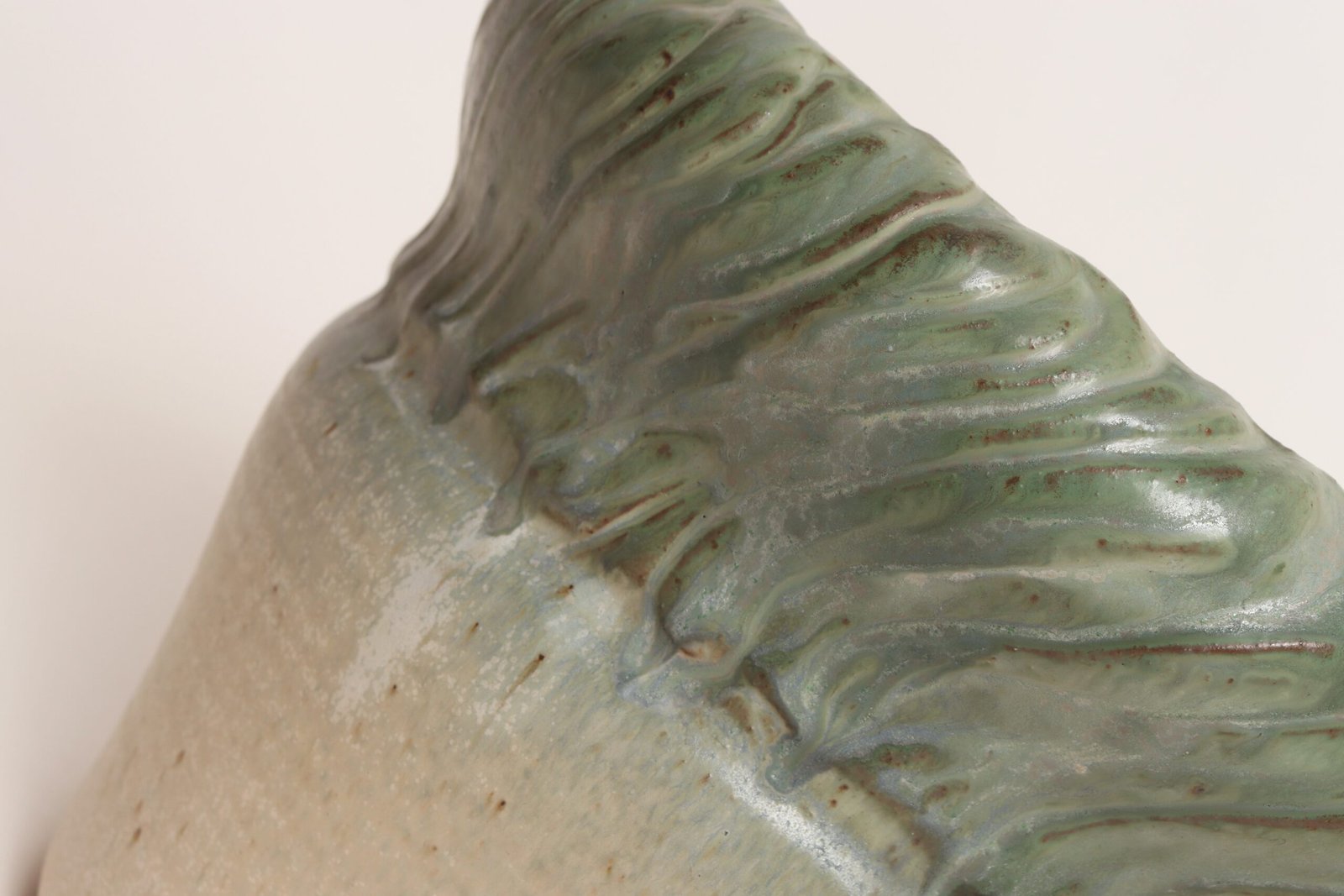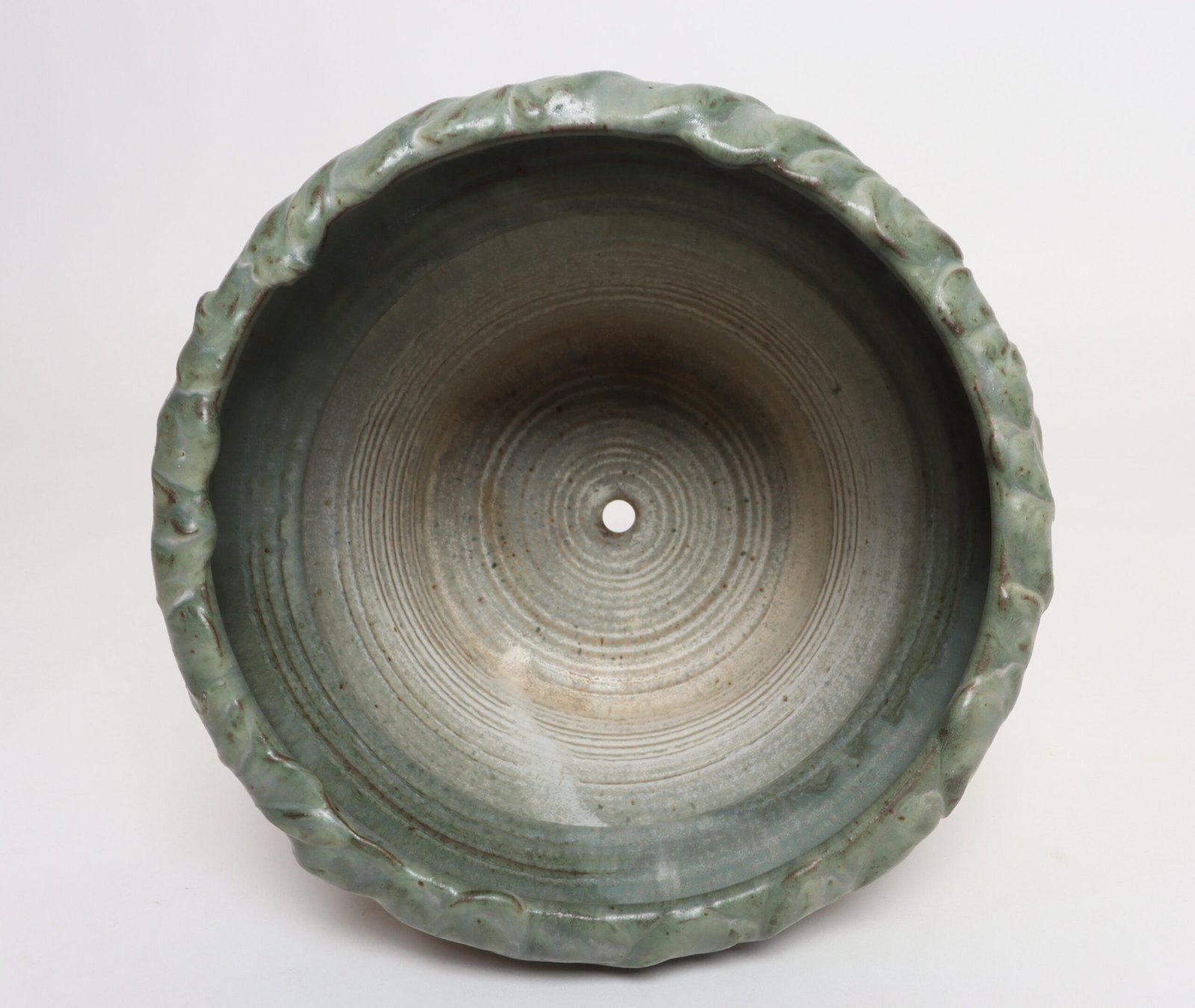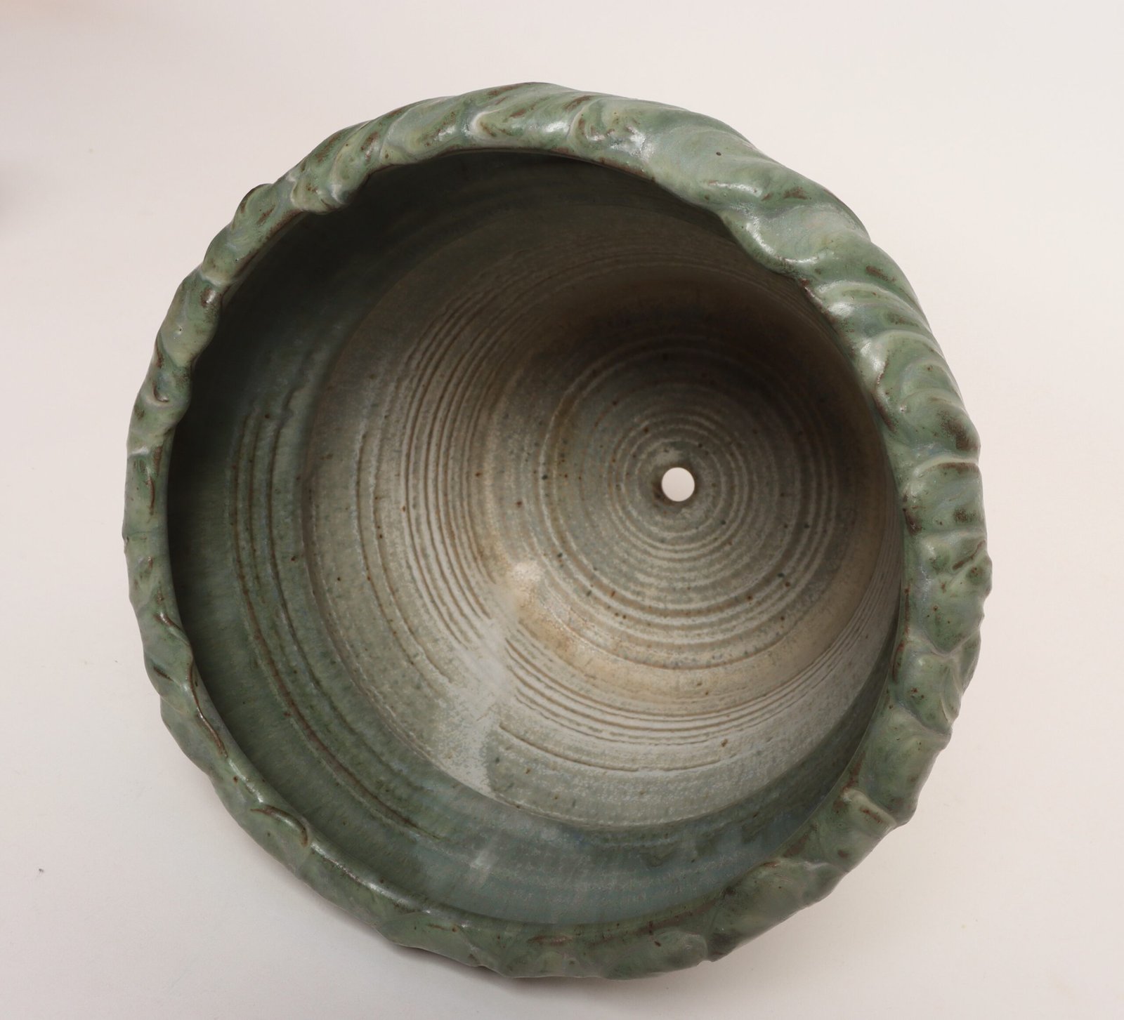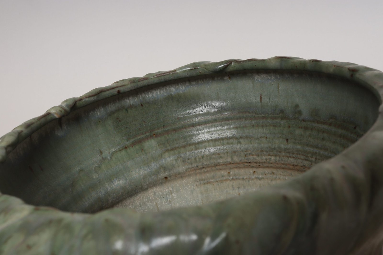 Circa 1979 studio piece featuring a design reminiscent of the linear pattern and shape of certain plants. The rim decorated with incised sinuous lines protrudes out slightly from the vessel. Additionally, the matte green gives the piece a botanical quality.
