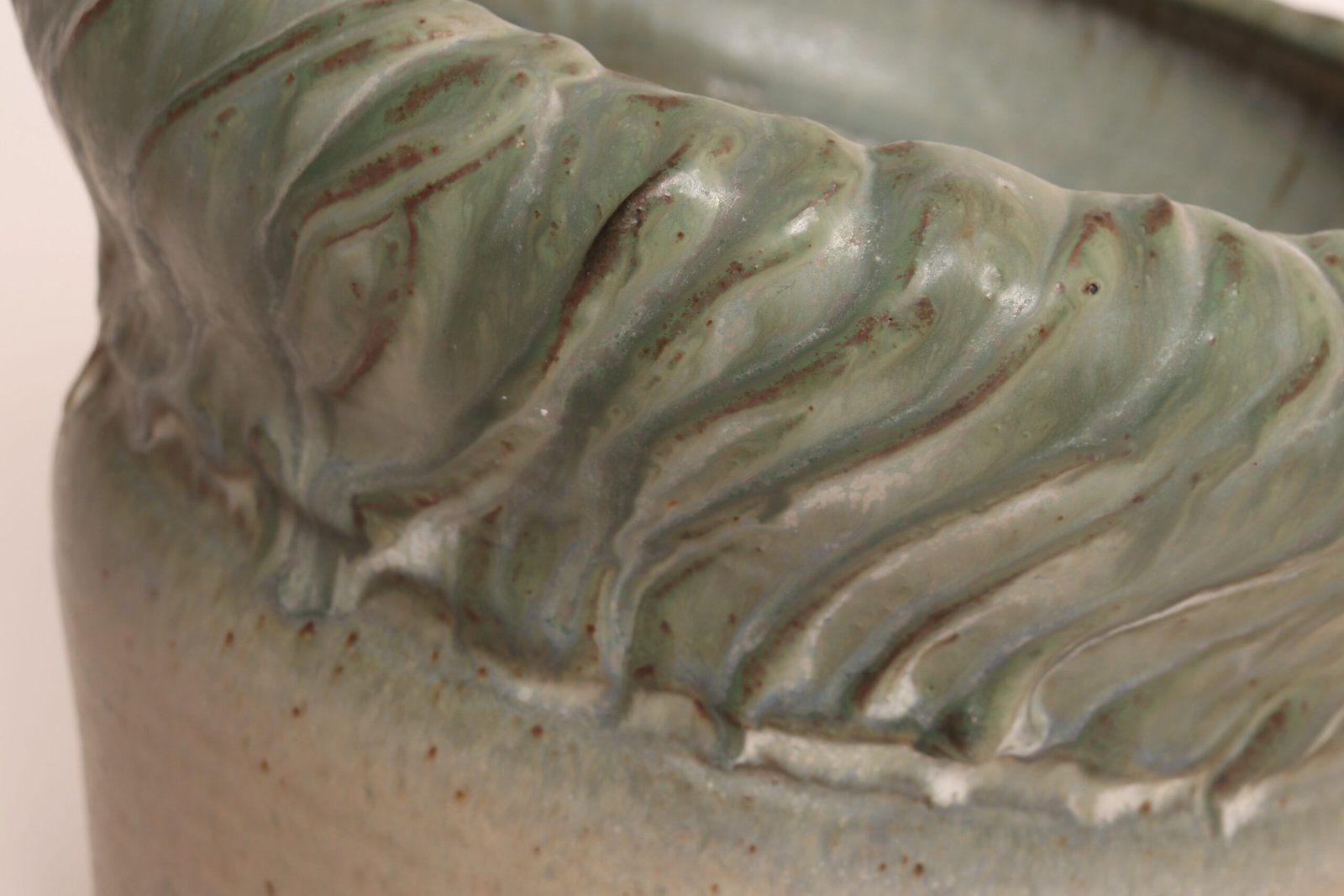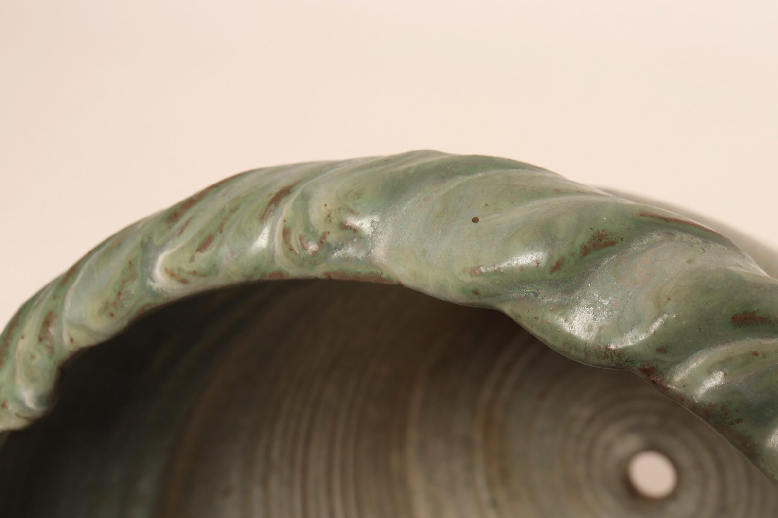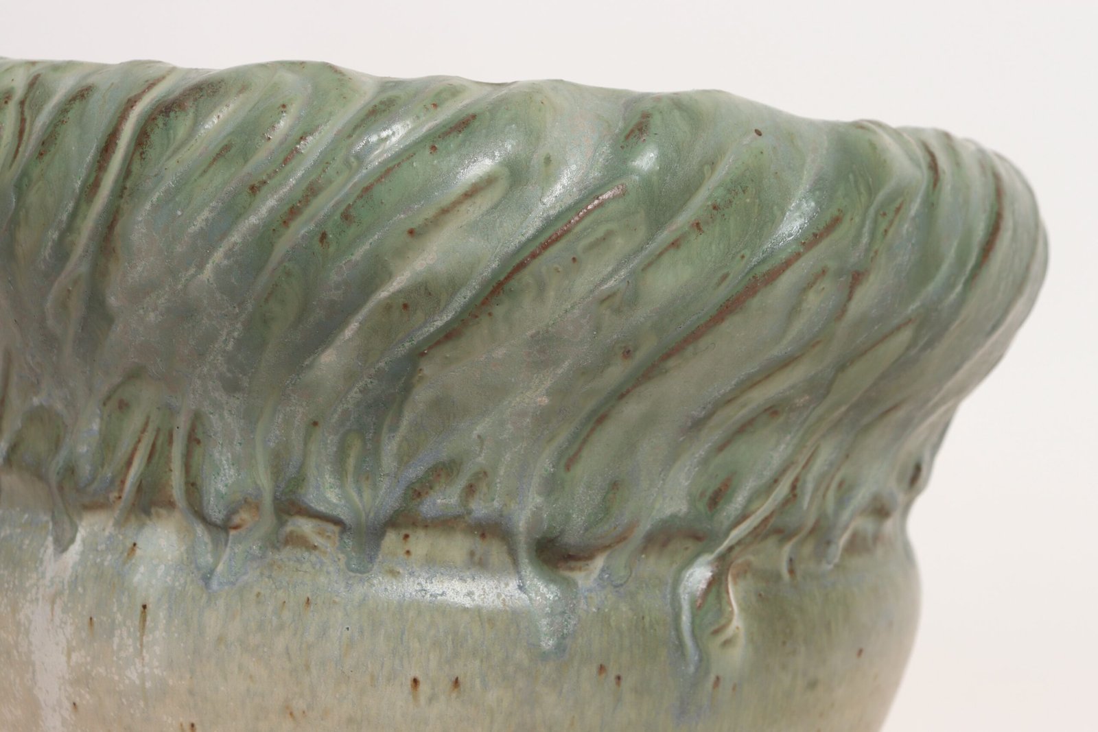 Circa 1979 studio piece featuring a design reminiscent of the linear pattern and shape of certain plants. The rim decorated with incised sinuous lines protrudes out slightly from the vessel. Additionally, the matte green gives the piece a botanical quality.