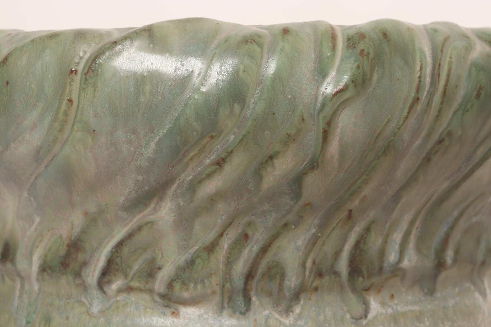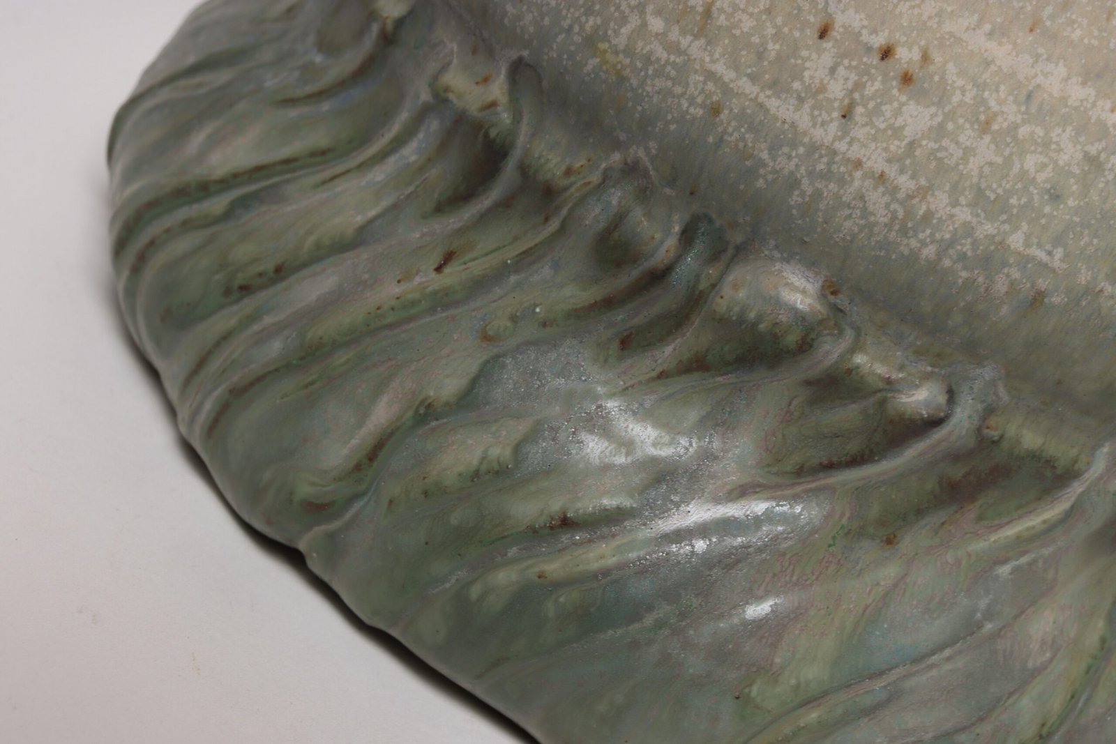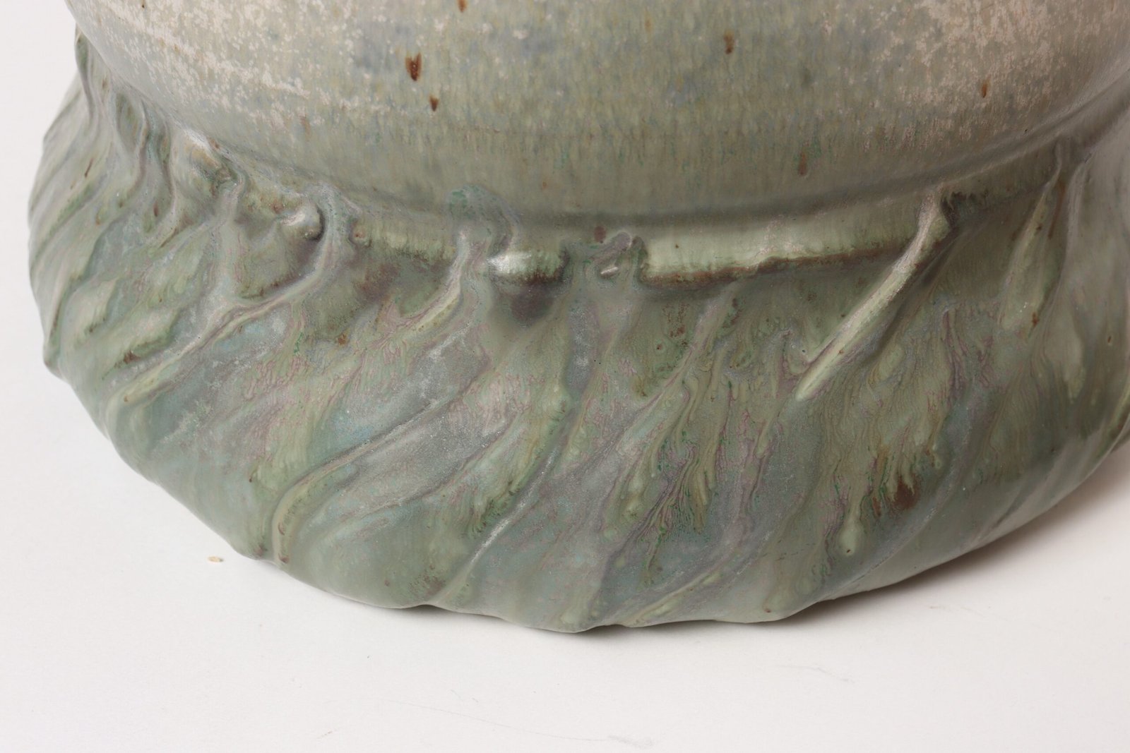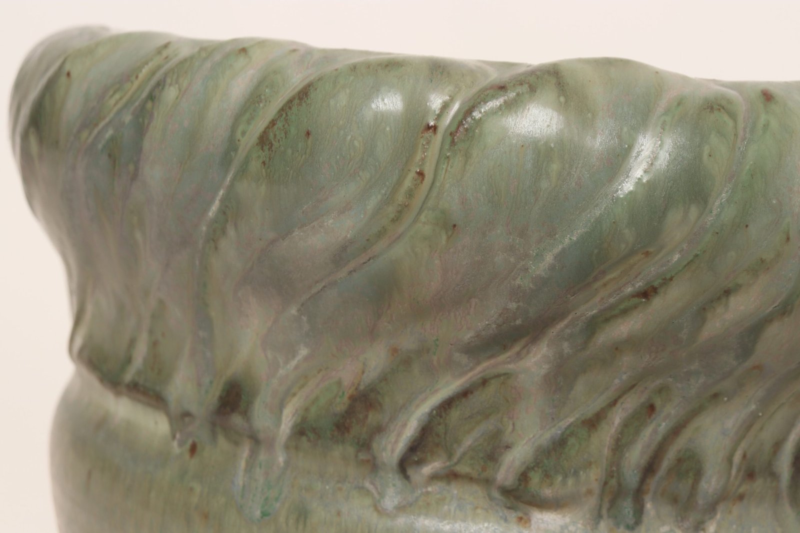 Circa 1979 studio piece featuring a design reminiscent of the linear pattern and shape of certain plants. The rim decorated with incised sinuous lines protrudes out slightly from the vessel. Additionally, the matte green gives the piece a botanical quality.