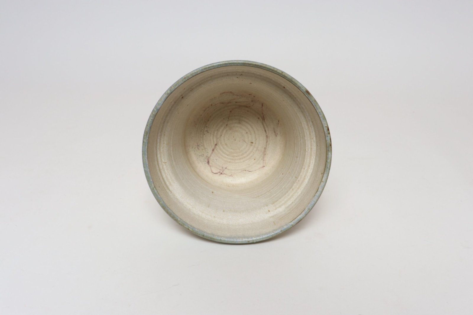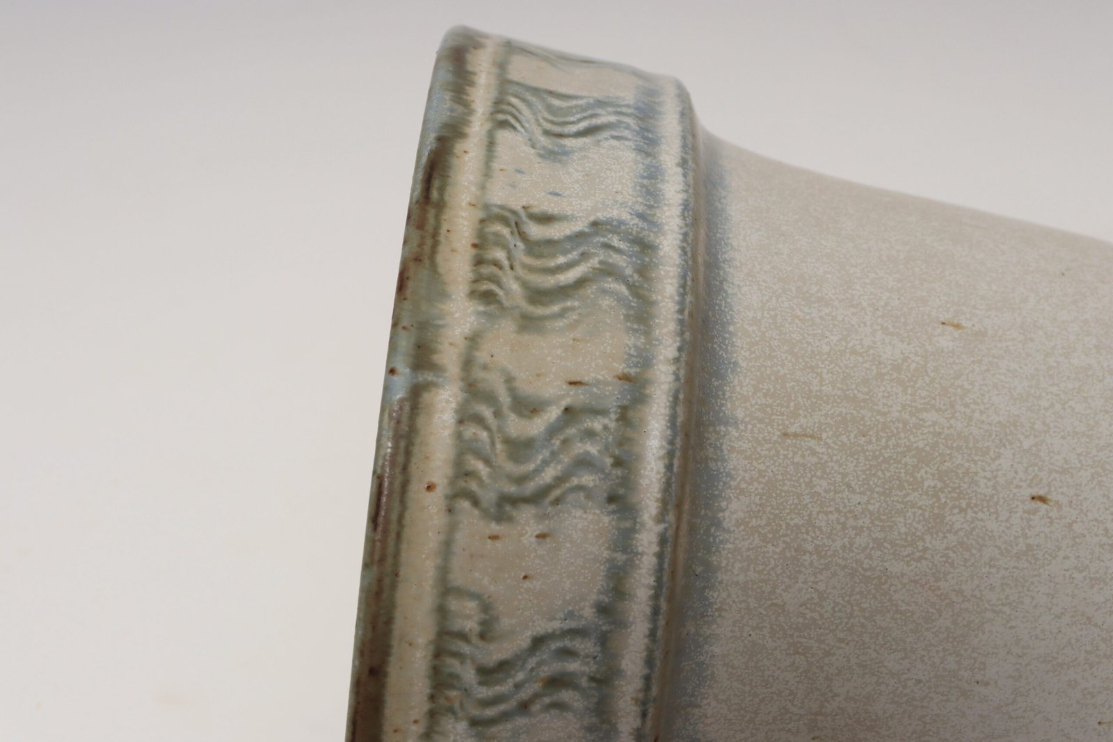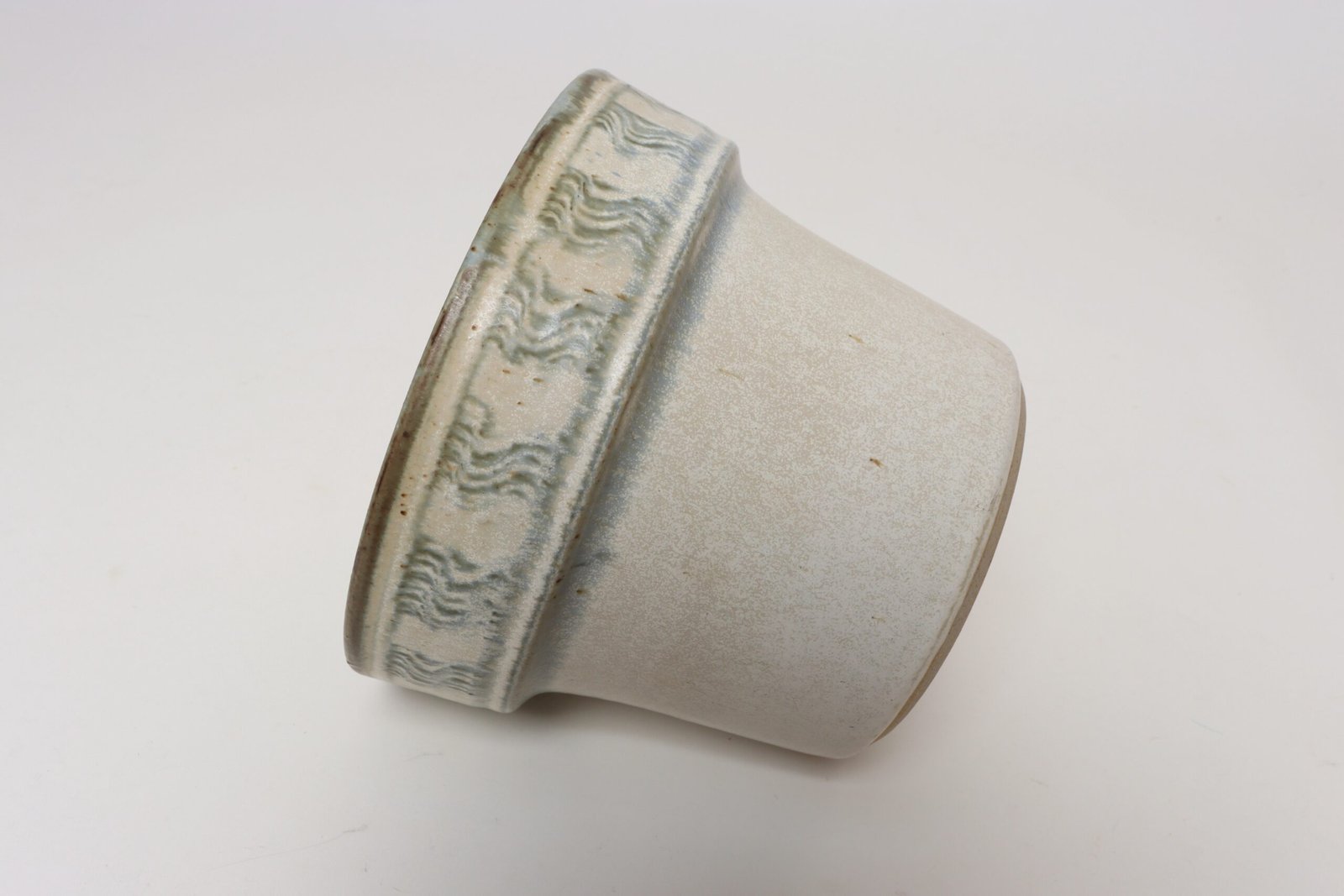 Circa 1979 studio piece with lightly speckled matte beige glaze with a sgraffito squiggle line motif in green and blue. Attractive color combination and pattern.