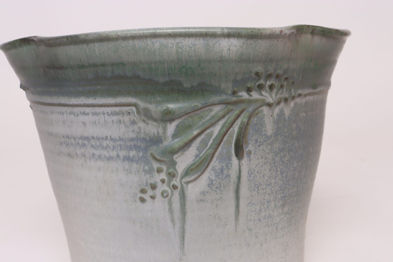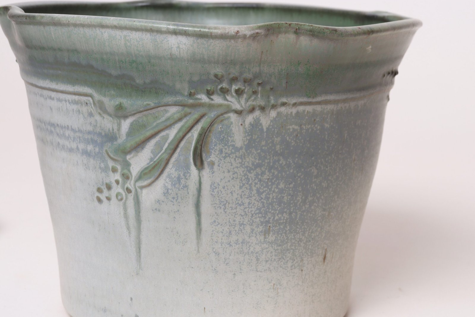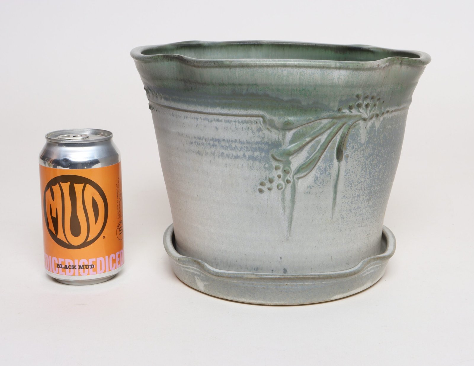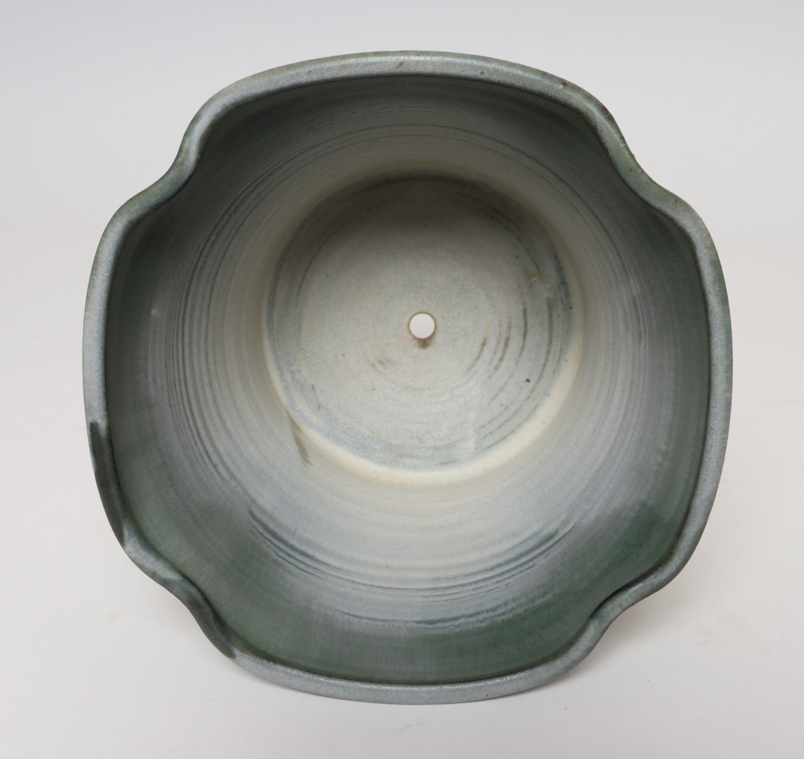 This piece dates to the early 1990s, based on the signature “D. Nichols,” which she used during that era and features an attractive variegated green and blue/gray glaze with incised plant decoration. Unusual shape — both planter and drainage plate where hand-shaped/pinched to create four-sided cruciforms.