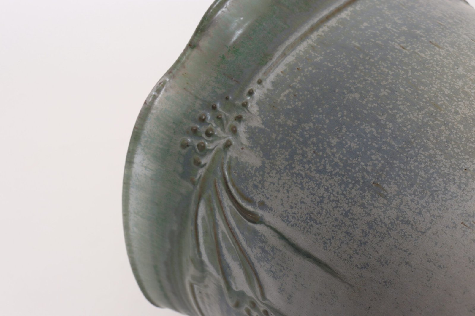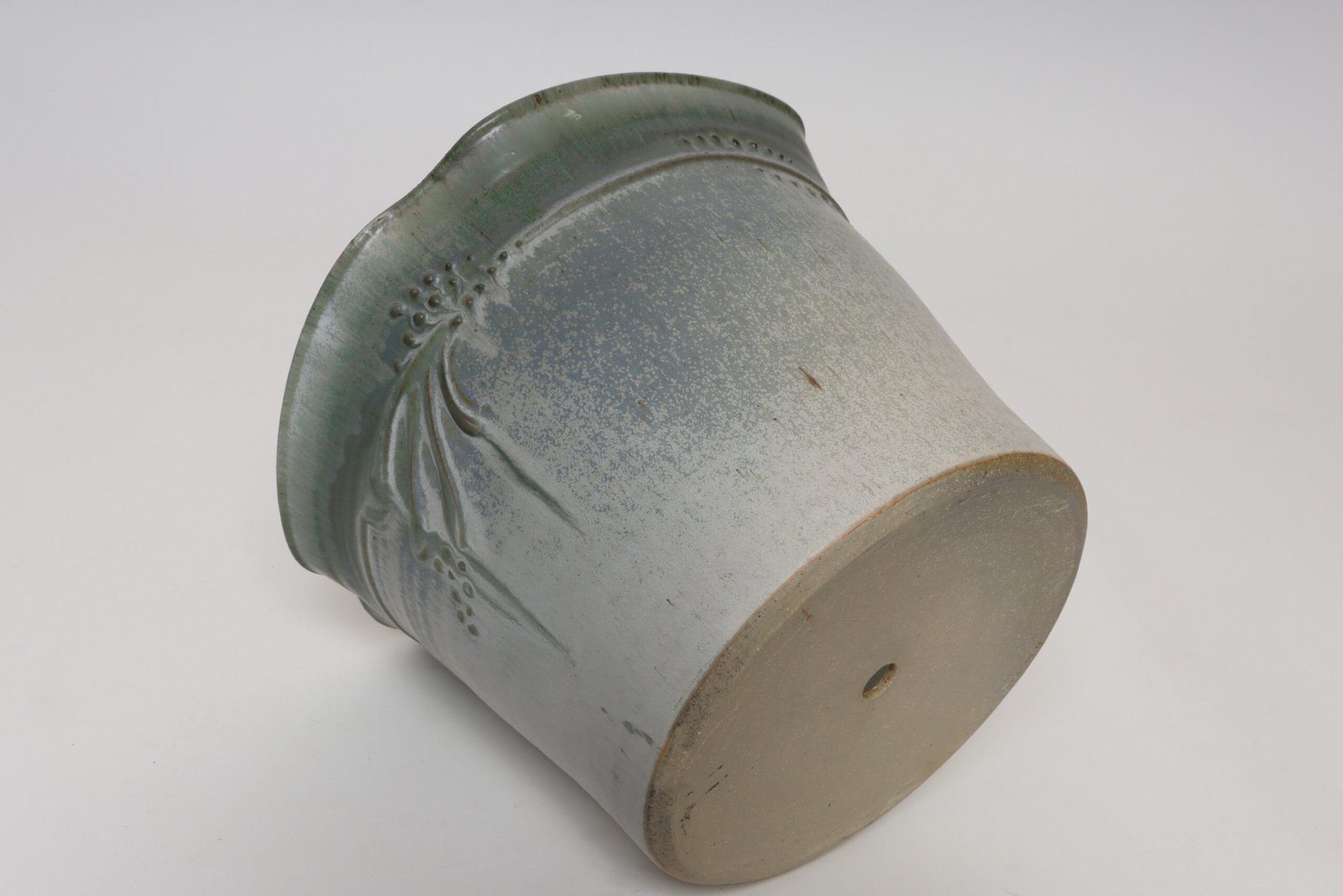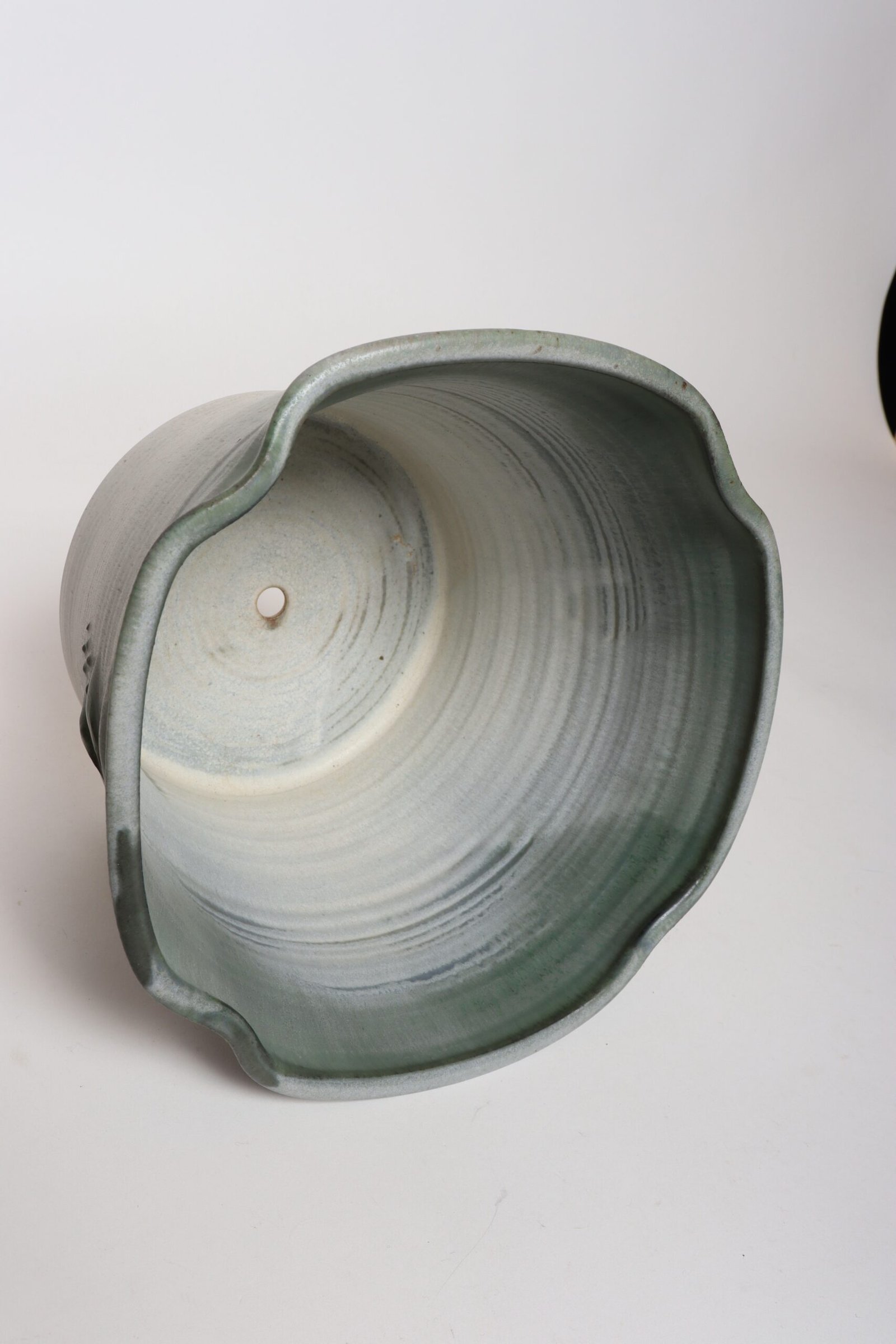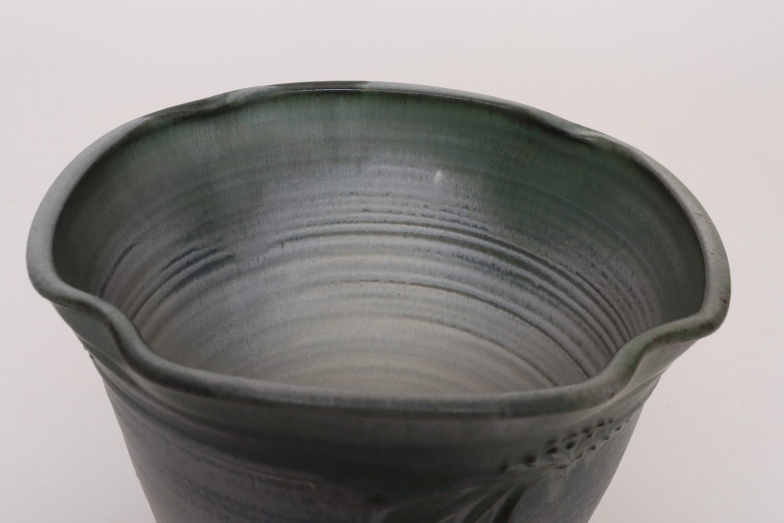 This piece dates to the early 1990s, based on the signature “D. Nichols,” which she used during that era and features an attractive variegated green and blue/gray glaze with incised plant decoration. Unusual shape — both planter and drainage plate where hand-shaped/pinched to create four-sided cruciforms.