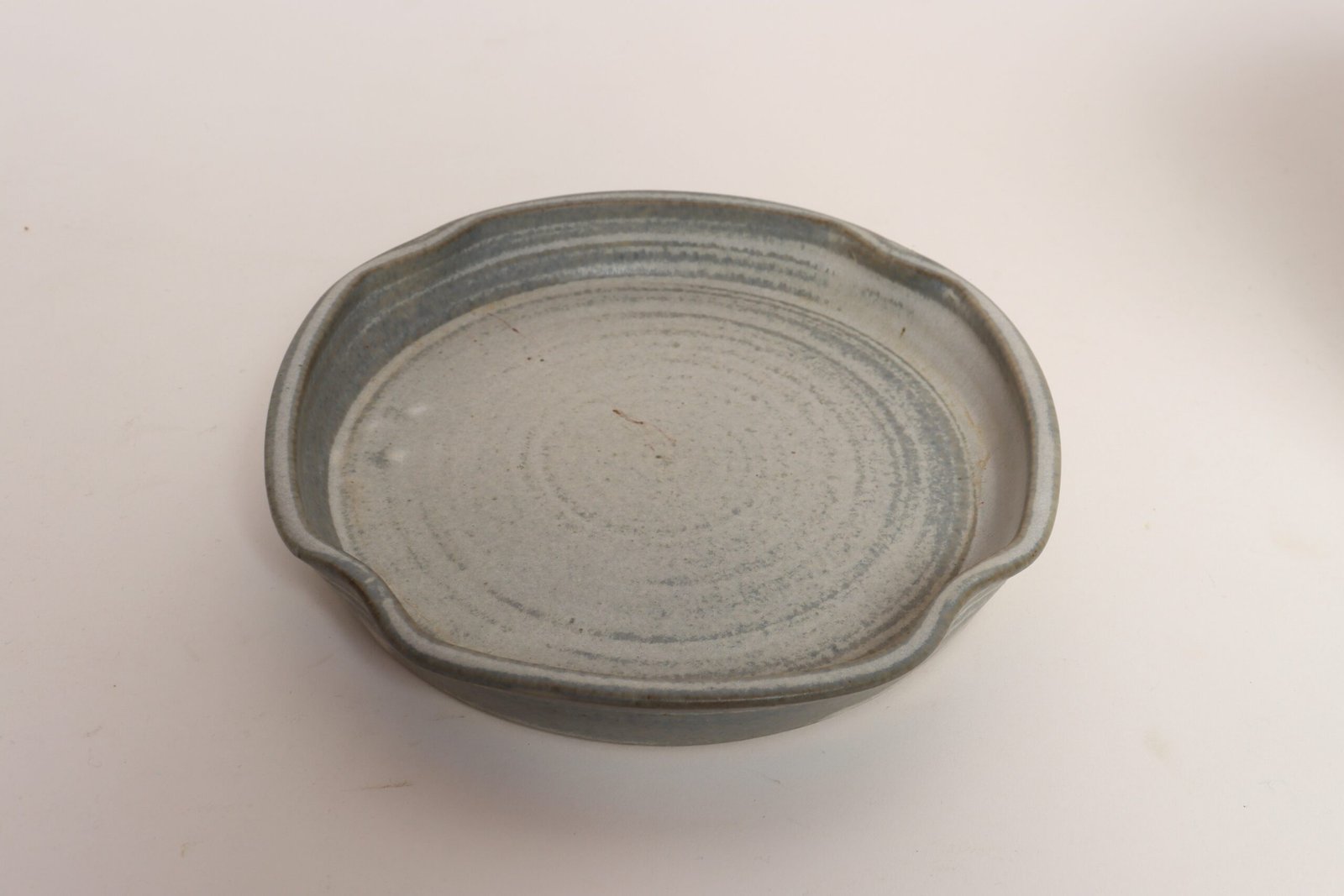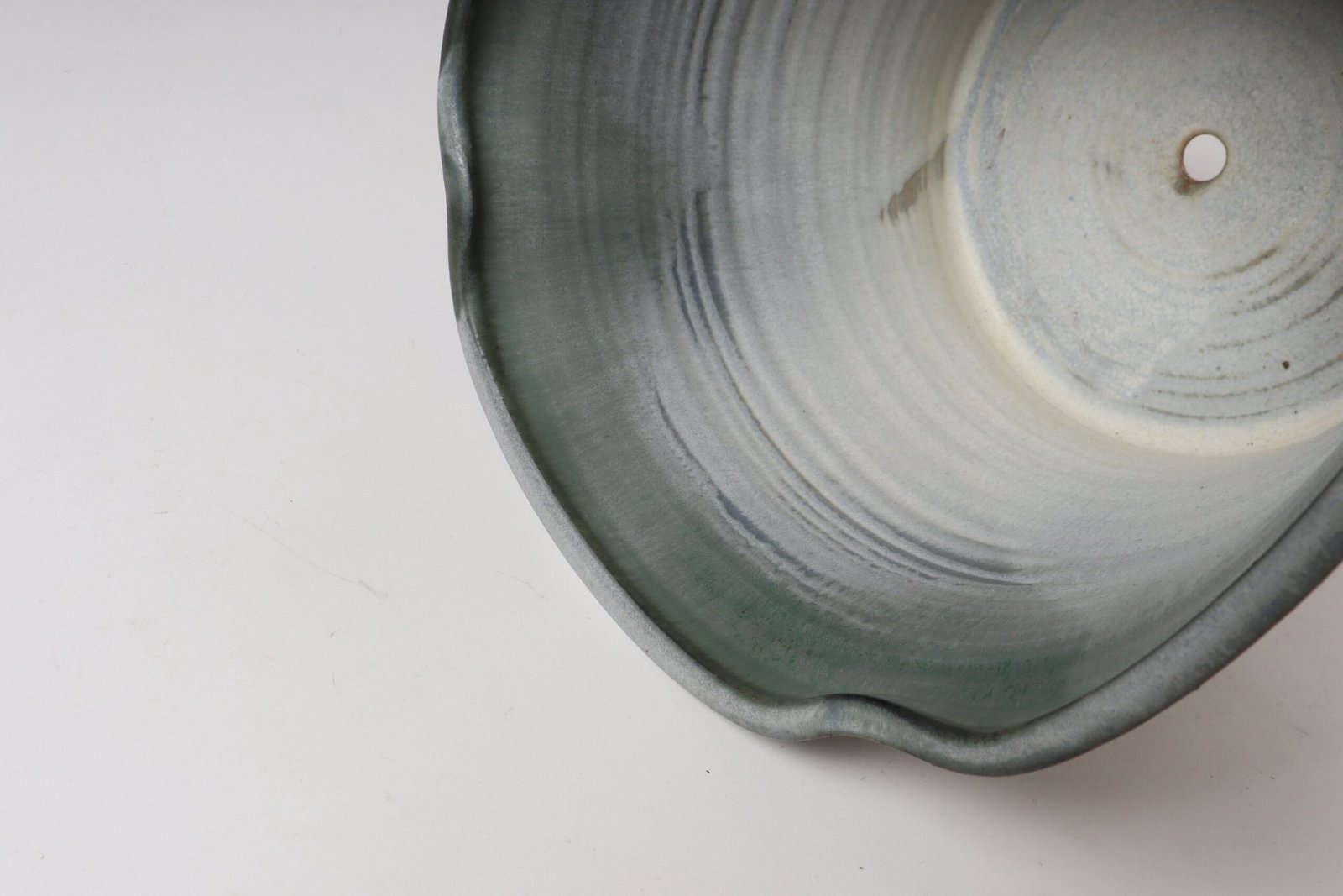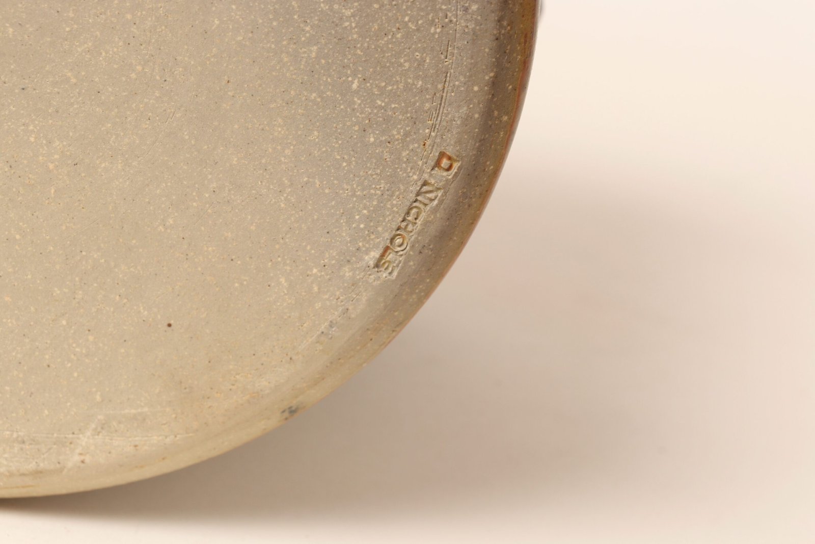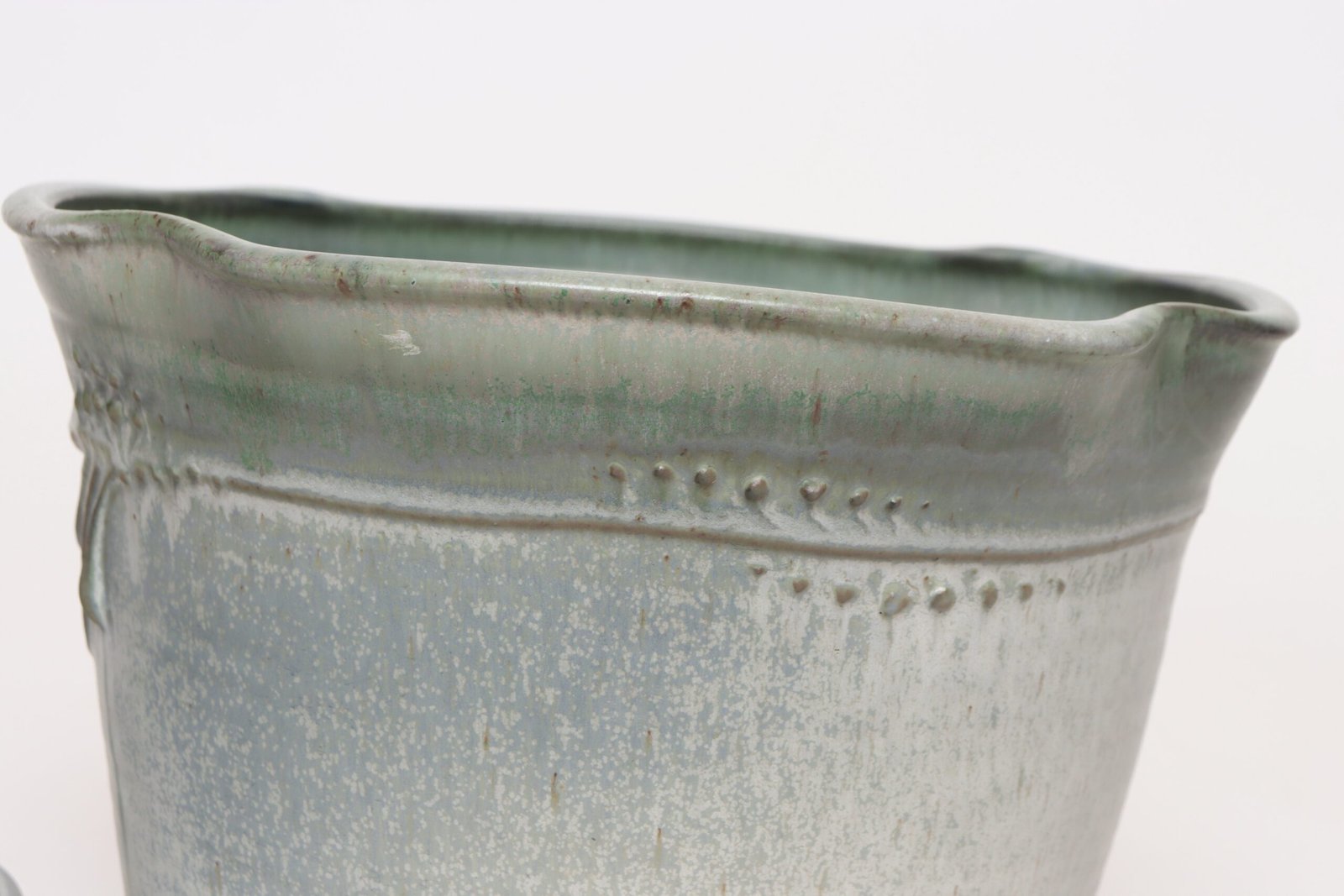This piece dates to the early 1990s, based on the signature “D. Nichols,” which she used during that era and features an attractive variegated green and blue/gray glaze with incised plant decoration. Unusual shape — both planter and drainage plate where hand-shaped/pinched to create four-sided cruciforms.