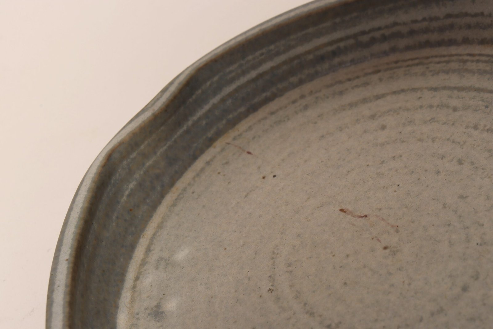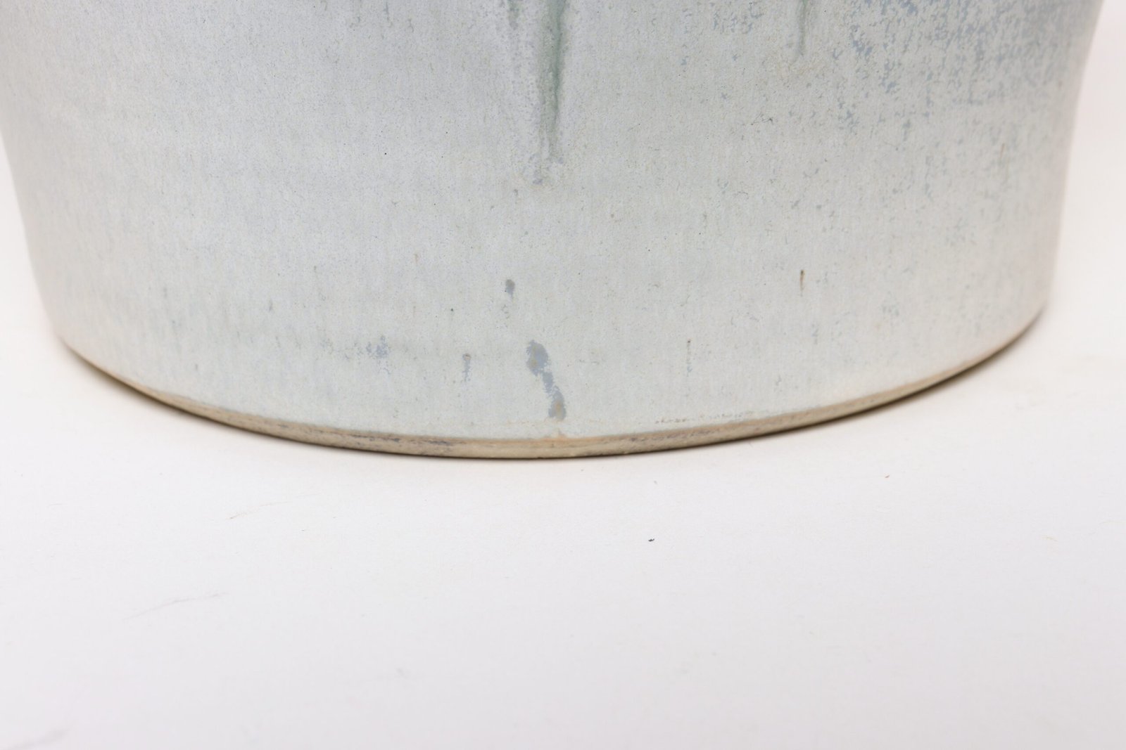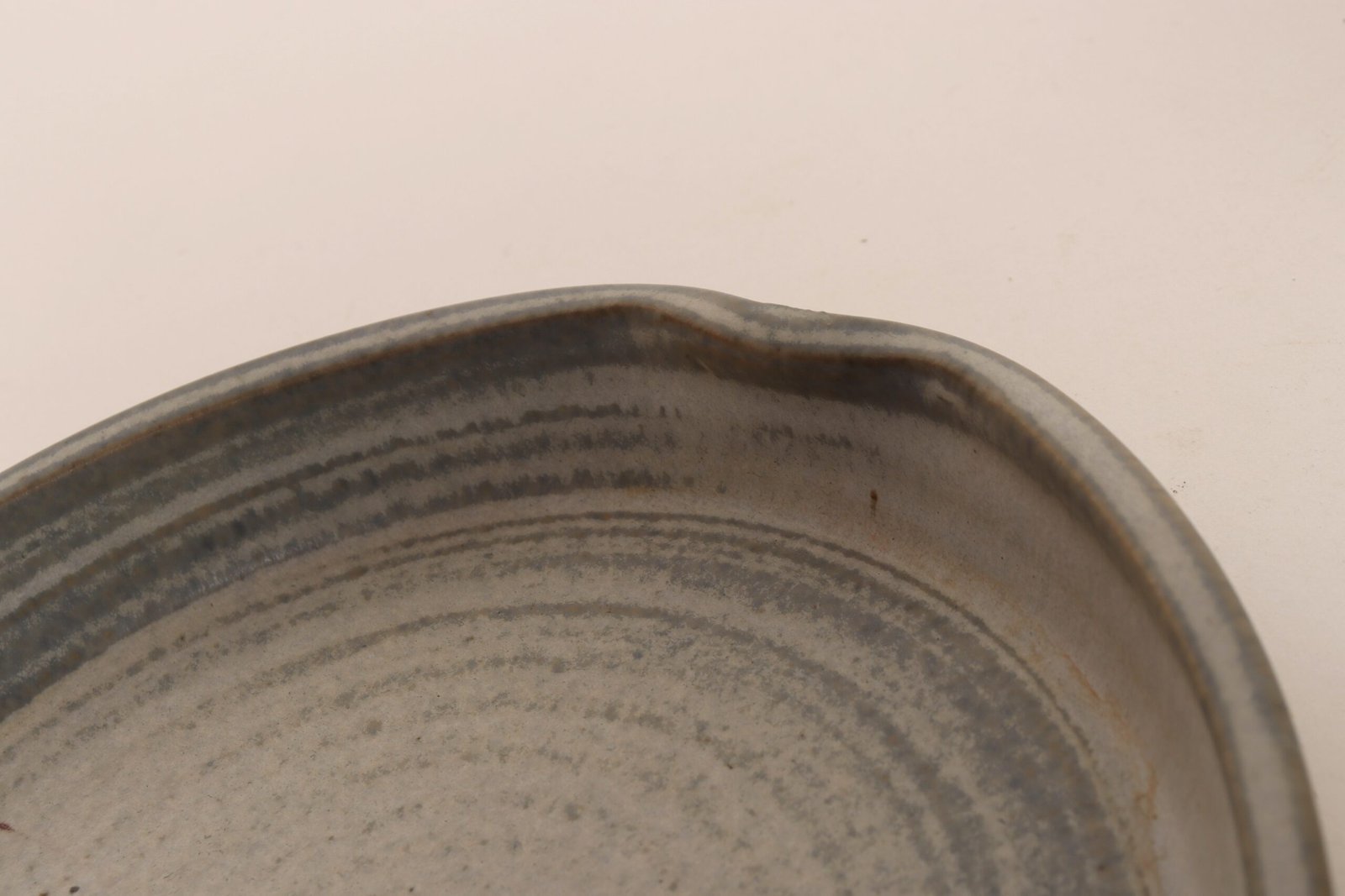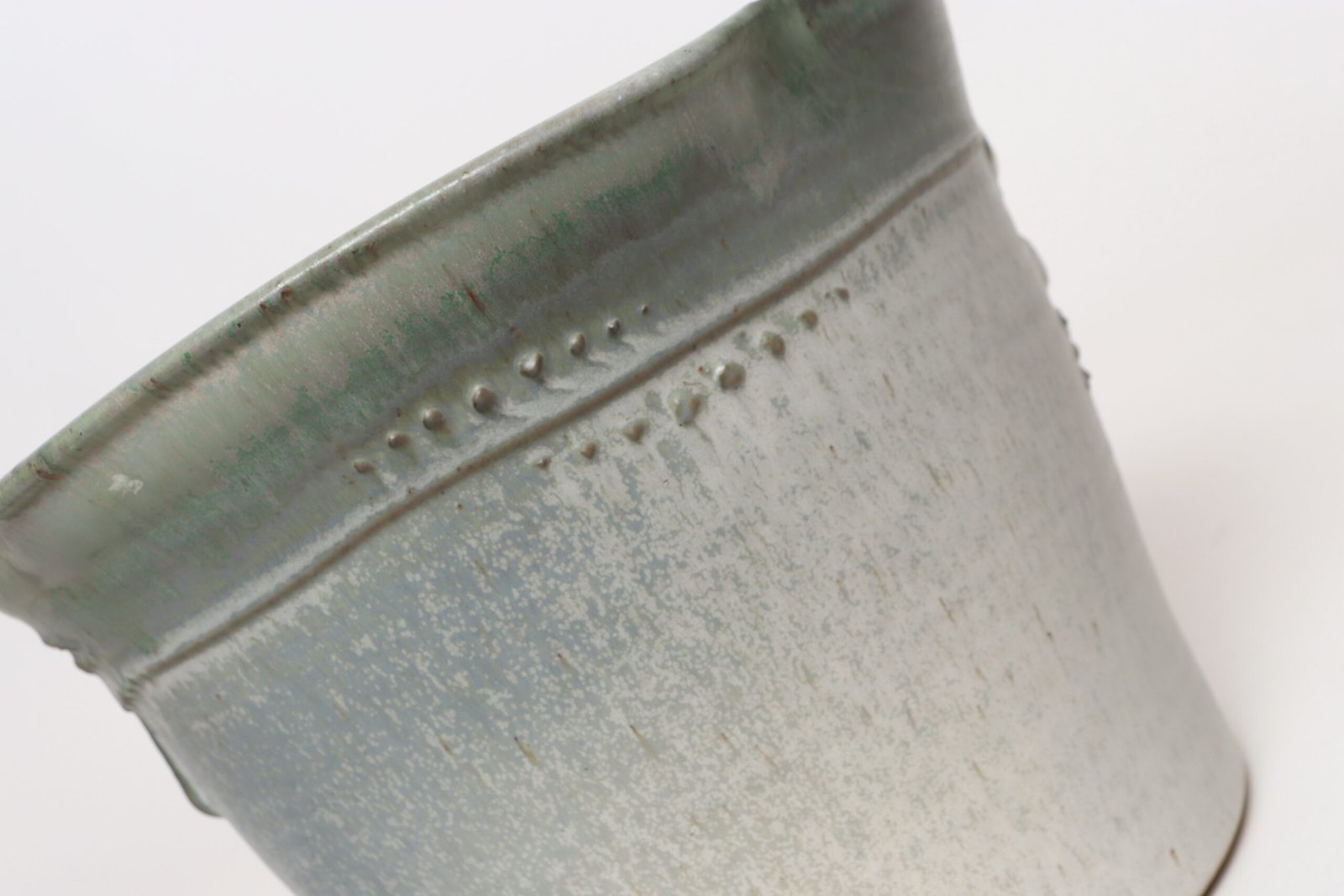 This piece dates to the early 1990s, based on the signature “D. Nichols,” which she used during that era and features an attractive variegated green and blue/gray glaze with incised plant decoration. Unusual shape — both planter and drainage plate where hand-shaped/pinched to create four-sided cruciforms.