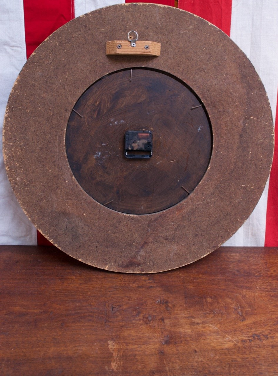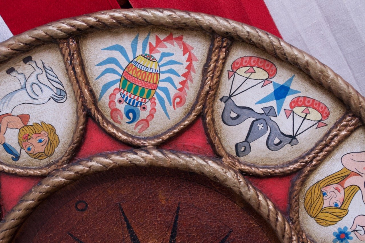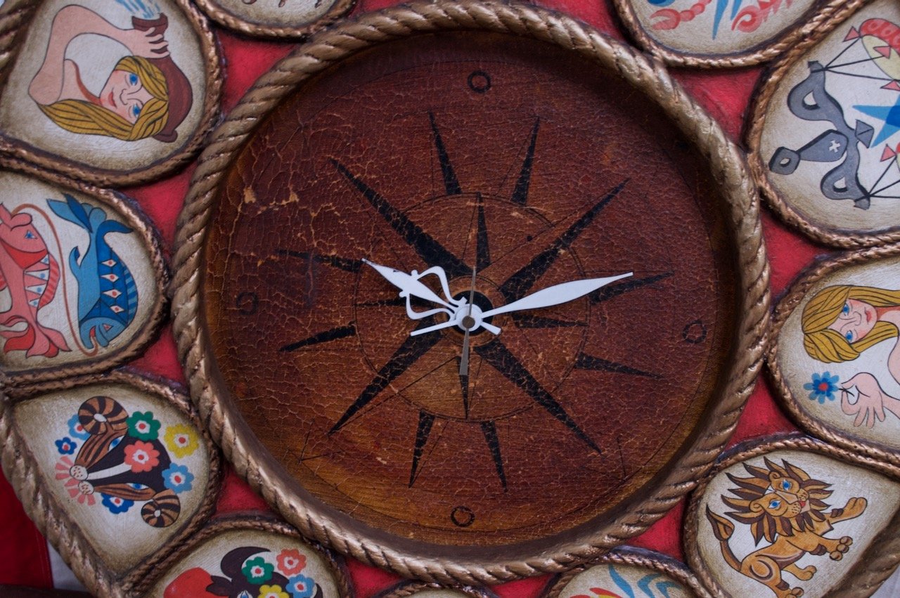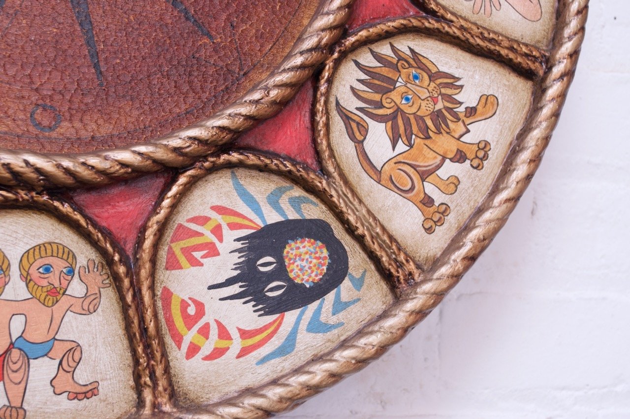 Very unique ca. 1970s American wall clock with delightfully designed and hand-illustrated zodiac symbols. Framed by gold-painted plaster borders with red, brown, black, and white accents.