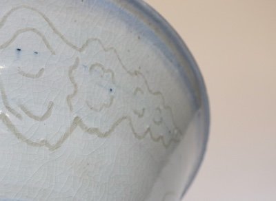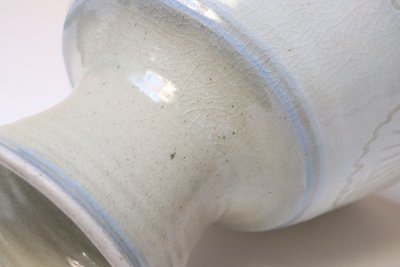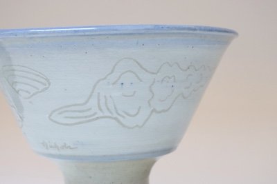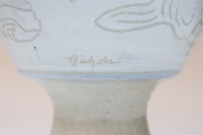 This studio piece dates to the early 1990s, based on the signature “D. Nichols,” which she used during that era and features an incised shell motif against sky blue and white glazes. Atypically whimsical for Nichols, who previously focused on abstract designs.