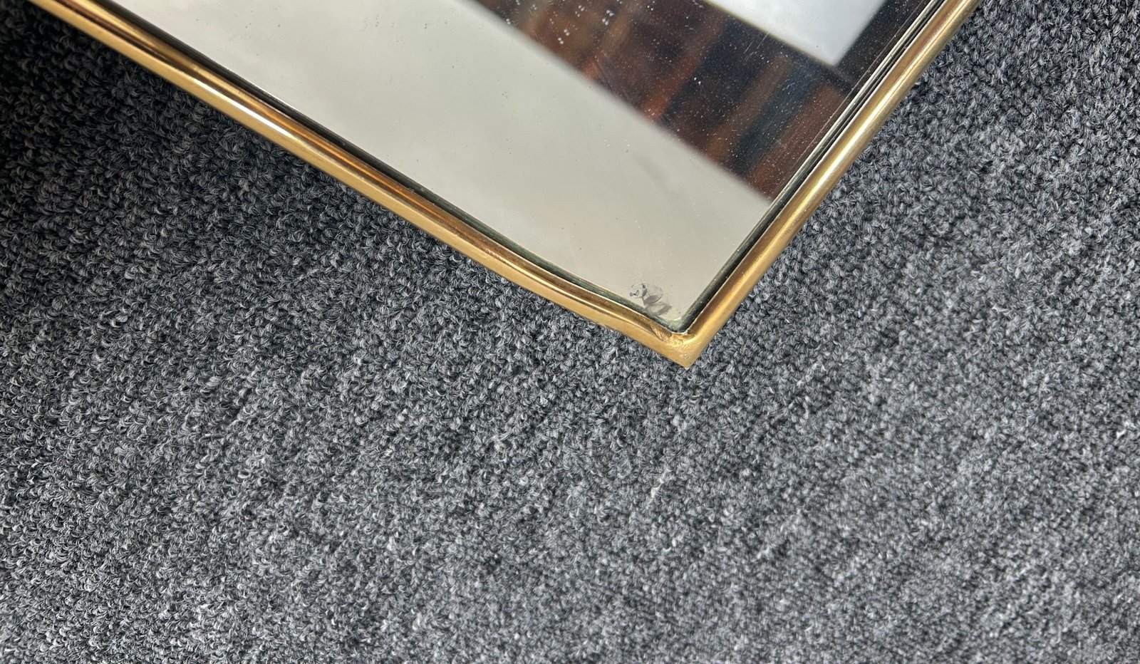 Overall, in very good, vintage condition. Glass shows one scratch towards the bottom and a few small desilvering spots, as photographed (naturally occurring imperfections from age/use — glass still provides a clear reflection). Polished brass shows natural patina and general wear, namely one small dent to lower right corner.