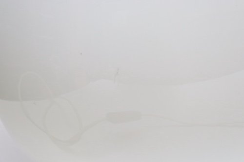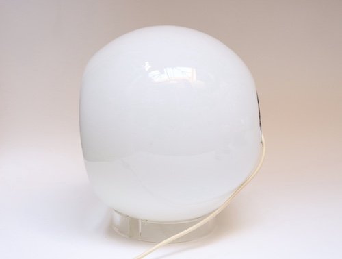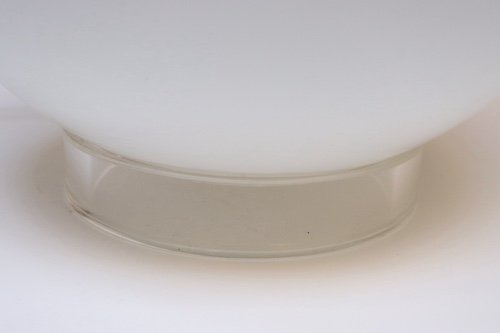 Impressive lamp giving off a soft, attractive glow composed of white opaline glass orb structure with inset mirror glass supported by a lucite ring base.