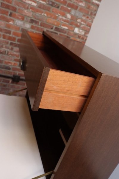 Composed of two stacked cabinets, the top including a shallow drawer above a drop-down hinged door opening to reveal open bar storage flanked by a single shelf. The lower cabinet features two hinged doors with a single, adjustable/removable shelf which can be raised 1″ or lowered 2″ from where it presently sits (as it is positioned, there is 9.88″ h space below the shelf and 11.25″ above).