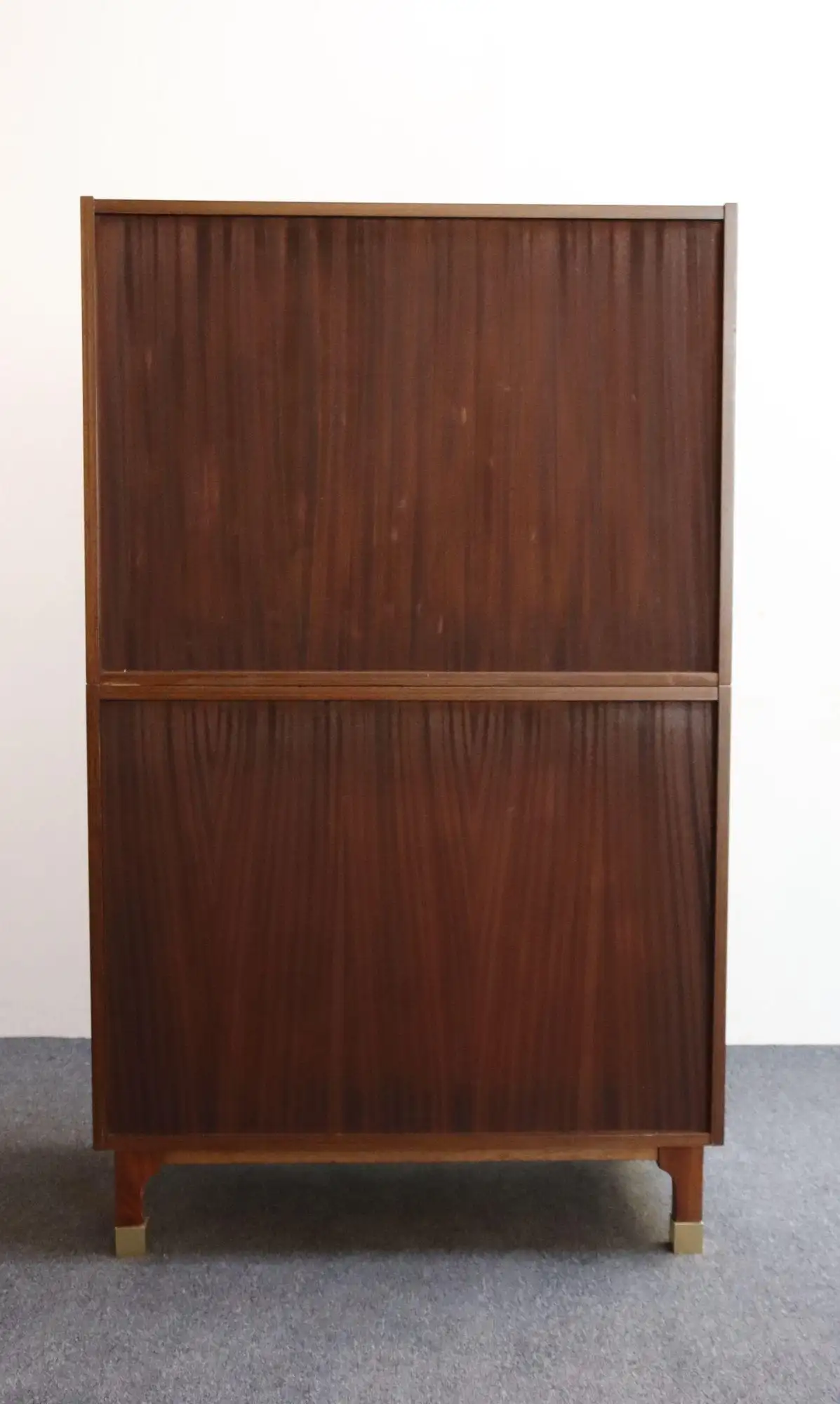 Vintage mahogany highboy bar cabinet with highly stylized anodized aluminum pulls and solid lacquered brass sabots by Longato Arredamenti of Padova (circa 1960s, Italy).