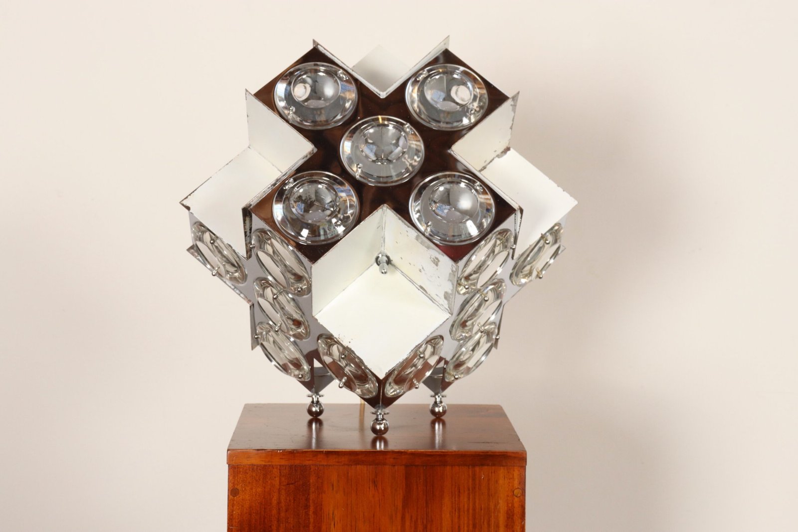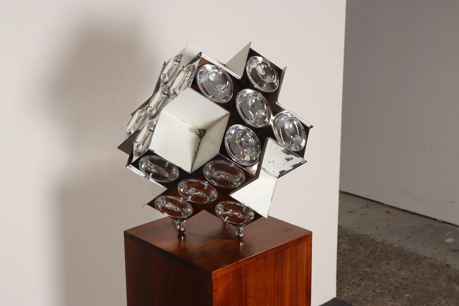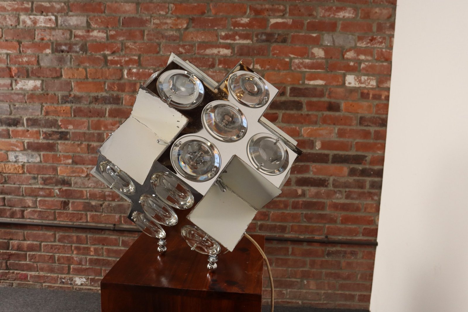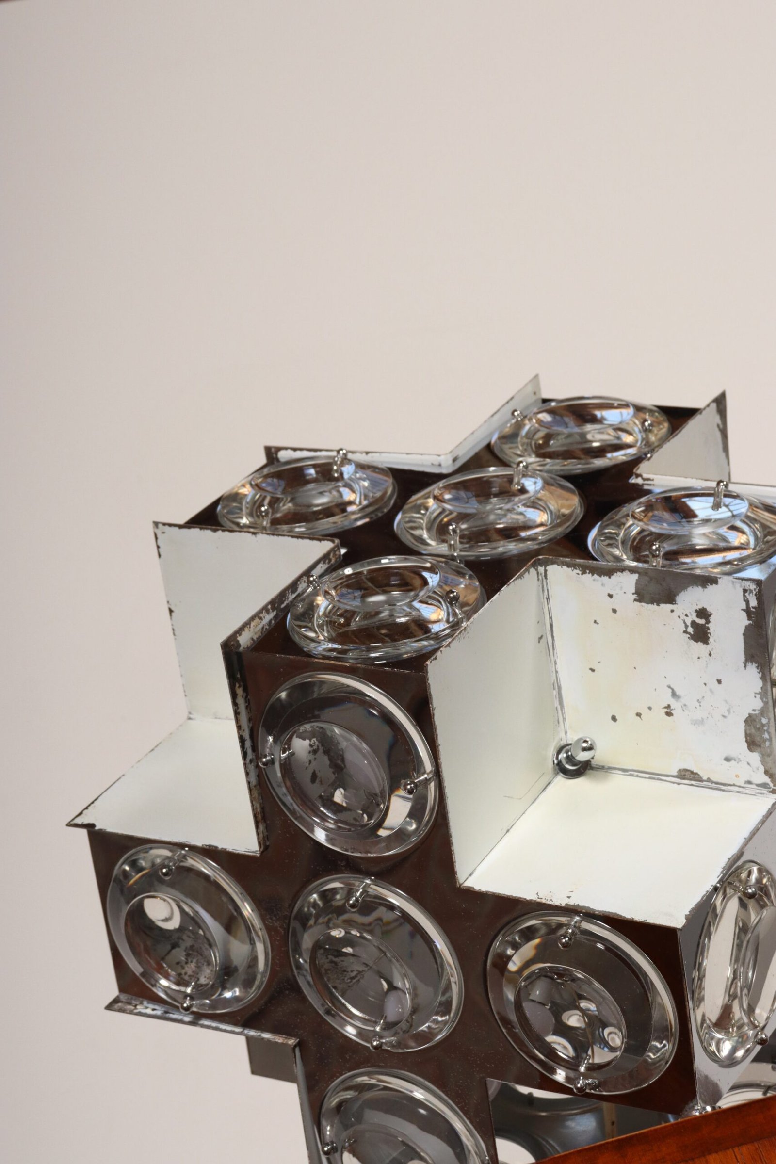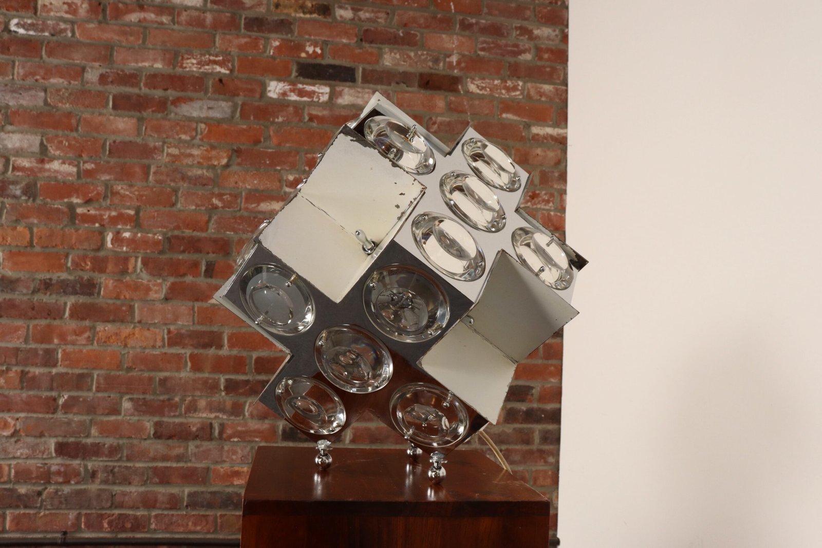Composed of an angled cube with chromed-steel cruciform/x-form surfaces each housing five optical cut beveled-glass lenses, all supported by a tripod base with orb-form feet. Corner sections each comprising three white enameled steel squares with sculptural chrome fasteners, which can individually be removed to access the interior sockets to replace bulbs.