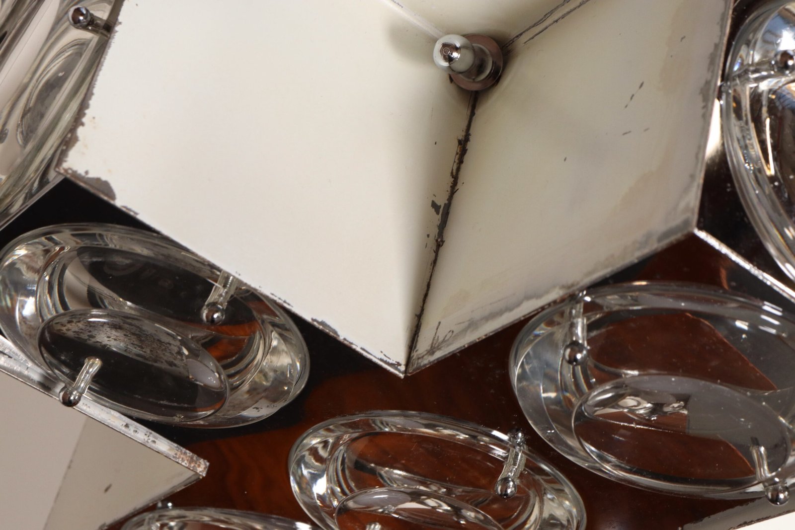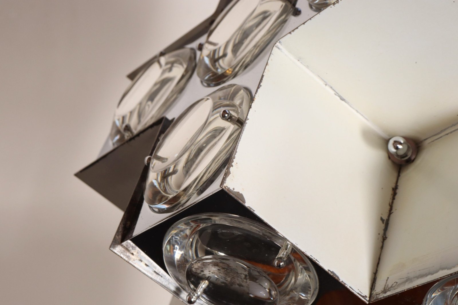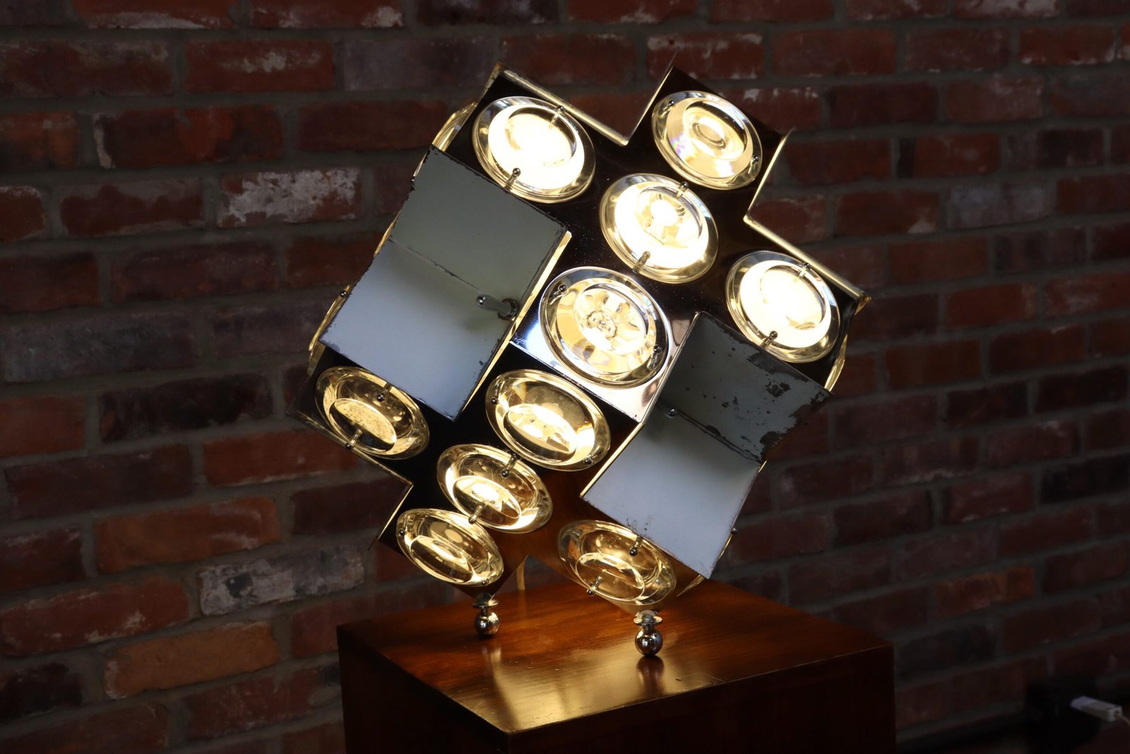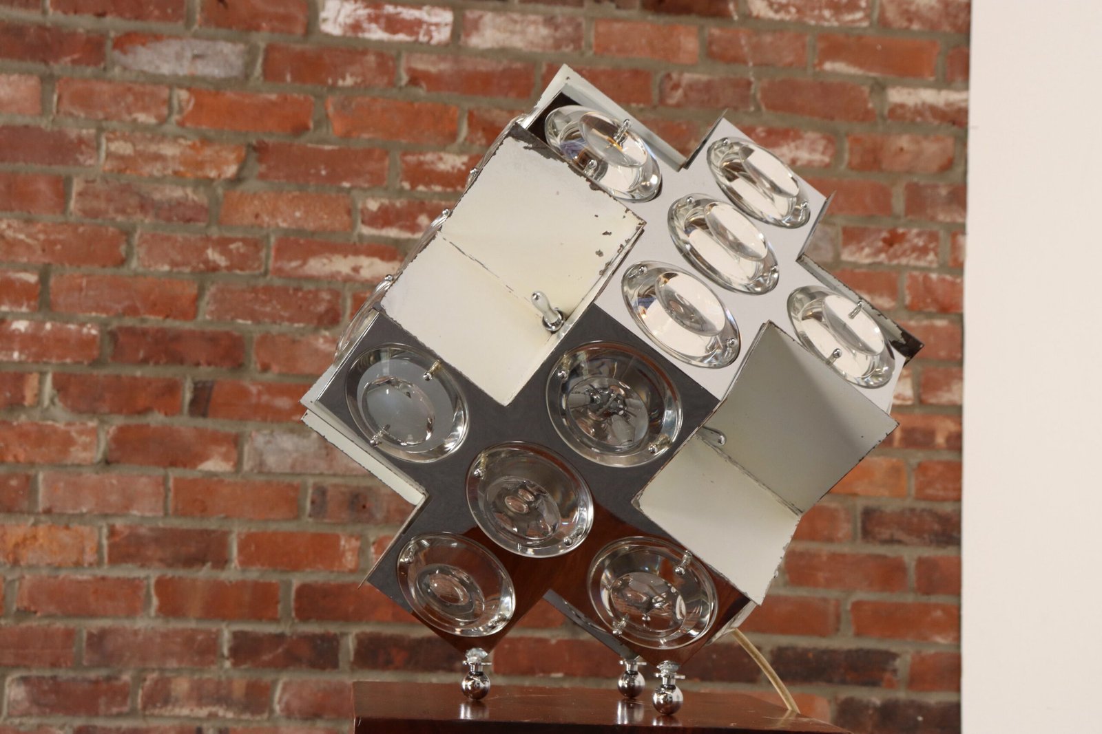 Composed of an angled cube with chromed-steel cruciform/x-form surfaces each housing five optical cut beveled-glass lenses, all supported by a tripod base with orb-form feet. Corner sections each comprising three white enameled steel squares with sculptural chrome fasteners, which can individually be removed to access the interior sockets to replace bulbs.