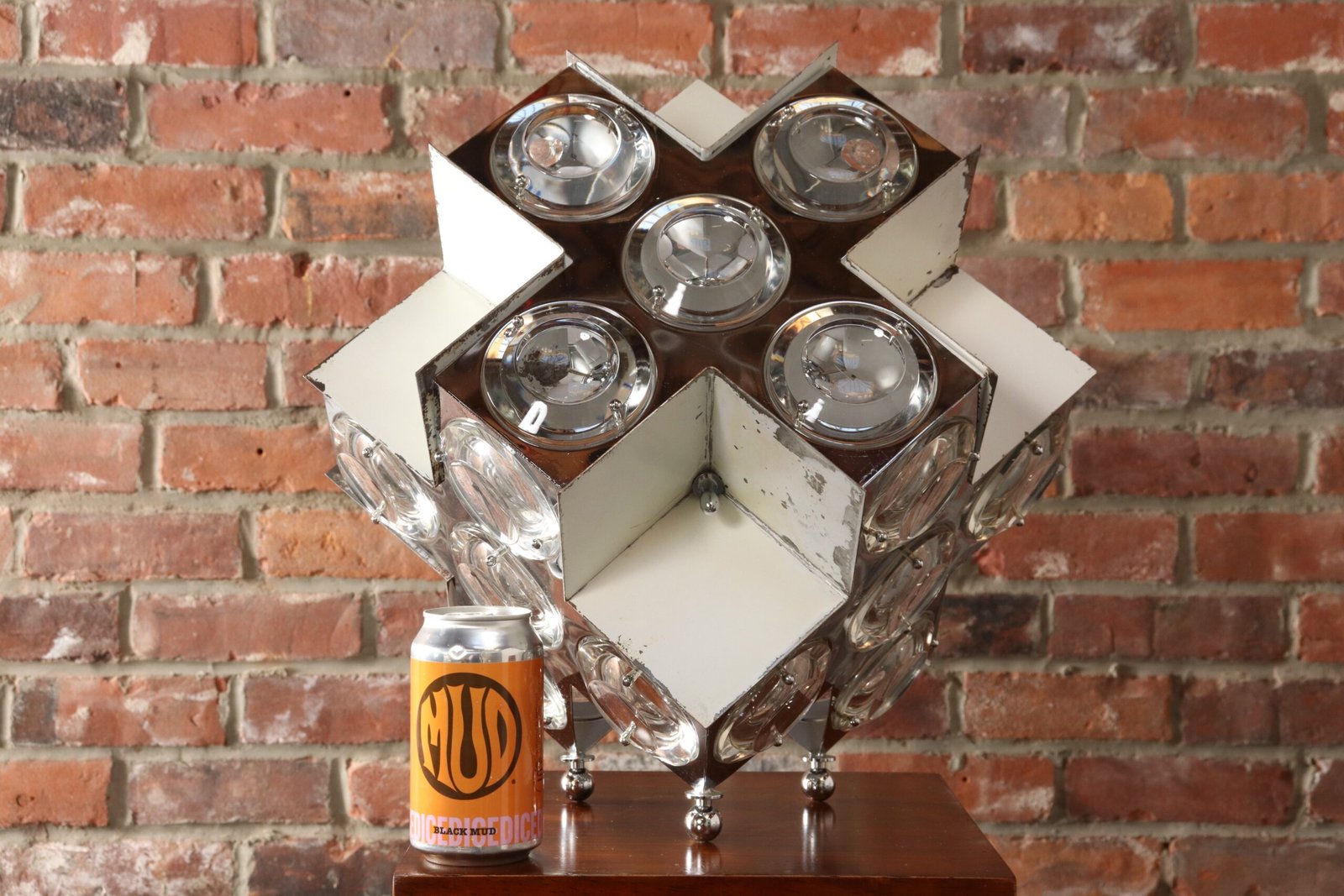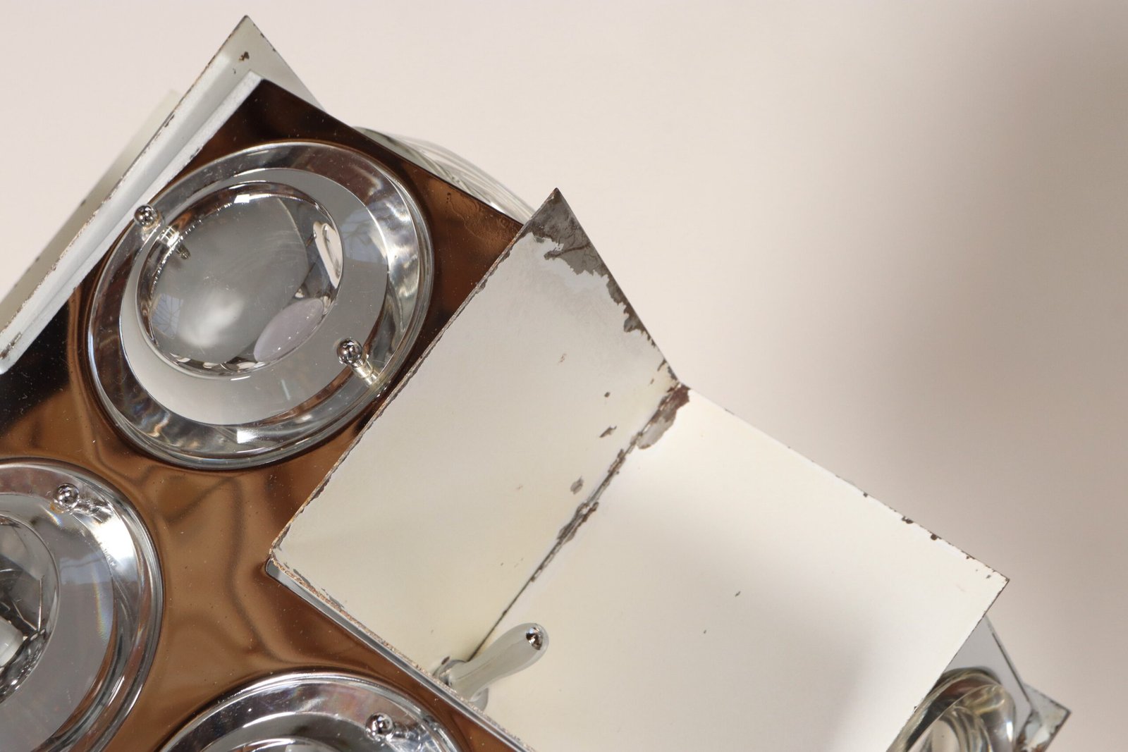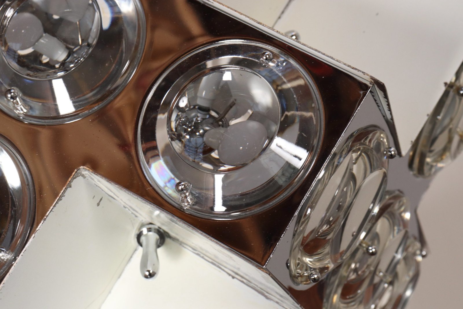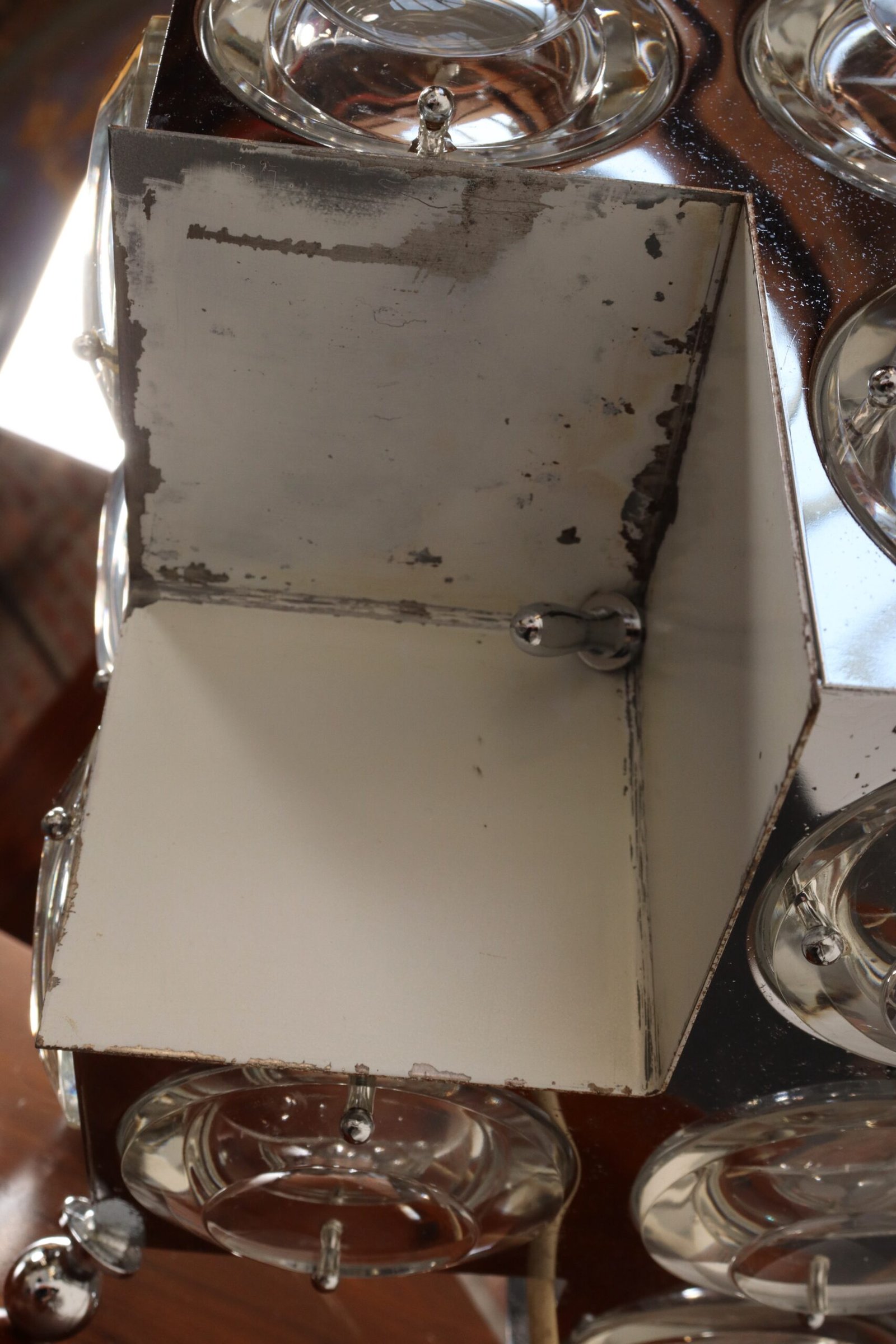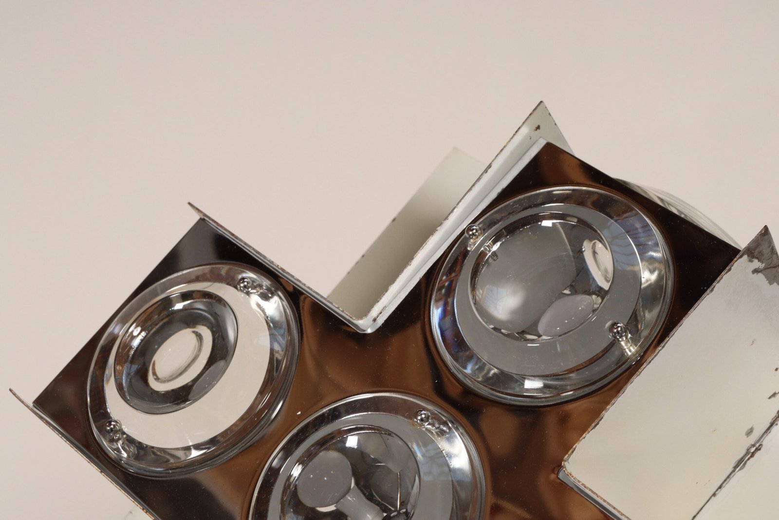 Composed of an angled cube with chromed-steel cruciform/x-form surfaces each housing five optical cut beveled-glass lenses, all supported by a tripod base with orb-form feet. Corner sections each comprising three white enameled steel squares with sculptural chrome fasteners, which can individually be removed to access the interior sockets to replace bulbs.
