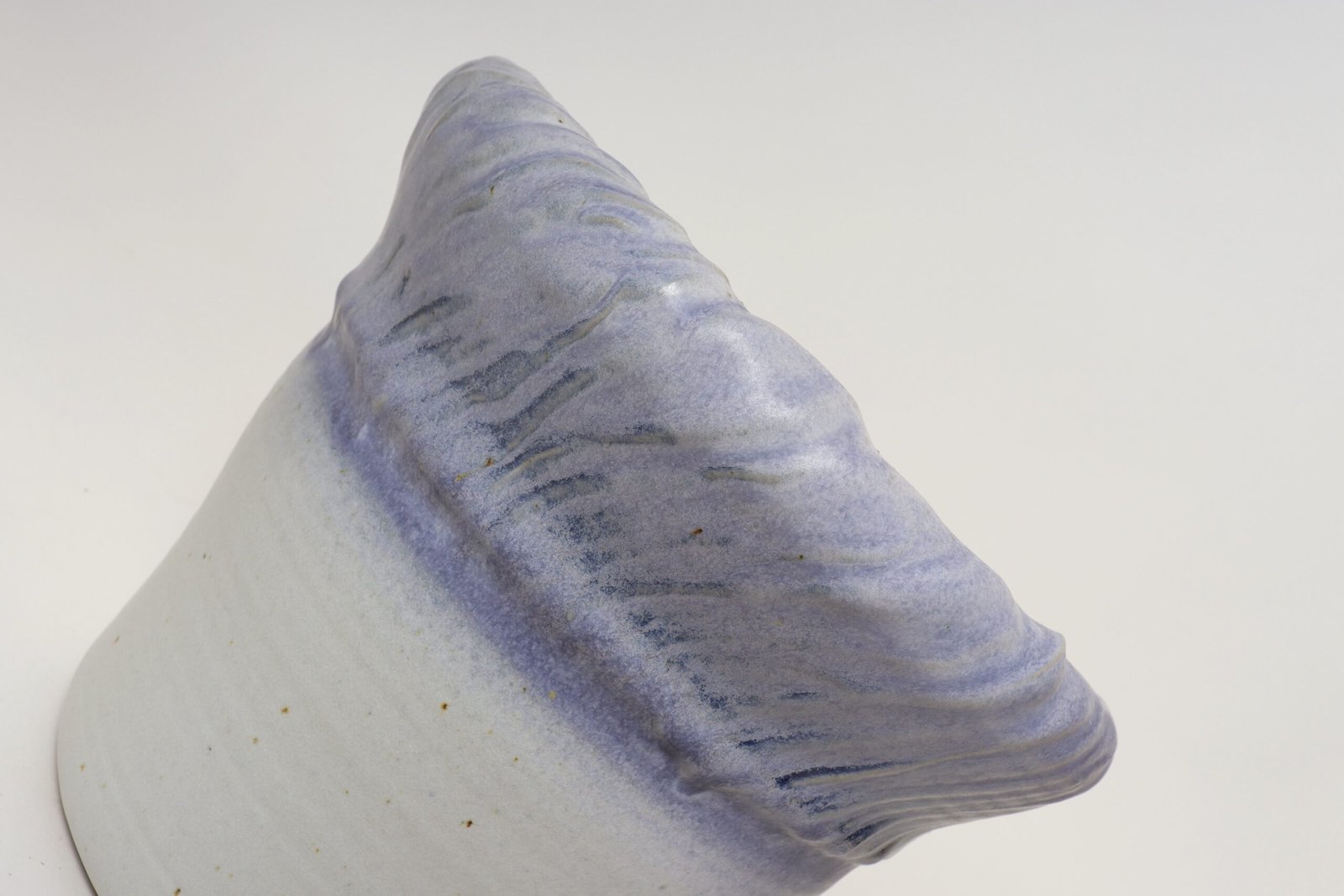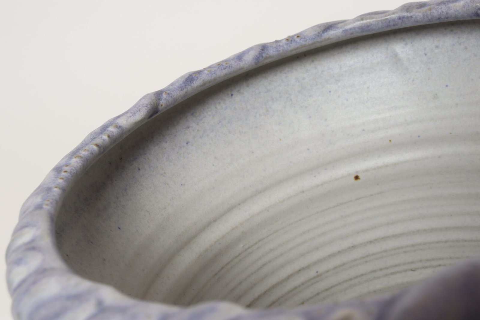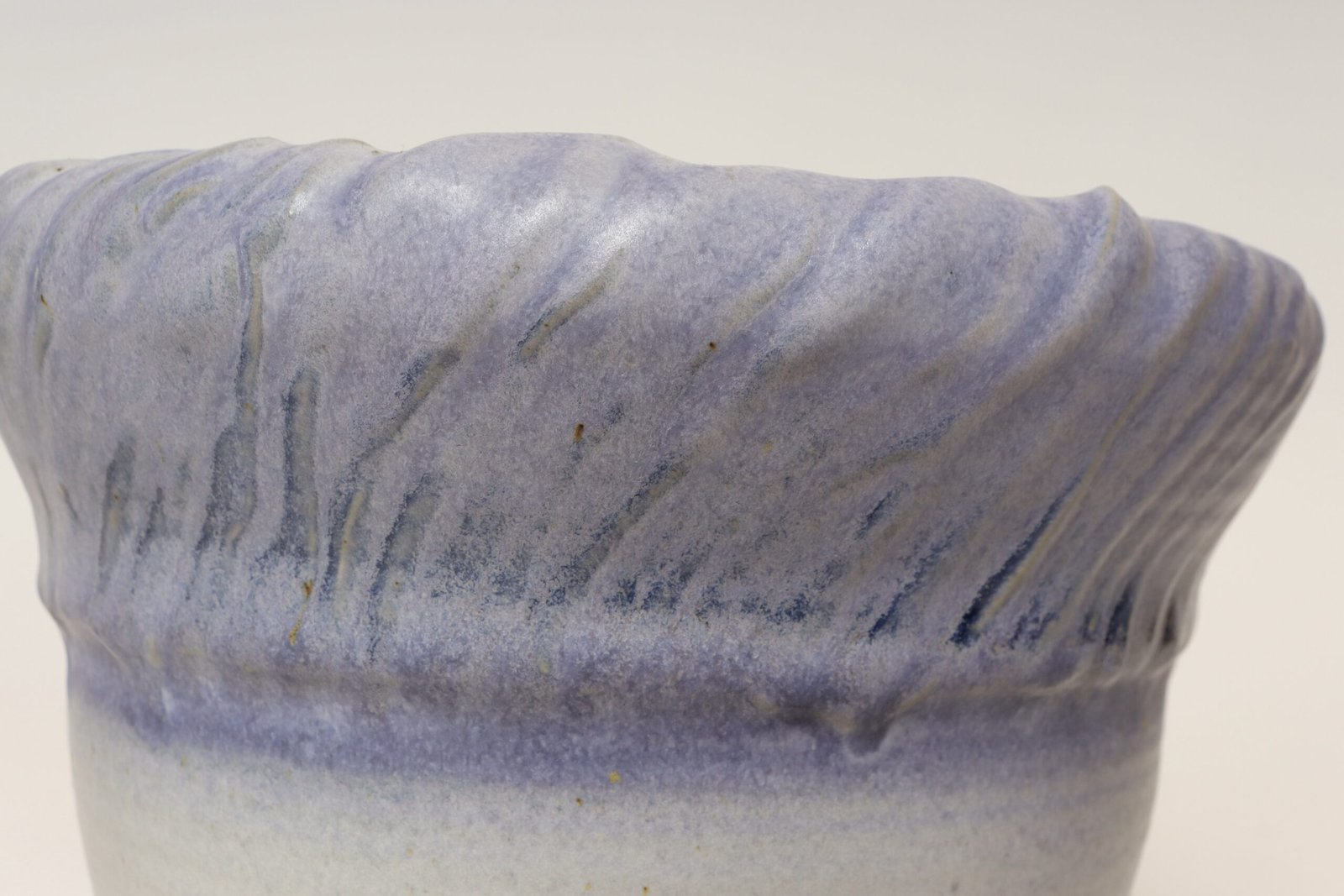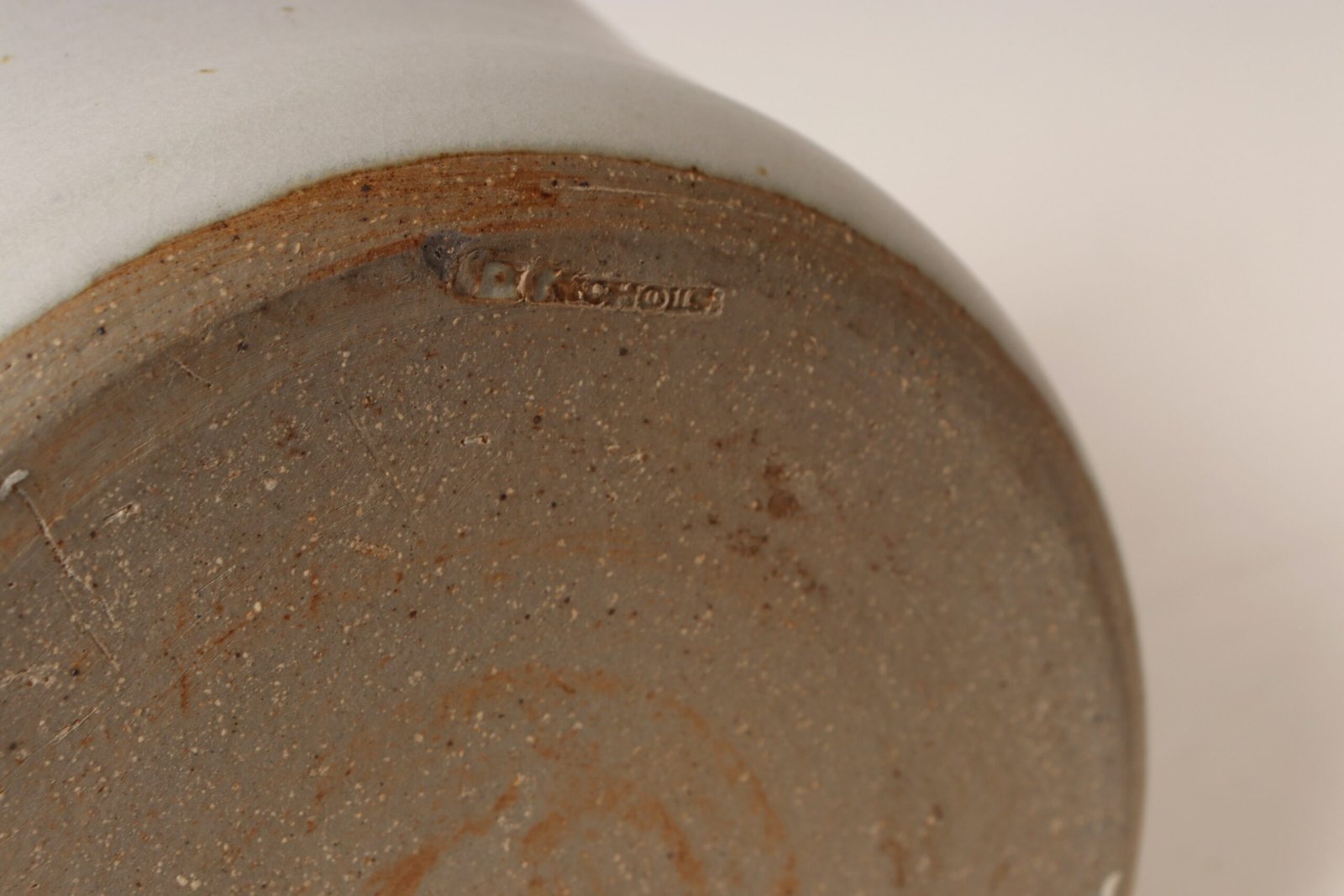 This piece dates to the early 1990s, based on the signature “D. Nichols,” which she used during that era and features a design reminiscent of the linear pattern and shape of certain sea shells. The rim decorated with incised sinuous lines protrudes out slightly from the vessel. Attractive pale gray color with lilac/periwinkle rim.