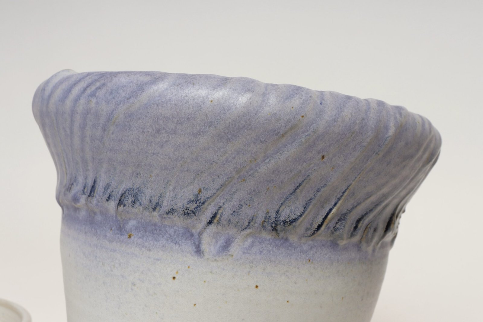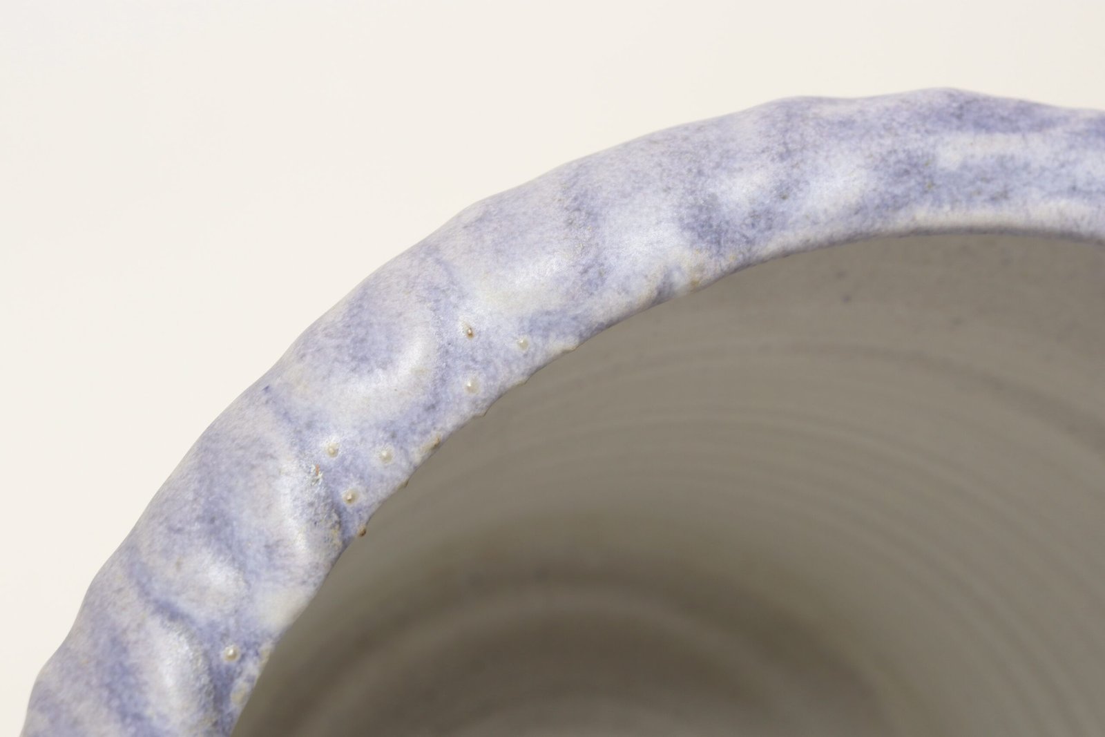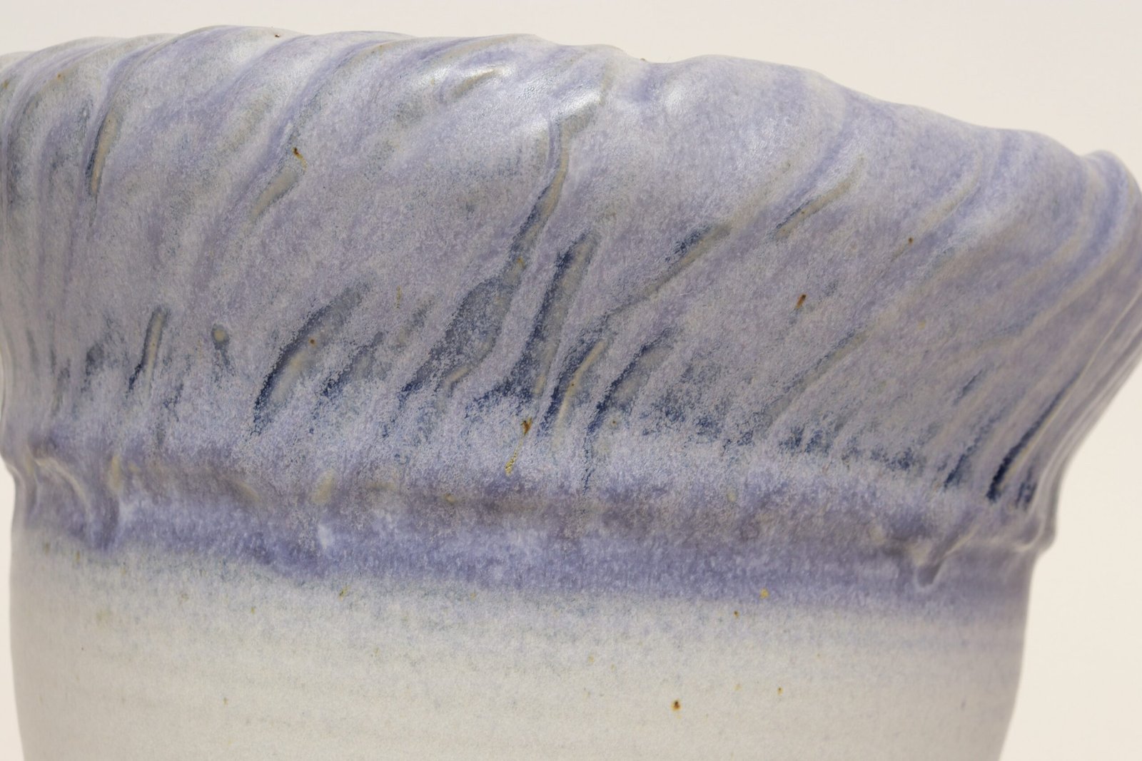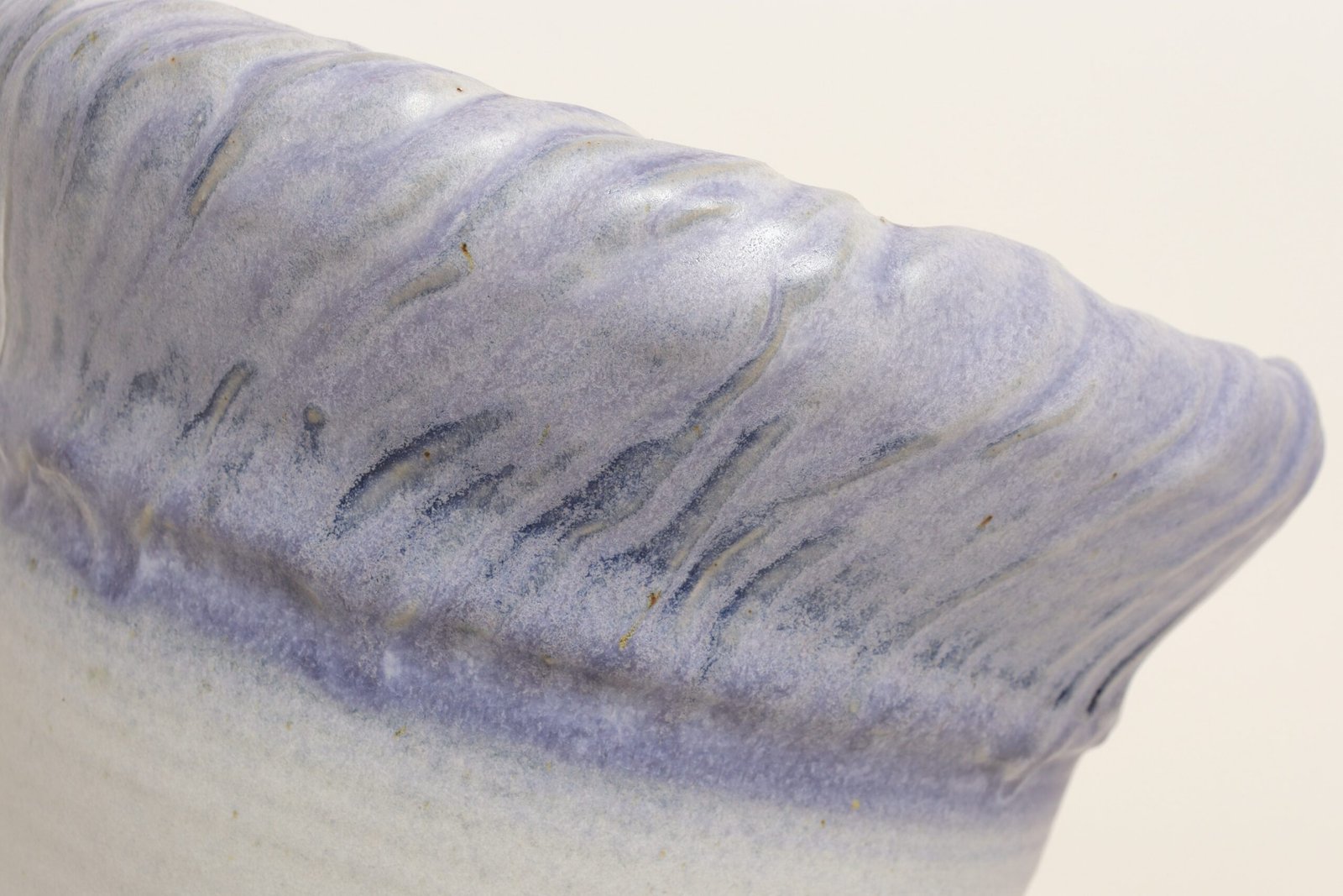 This piece dates to the early 1990s, based on the signature “D. Nichols,” which she used during that era and features a design reminiscent of the linear pattern and shape of certain sea shells. The rim decorated with incised sinuous lines protrudes out slightly from the vessel. Attractive pale gray color with lilac/periwinkle rim.