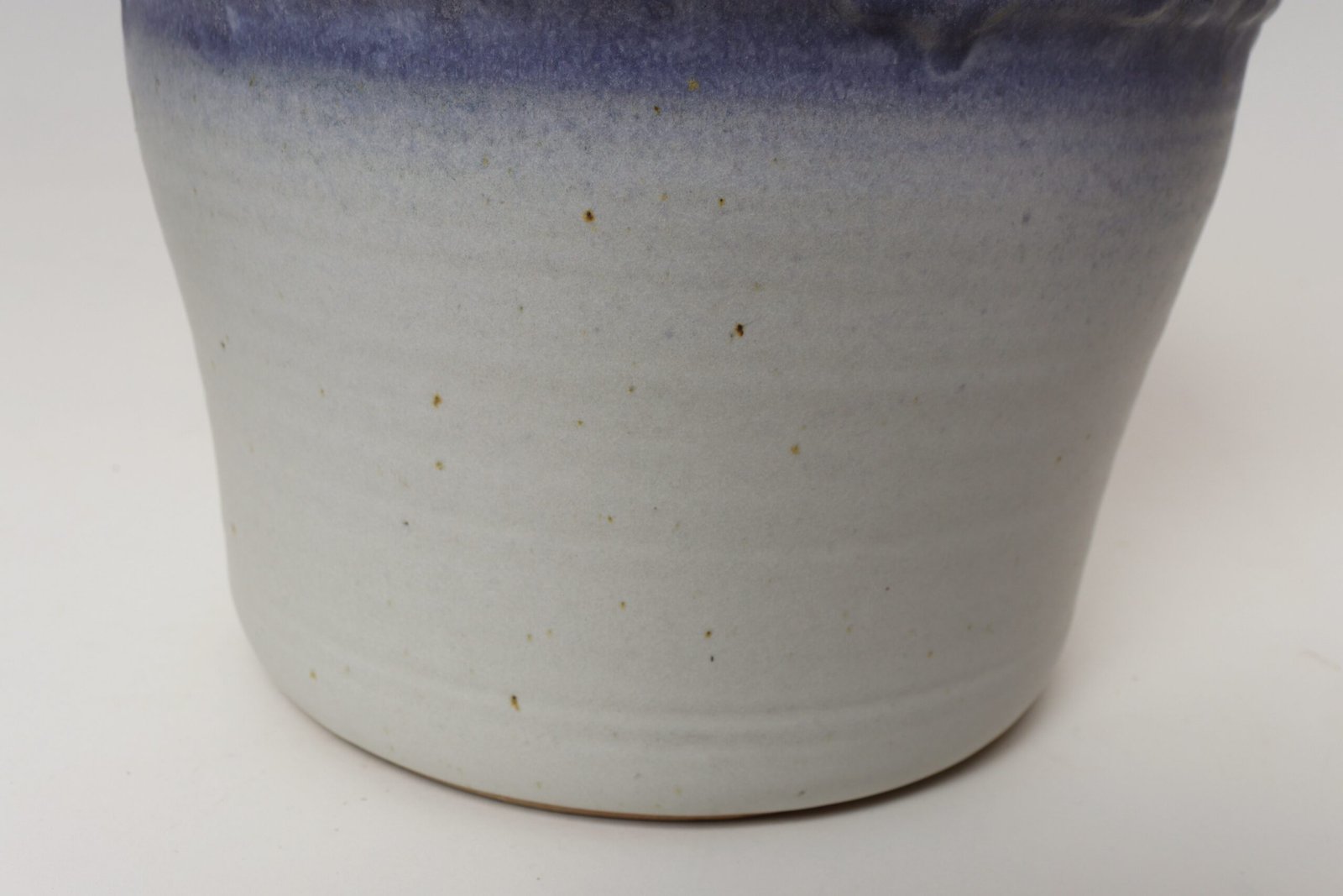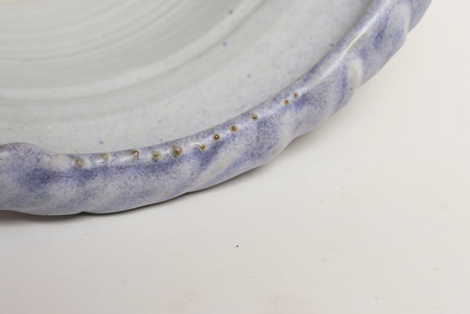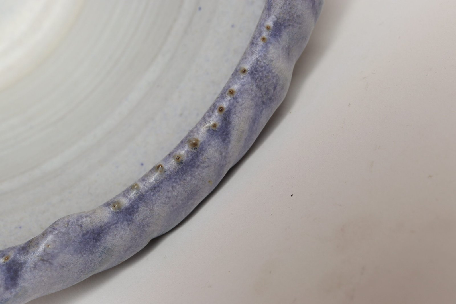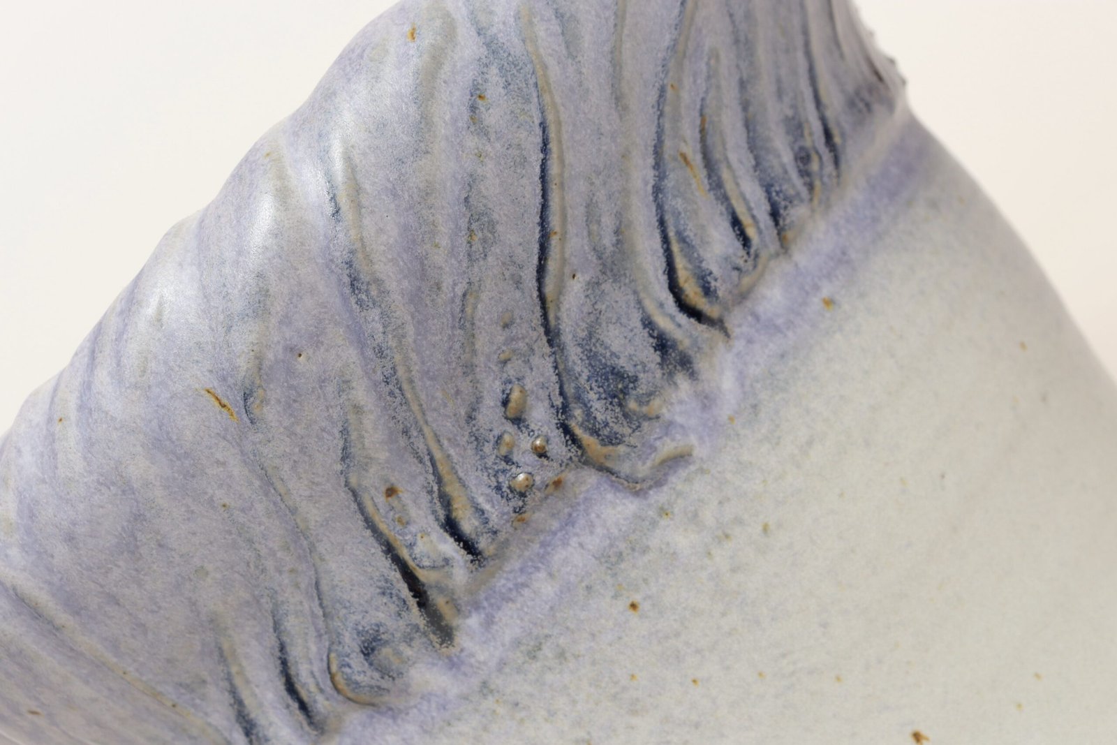 This piece dates to the early 1990s, based on the signature “D. Nichols,” which she used during that era and features a design reminiscent of the linear pattern and shape of certain sea shells. The rim decorated with incised sinuous lines protrudes out slightly from the vessel. Attractive pale gray color with lilac/periwinkle rim.